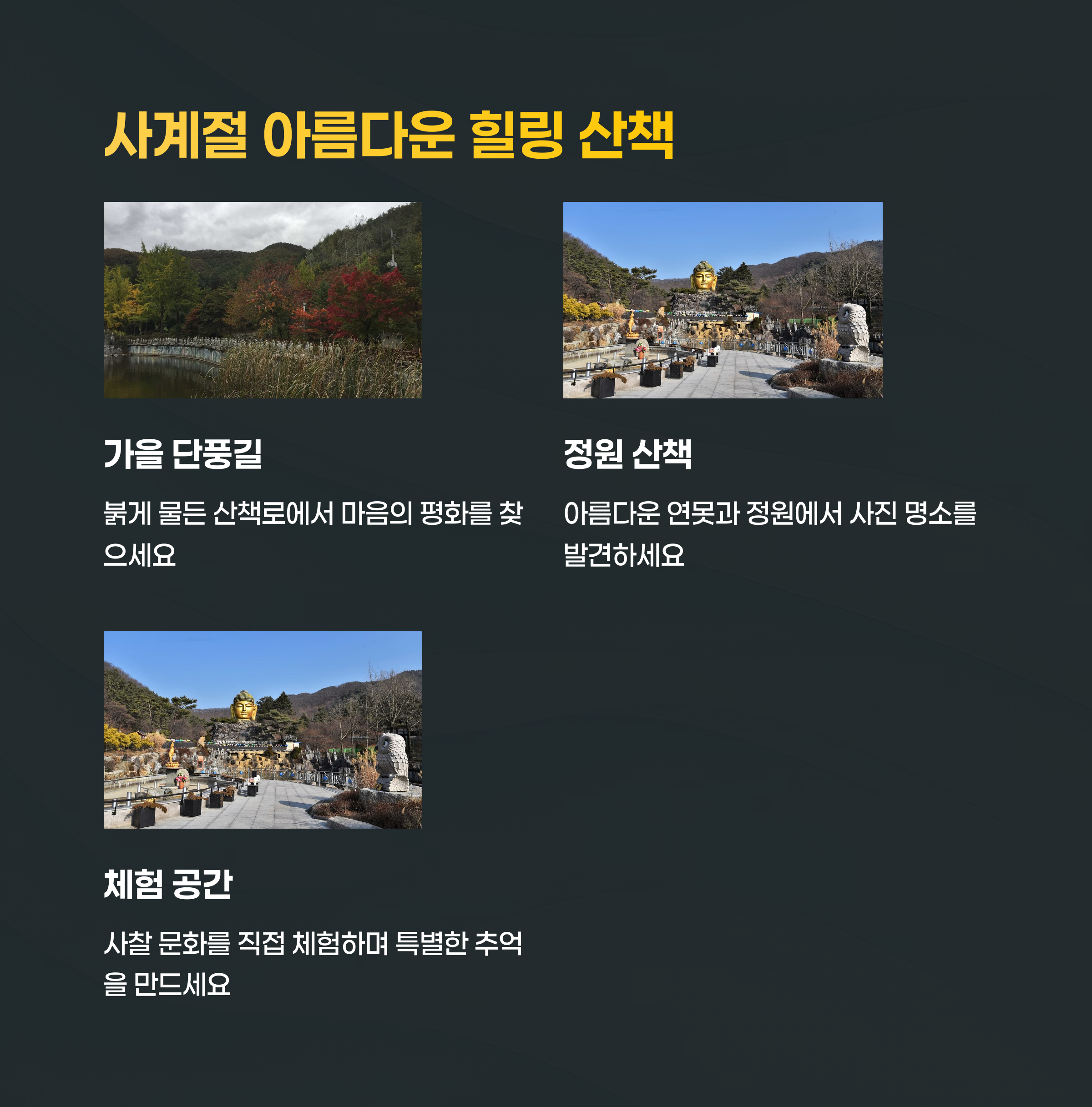 바쁜 일상 속에서 잠시나마 마음을 비우고, 자연과 조화를 이루는 공간에서 힐링하고 싶다면 용인 와우정사는 더할 나위 없이 좋은 여행지가 될 것입니다. 종교적 의미를 넘어서 문화적 가치와 예술적 감동을 동시에 느낄 수 있는 이곳은, 누구와 함께여도 만족할 수 있는 감성 여행지로 손색이 없습니다. 특히 가족, 연인, 친구와 함께라면 더욱 뜻깊은 시간을 보낼 수 있을 것입니다. 입장료도 없어 부담 없이 떠날 수 있는 숨겨진 보물 같은 장소, 꼭 한번 다녀와 보시길 추천드립니다.
