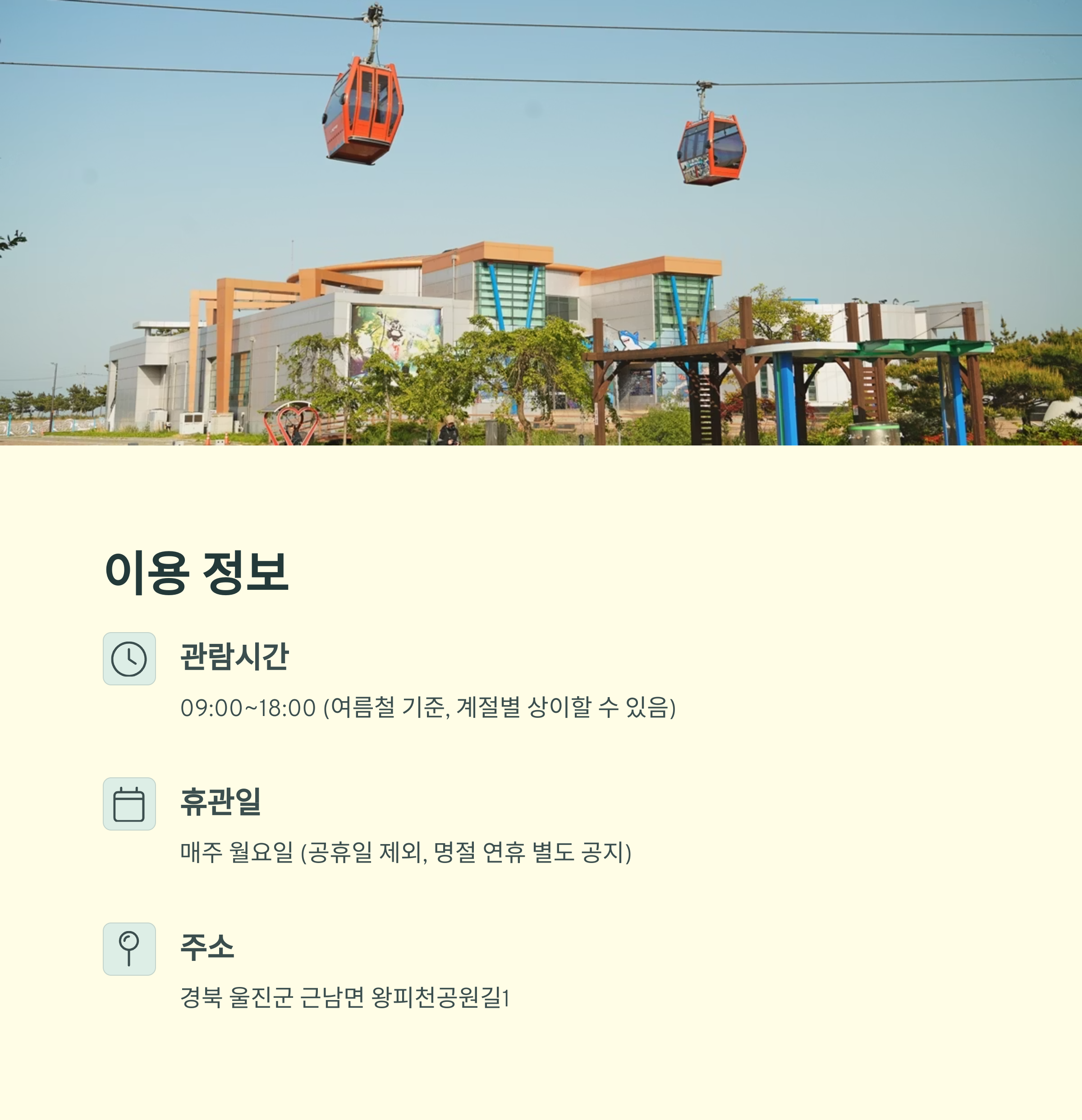 울진 아쿠아리움경북 울진군 왕피천공원 내에 위치한 동해안 대표 실내 해양 테마 관광지입니다. 초대형 수조에는 실제 동해 바다의 생태를 반영한 왕돌초 암초 지형이 재현되어 있으며, 상어, 수달, 물범, 거북이를 포함한 150여 종, 10,000여 마리 이상의 해양생물이 전시되어 있어 아이들과 함께 다양한 바다 친구들을 만날 수 있습니다. 펭귄존, 상어존, 아쿠아 갤러리다채로운 테마존이 마련되어 있으며, 수달·물범 먹이주기 체험, 아쿠아리스트 피딩타임 관람 등 직접 참여할 수 있는 체험 프로그램도 인기입니다. 실내 공간이라 날씨 영향을 받지 않고 관람이 가능하며, 트릭아트 포토존, 기념품샵, 카페 등 부대시설도 함께 갖춰져 있어 주말 가족 나들이 장소로 안성맞춤입니다. 입장료는 성인 7,000원, 어린이 5,000원으로 합리적인 가격이며, 무료 주차장도 이용 가능합니다.