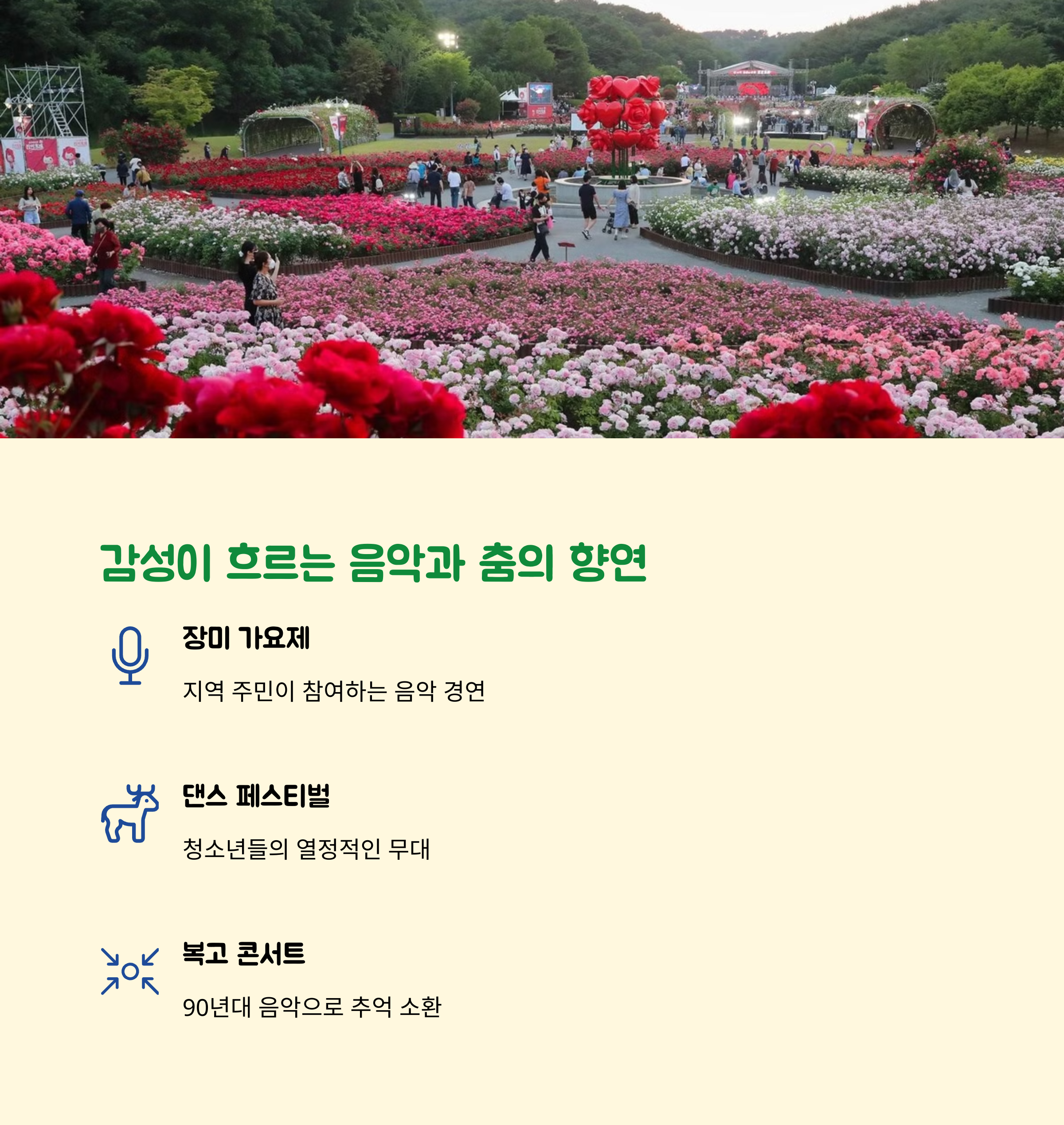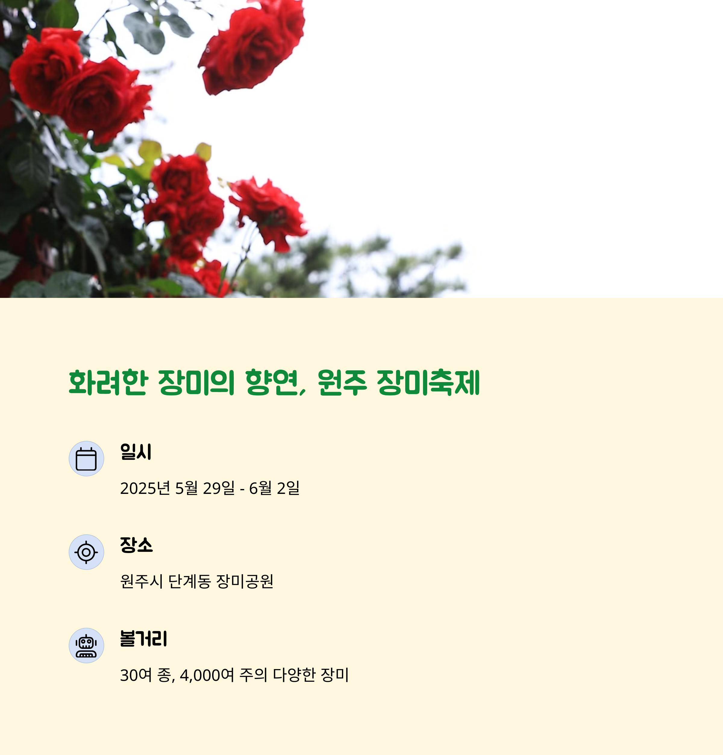 | 장미축제 일정 | 2025년 5월 29일 ~ 6월 2일 (원주 단계동 장미공원) |