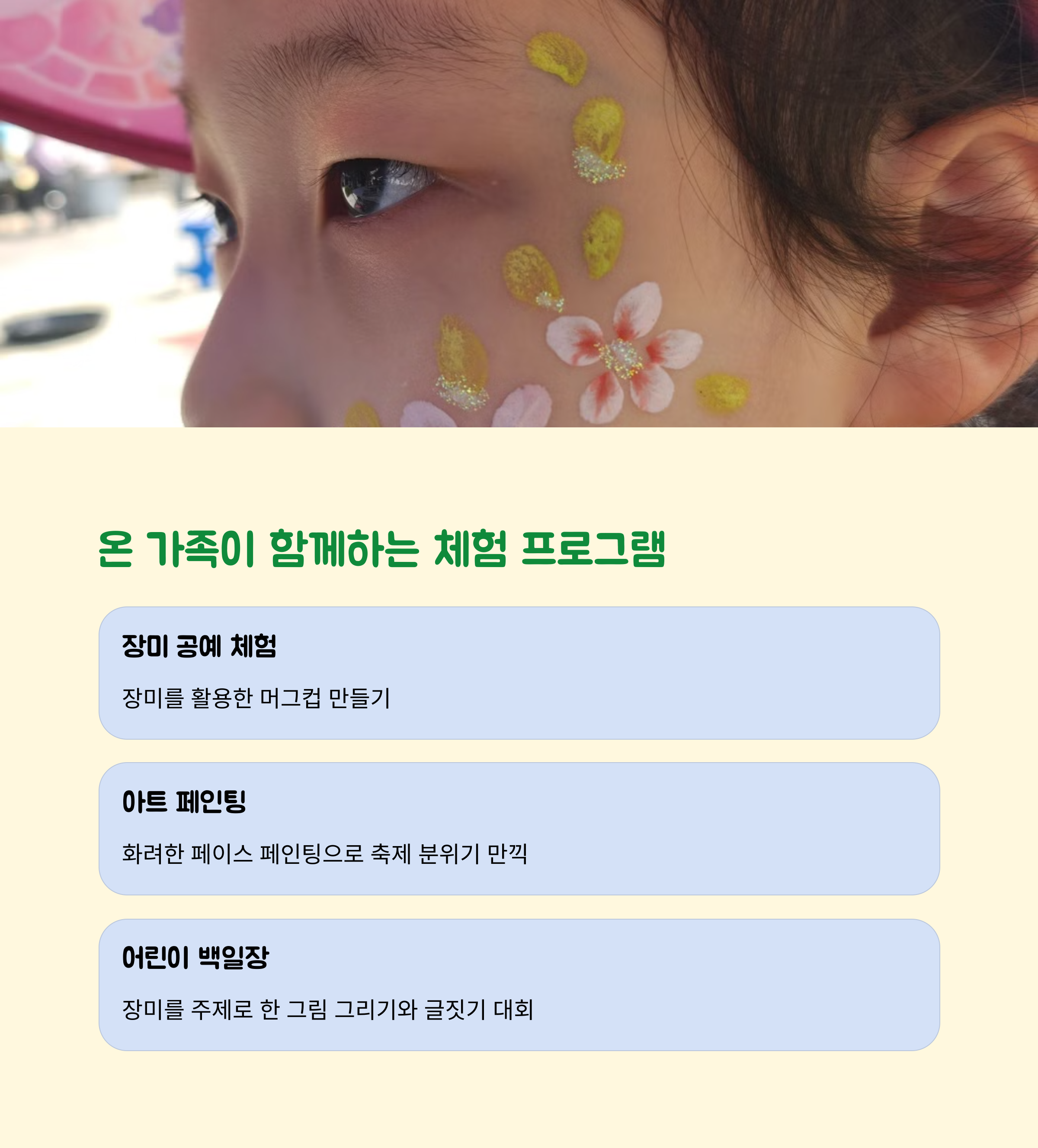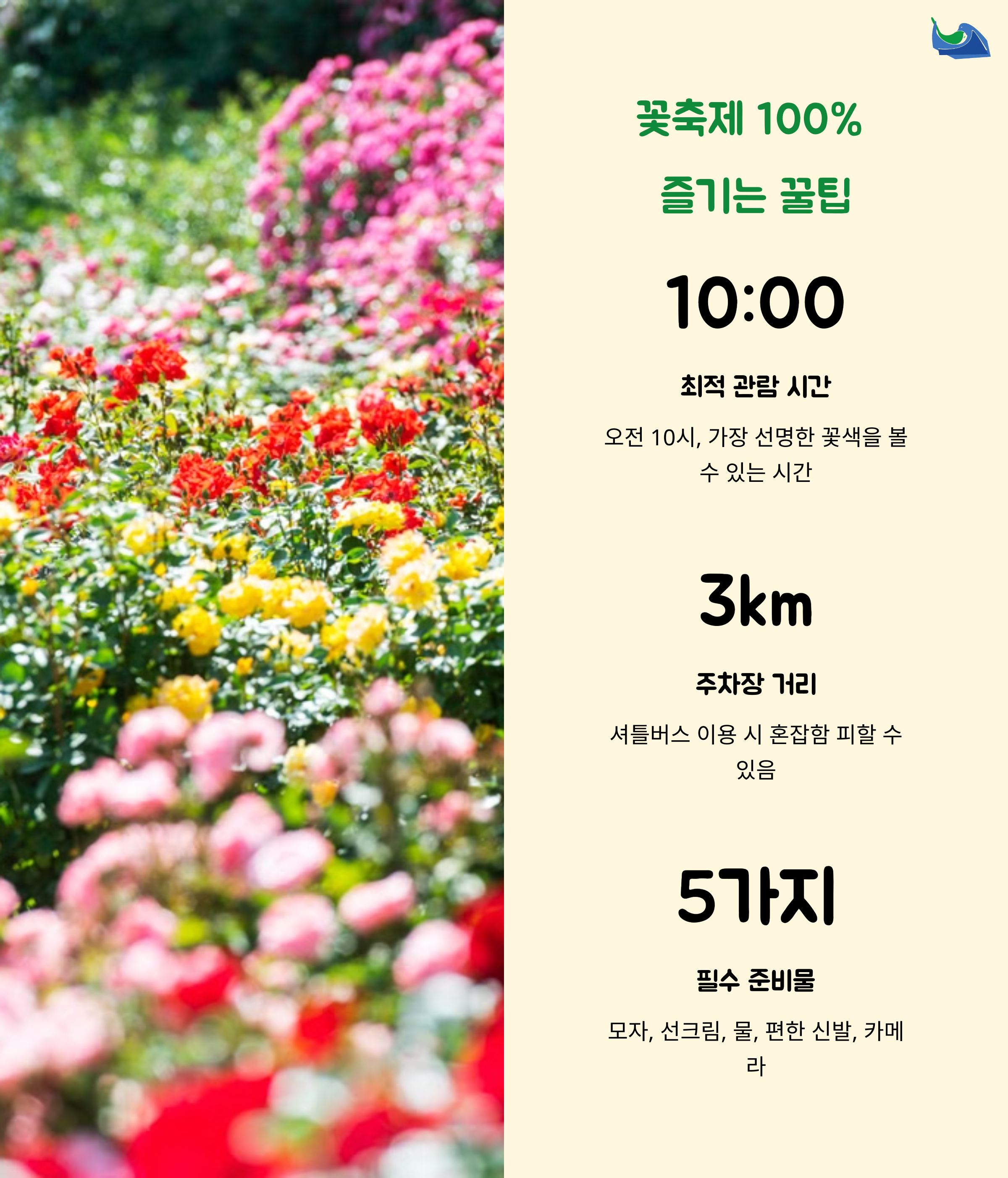 | 가족 나들이, 연인 데이트 코스로 인기 | 한적한 시골 분위기에서 꽃과 힐링 | 가족, 연인, 사진가 모두에게 추천 |