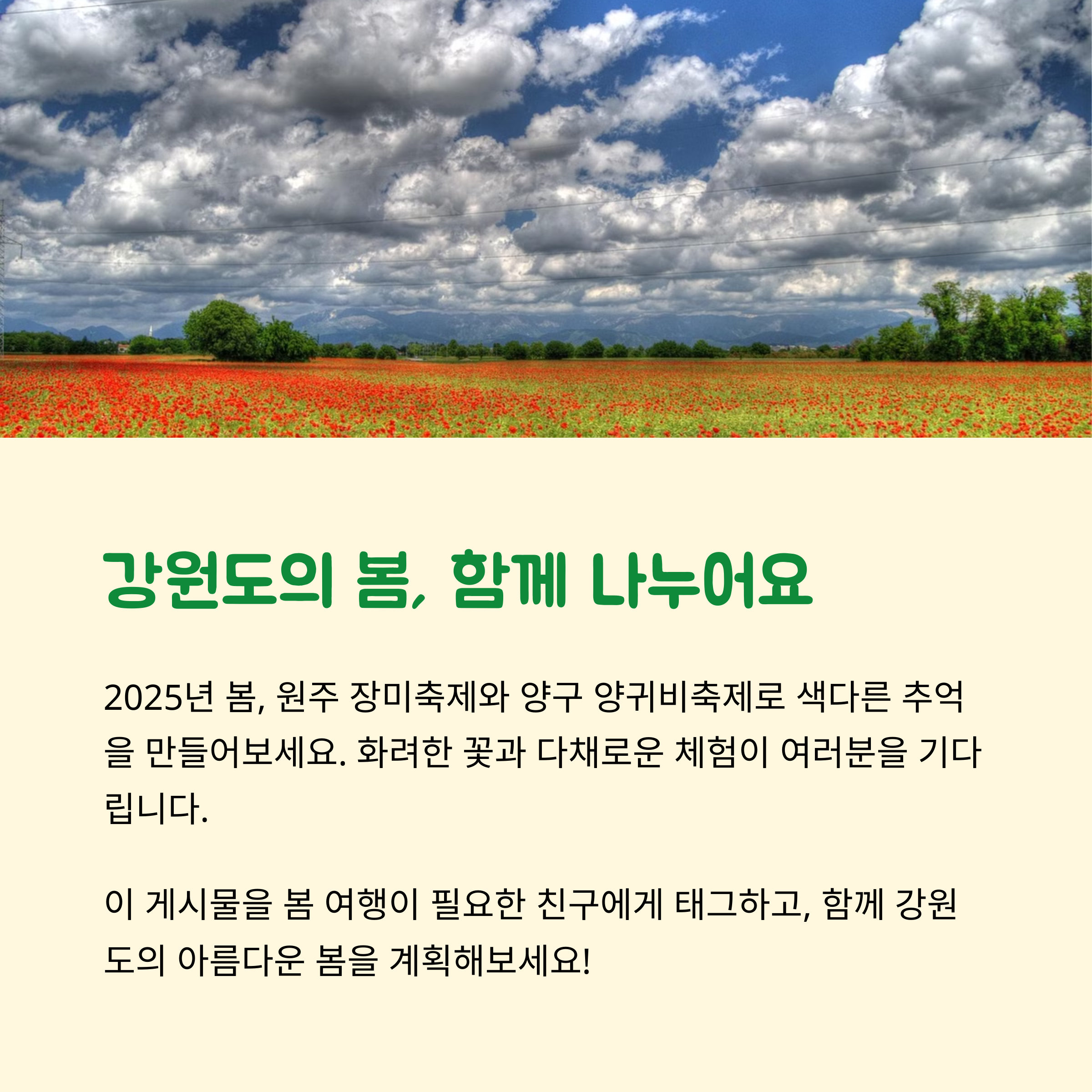 봄바람이 불어오는 계절이면 전국 곳곳에서 다채로운 꽃 축제가 열립니다. 그중에서도 강원도 원주의 장미축제와 양구의 양귀비축제는 꽃을 사랑하는 이들에게 매년 큰 기대를 받는 행사입니다. 화려한 색감과 향기, 다채로운 공연과 체험이 어우러지는 축제는 단순한 관람을 넘어 가족, 연인, 친구들과 함께 특별한 추억을 만들 수 있는 소중한 기회가 되죠. 본 글에서는 2025년 기준 최신 일정과 주요 프로그램에 대해 정리해드릴 테니, 계획적인 나들이를 원하신다면 끝까지 확인해보시길 바랍니다.