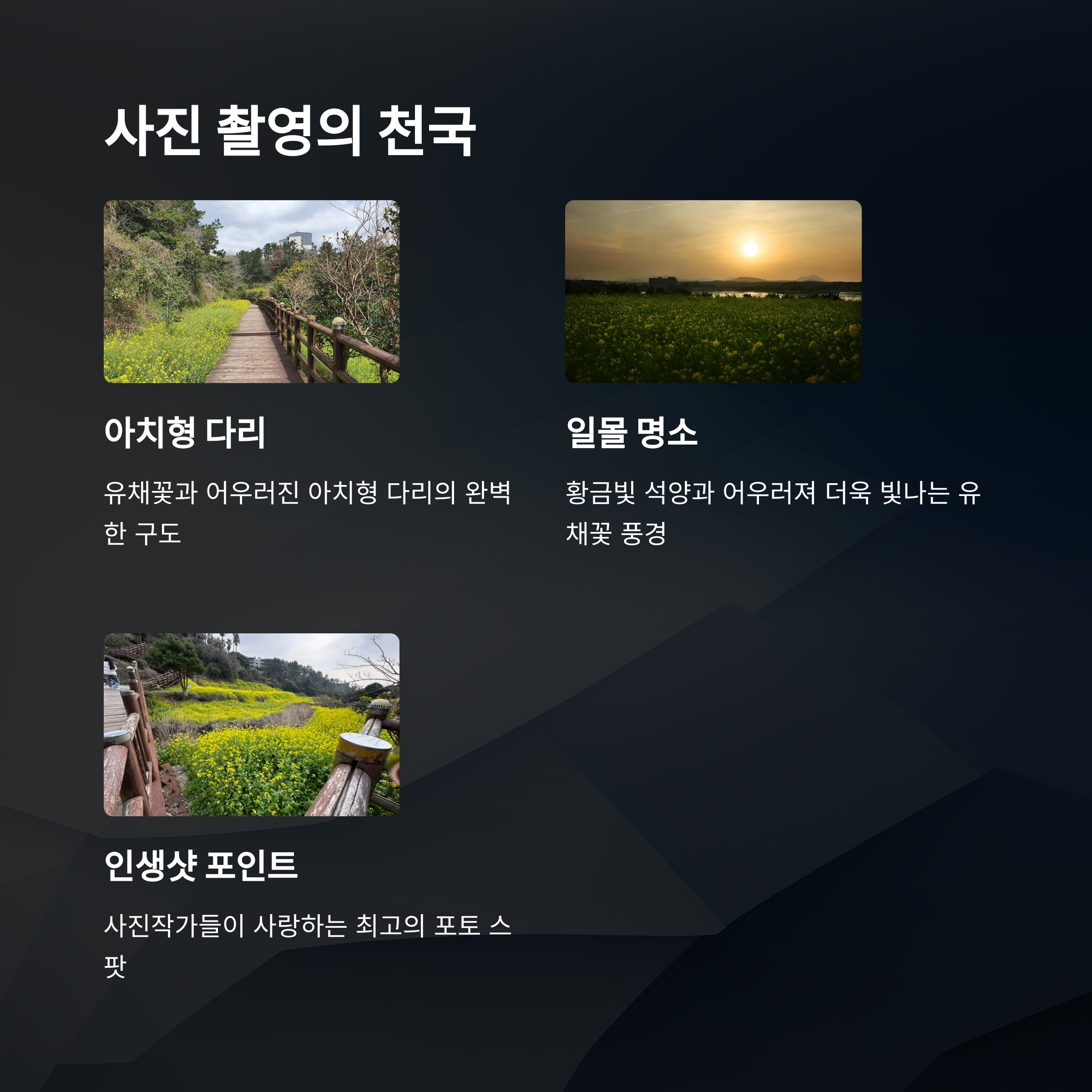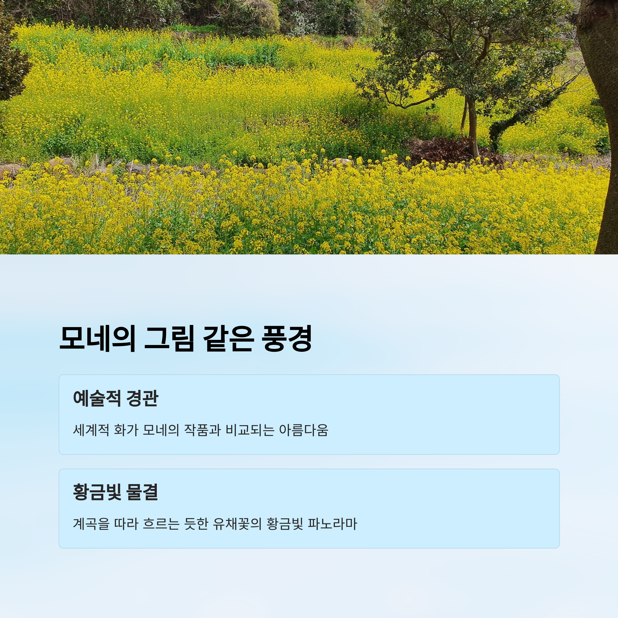 | 유채꽃 시즌 | 3월 중순 ~ 4월 초, 유채꽃이 흐드러지게 피는 절정기 |