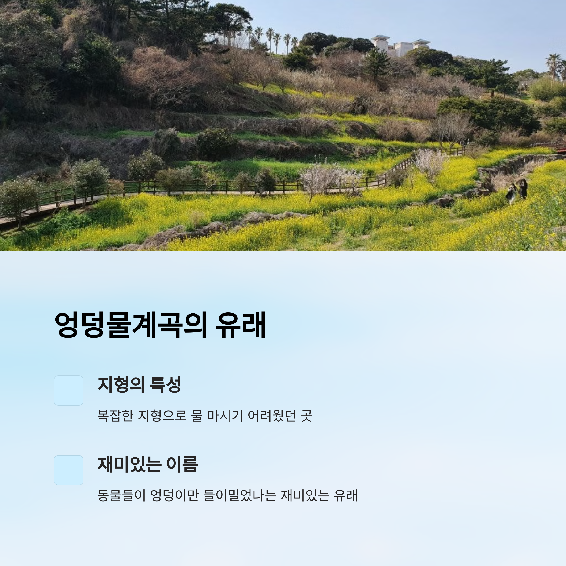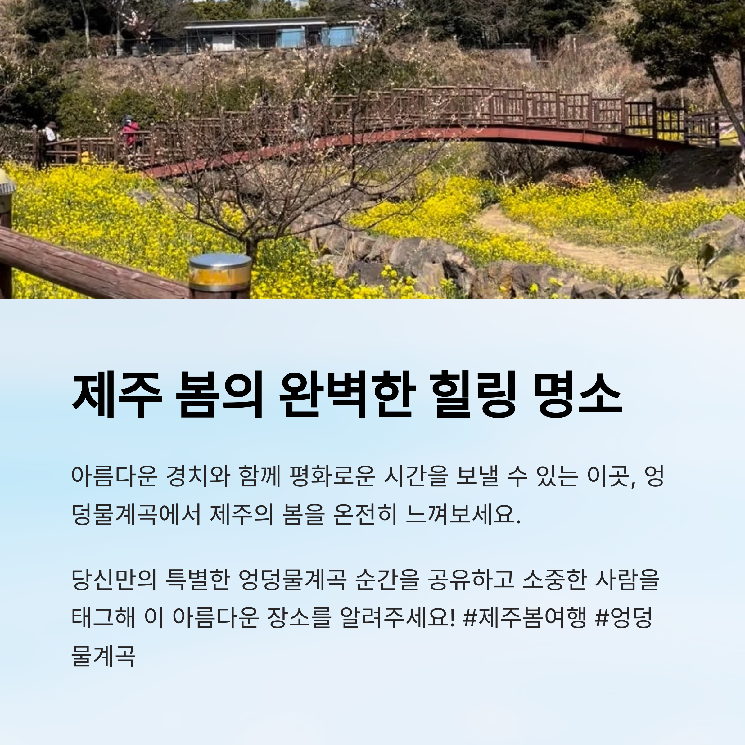 엉덩물계곡은 제주 올레 8코스와 연결되어 있어 여행자들이 코스 중간에 잠시 들러 산책하거나 풍경을 감상하기에도 좋습니다. 아치형 다리와 유채꽃이 만들어내는 프레임은 특히 사진 촬영 명소로 유명하며, 인생샷을 남기려는 사람들로 붐비기도 합니다. 꽃밭 사이로 이어진 나무 데크길을 따라 걸으며 봄의 색감을 온전히 느끼고, 사진과 감성 모두를 담아가기에 더없이 좋은 공간입니다.