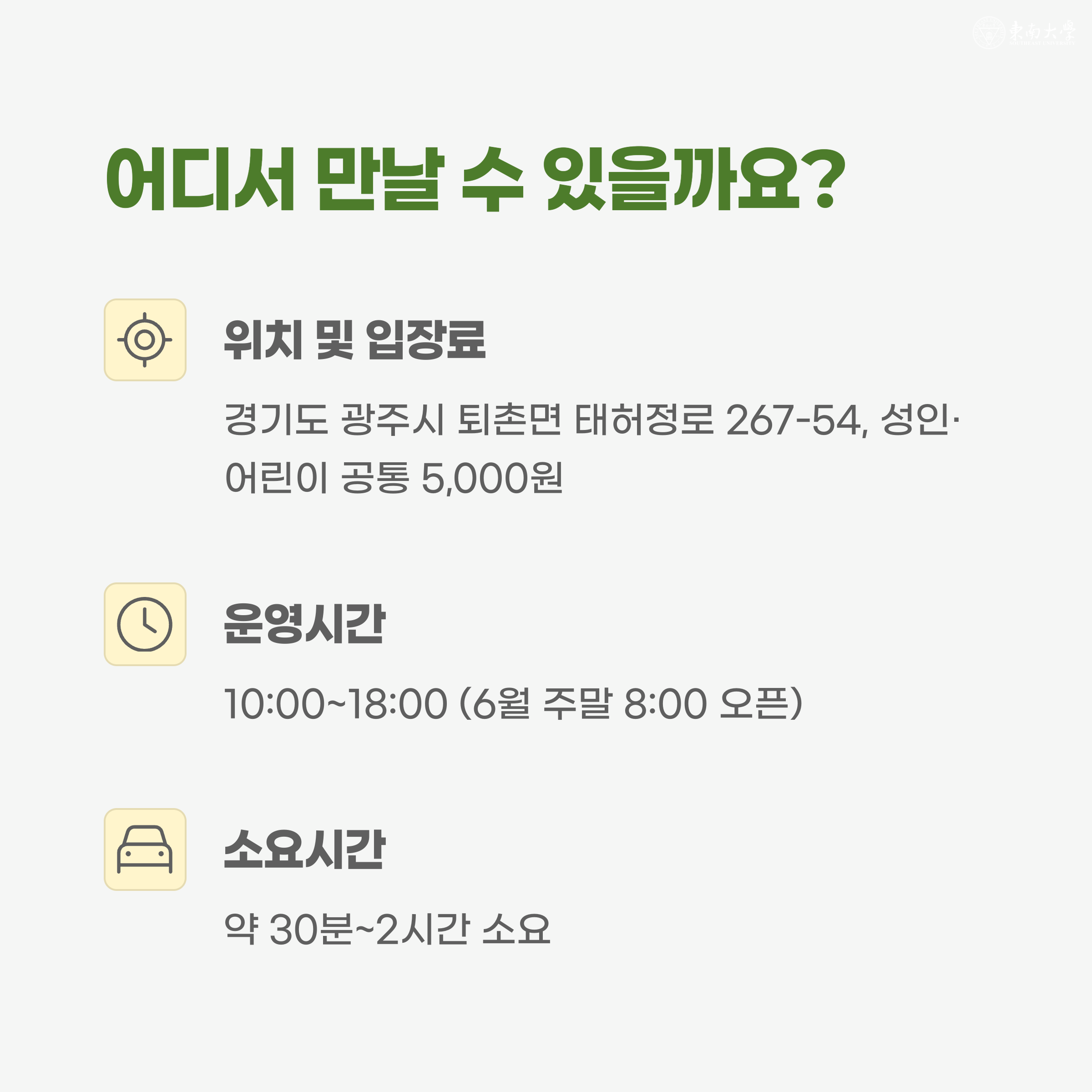 위치 및 운영 경기도 광주 퇴촌면, 입장료 5,000원, 도시락 반입 가능