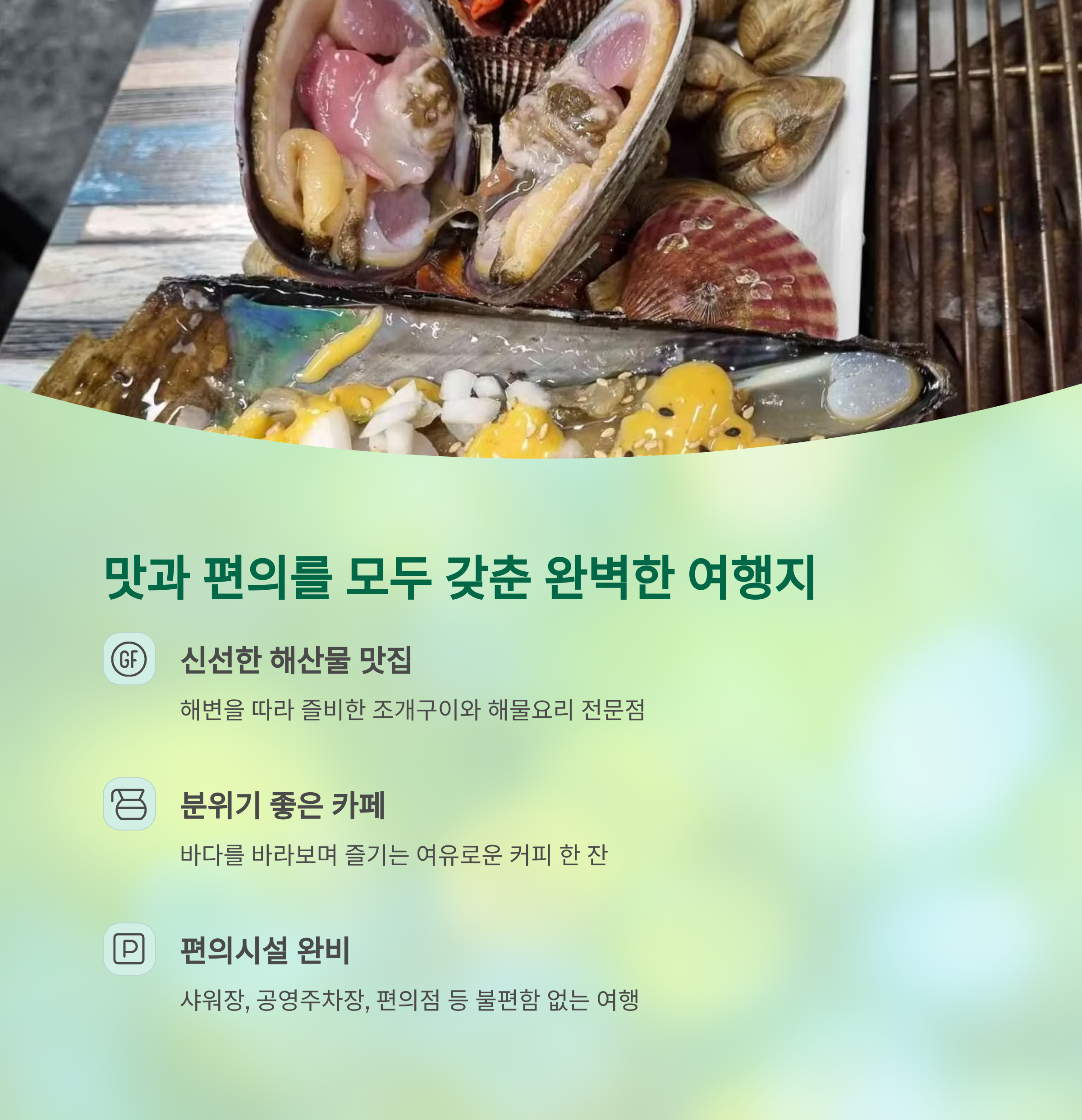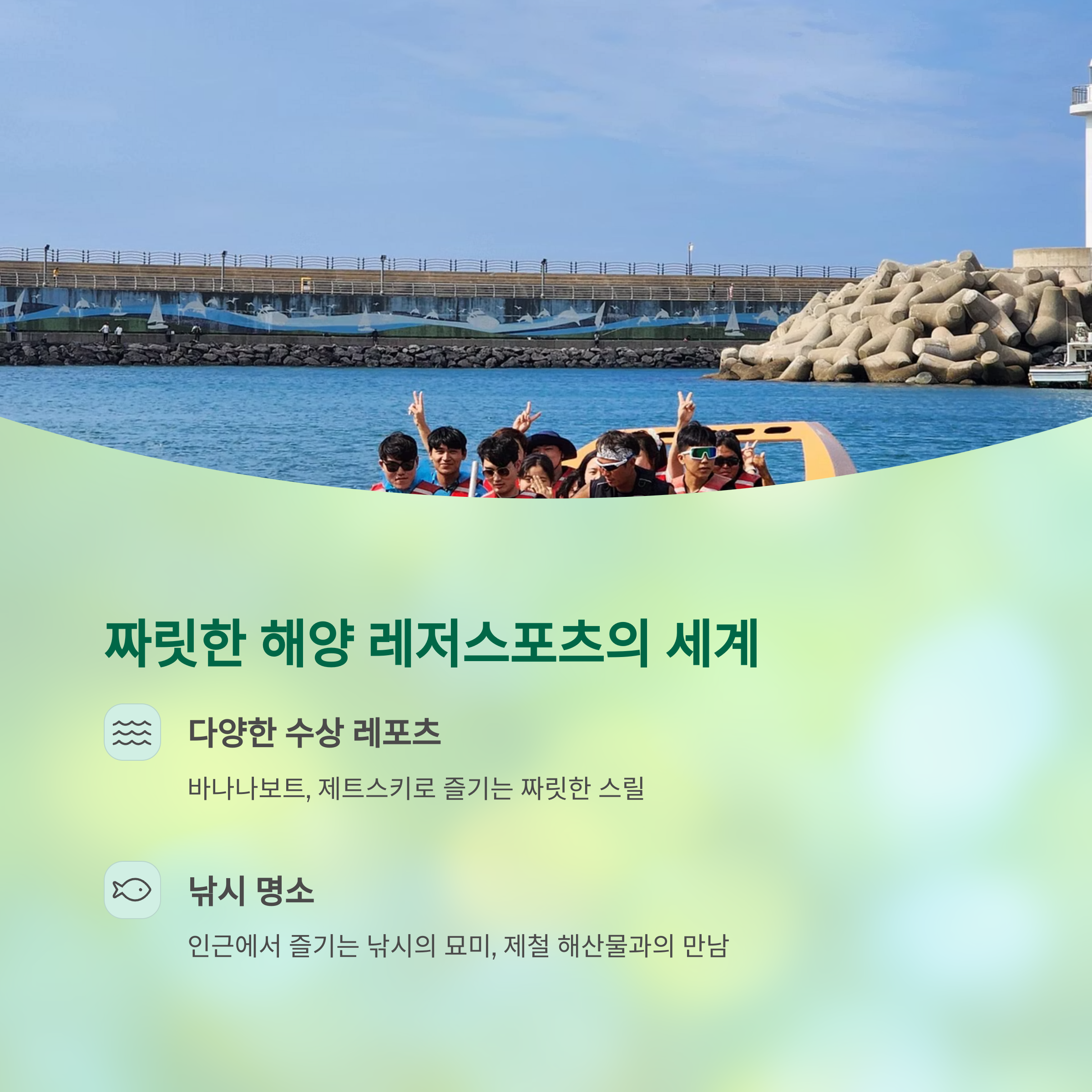 | 캠핑과 해양 스포츠 | 바닷가 캠핑과 바비큐, 바나나보트·제트스키 등 해양 액티비티 가능 |