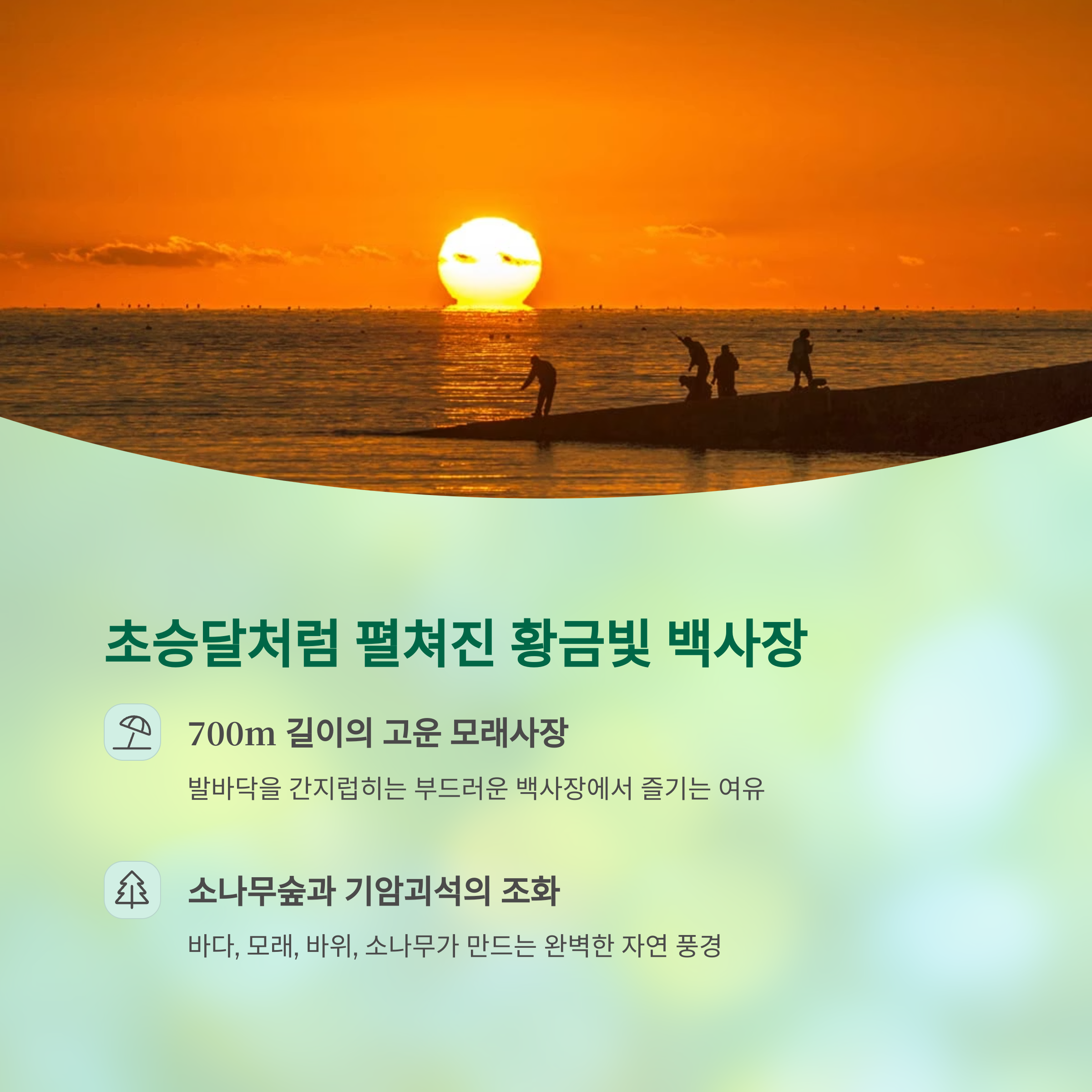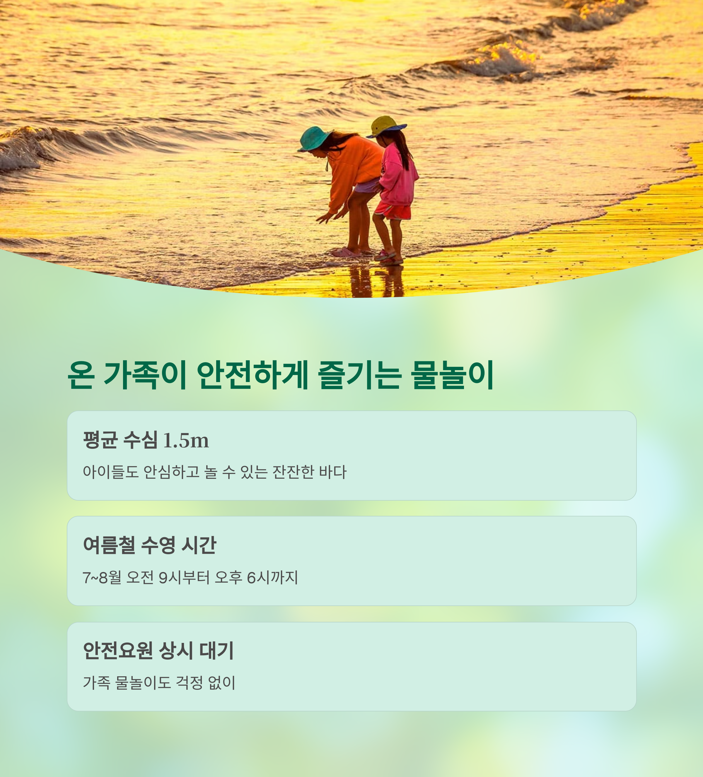 | 수영 가능 해변 | 평균 수심 1.5m의 잔잔한 바다에서 여름철 수영 가능(9시~18시) |