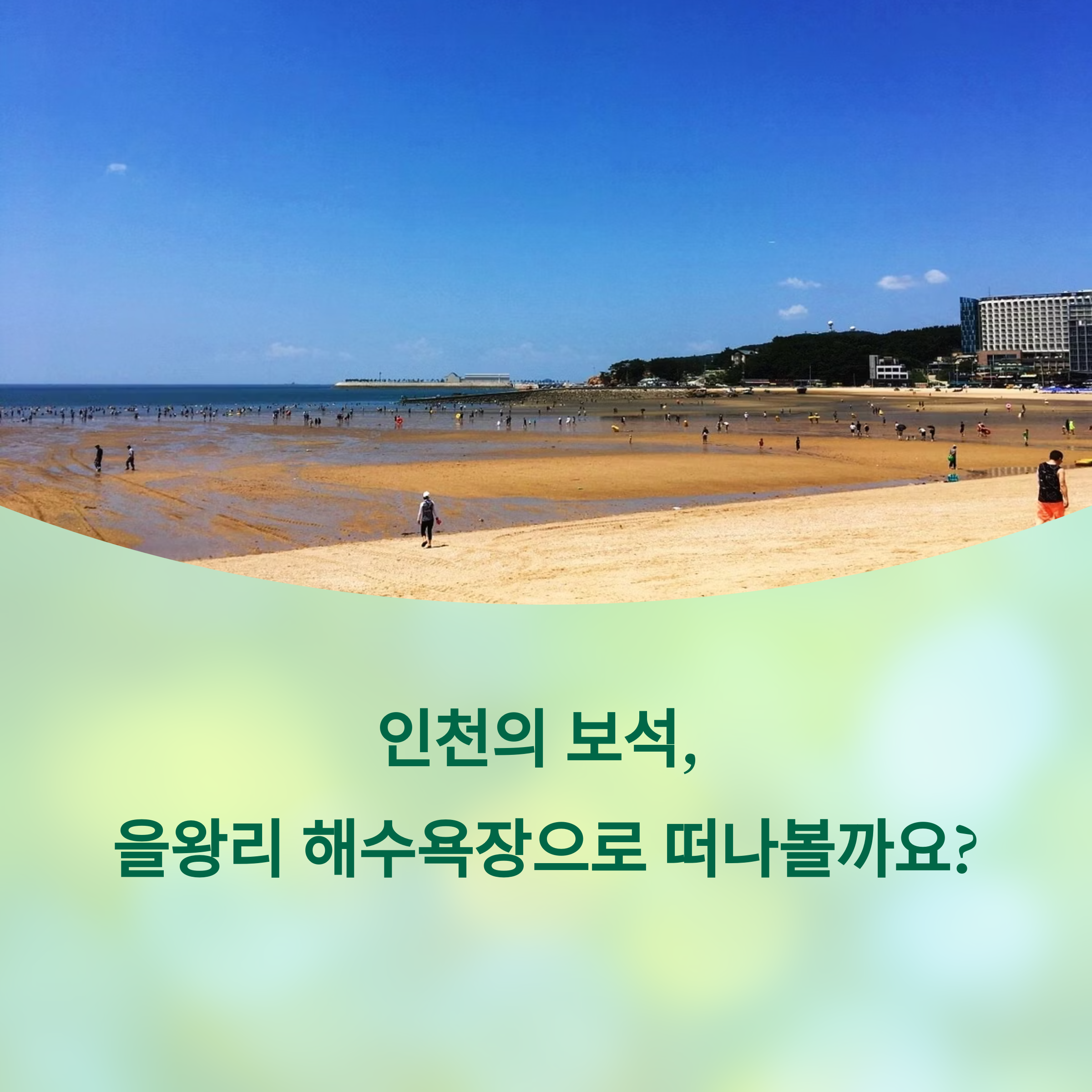 서해 바다의 낭만을 온몸으로 느낄 수 있는 인천의 대표 해변, 을왕리 해수욕장. 수영, 캠핑, 해양 스포츠, 맛집 탐방, 일몰 감상까지 모든 요소가 완벽히 조화를 이루는 이곳은 여름뿐만 아니라 사계절 언제든 당일치기 또는 1박 2일 여행지로 적극 추천드립니다.