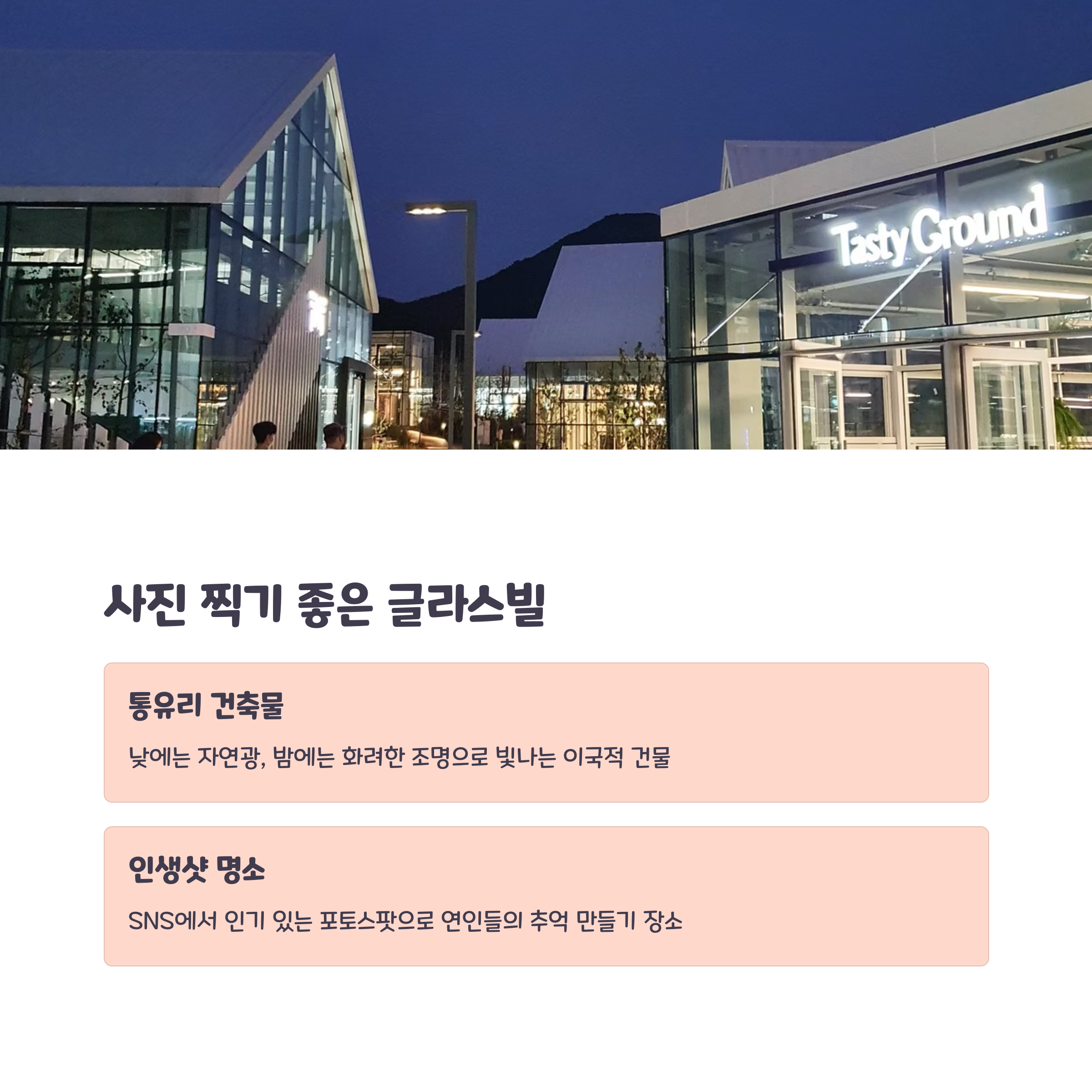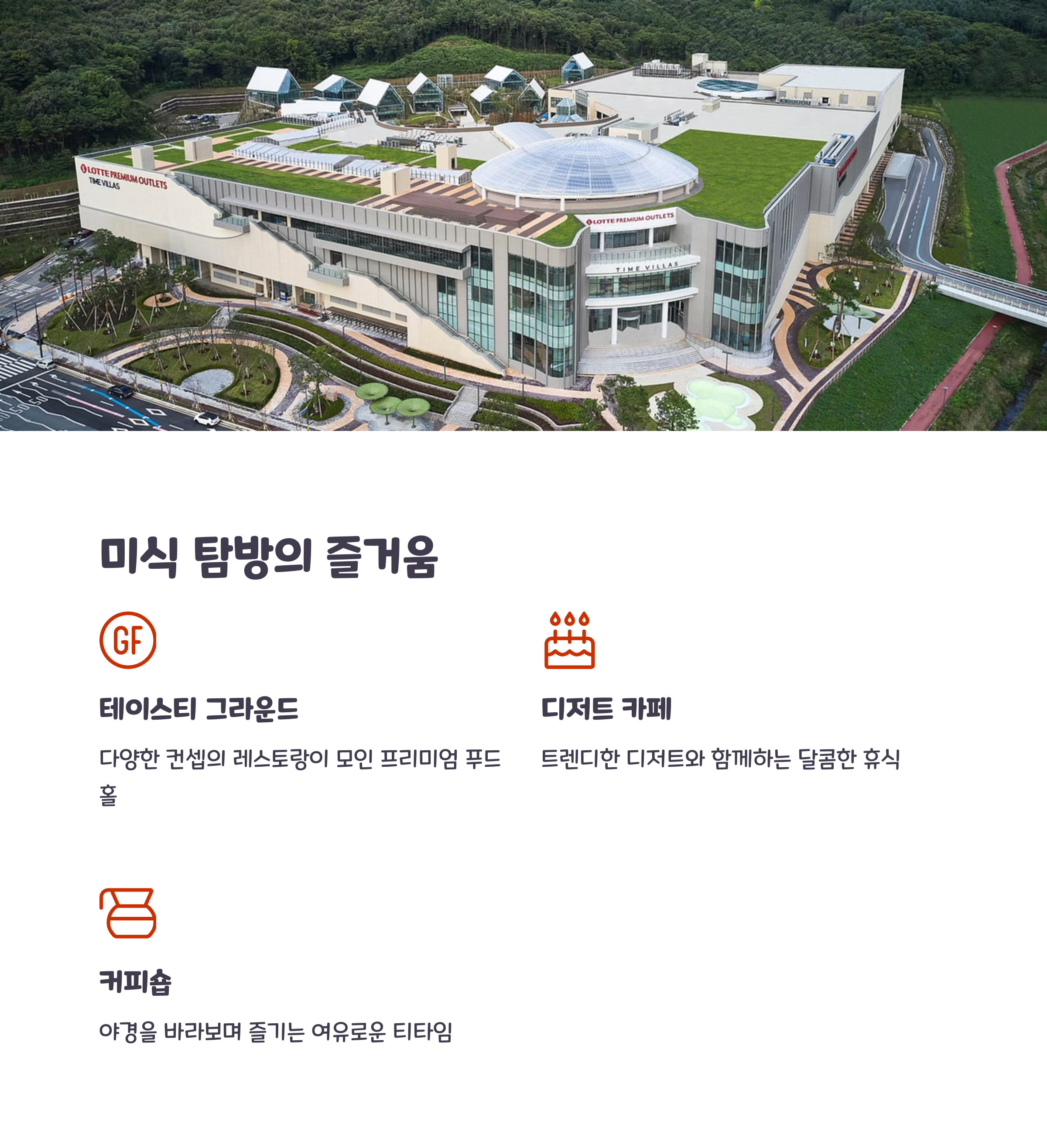 롯데타임빌라스에는 감각적인 디자인의 건물들이 곳곳에 자리잡고 있어 사진 찍기 좋은 포인트가 많습니다. 내부에는 다양한 맛집과 디저트 카페가 입점해 있어 데이트 중간중간 허기진 배를 채우기에도 충분합니다. 글라스빌에서는 식사 후 감성 있는 조명 아래 커피 한 잔의 여유를 즐길 수 있으며, 쇼핑과 휴식을 함께 즐기기에 더없이 좋은 곳이죠. 다만 일부 매장의 음식 가격은 다소 높게 느껴질 수 있으니 참고해 주세요.