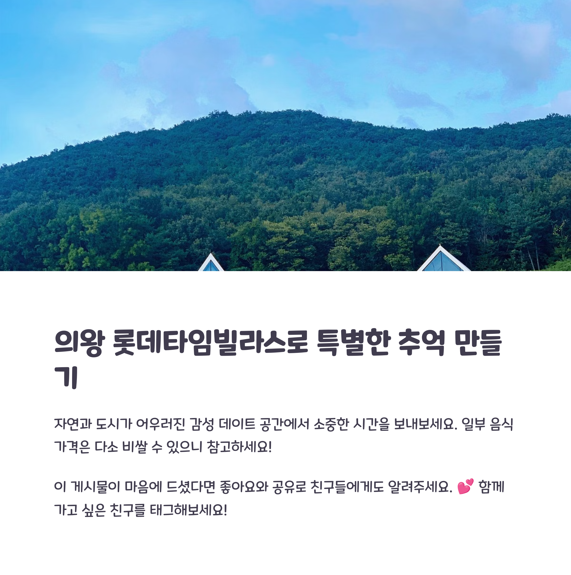 롯데타임빌라스에 다녀오신 경험이 있다면 기억에 남는 장소나 음식, 분위기를 공유해 주세요! 다른 분들께도 유용한 정보가 될 수 있답니다.