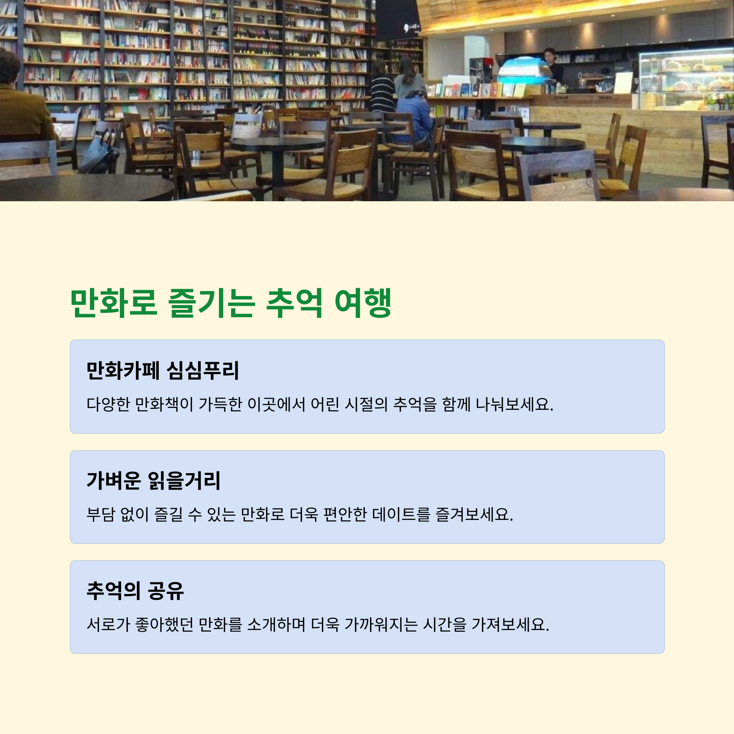 온천 후 방문하기 좋은 이천 북카페는 조용하고 아늑한 분위기에서 서로의 대화를 나누기 좋은 장소입니다. 이천 시내에는 다양한 테마의 북카페가 있으며, 그중 이천온천공원 내에 위치한 평생학습북카페는 넓고 쾌적한 공간으로 많은 연인들이 찾는 명소입니다. 커피와 함께 책을 읽거나 각자의 시간을 보내며 자연스레 힐링되는 기분을 느낄 수 있죠. 또한 만화카페 '심심푸리'는 다양한 장르의 만화책과 간단한 먹거리까지 함께 즐길 수 있어, 조금 더 캐주얼한 분위기를 원할 때 선택하기 좋은 장소입니다.