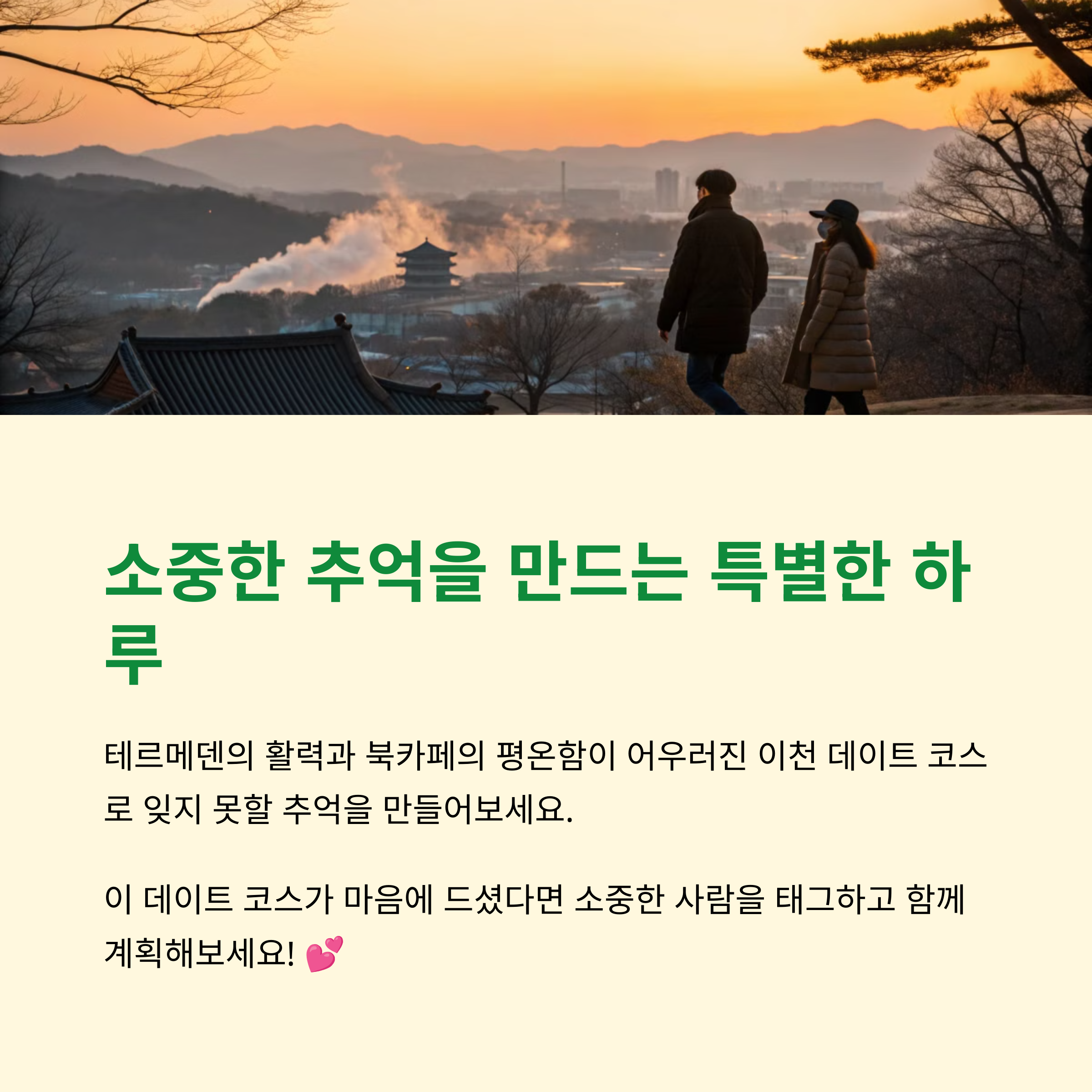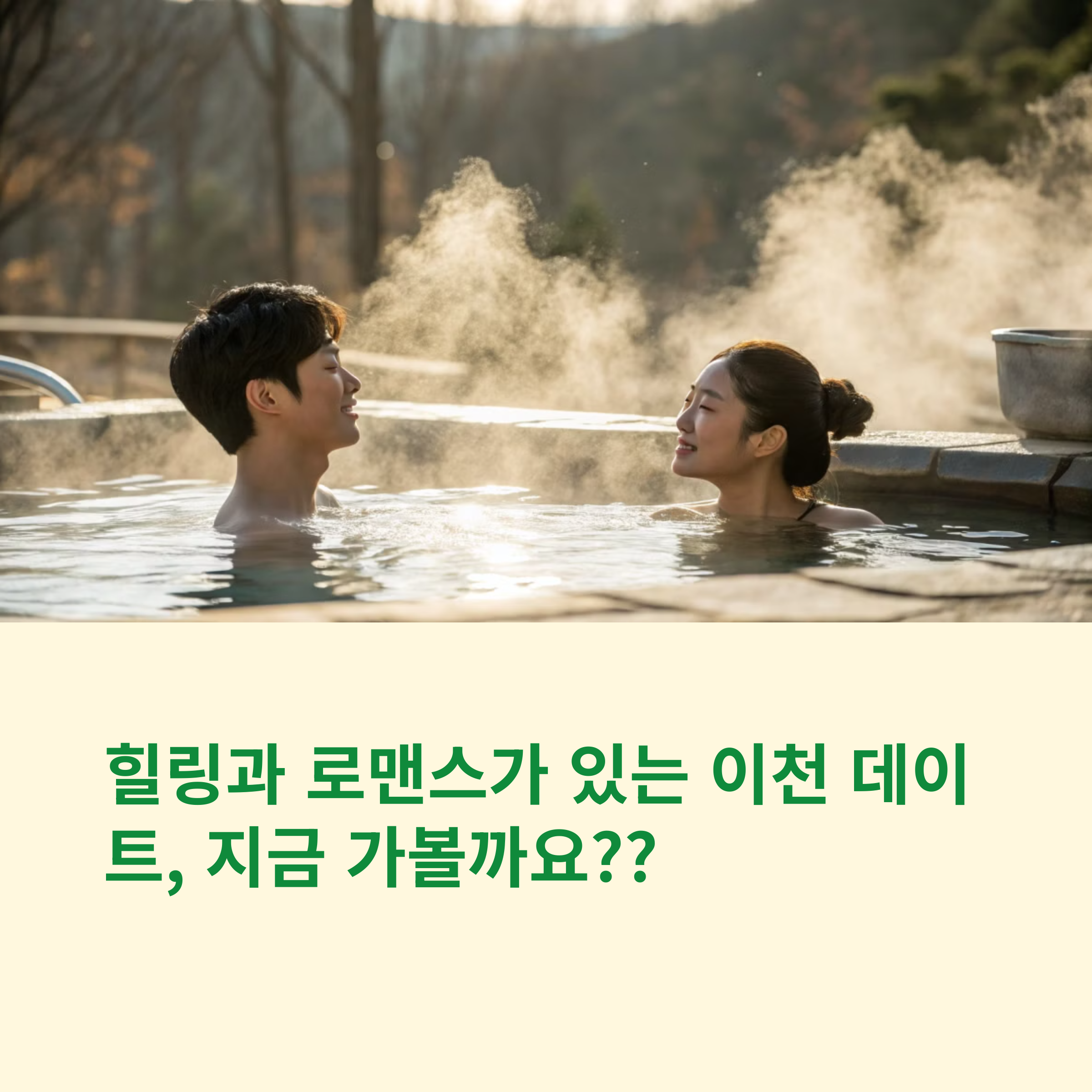 이천은 가까운 거리에서 온천과 문화, 자연, 예술을 모두 경험할 수 있는 완성도 높은 데이트 코스를 제공합니다. 따뜻한 물에 몸을 맡기고 북카페에서 마음을 쉬는 시간은 서로의 소중함을 다시금 느끼게 해주며, 도심 속 스트레스를 잠시나마 잊게 만듭니다. 테르메덴의 스파, 북카페의 감성, 커피 한잔의 여유가 어우러진 이번 여행은 분명 기억에 남을 힐링이 될 것입니다.