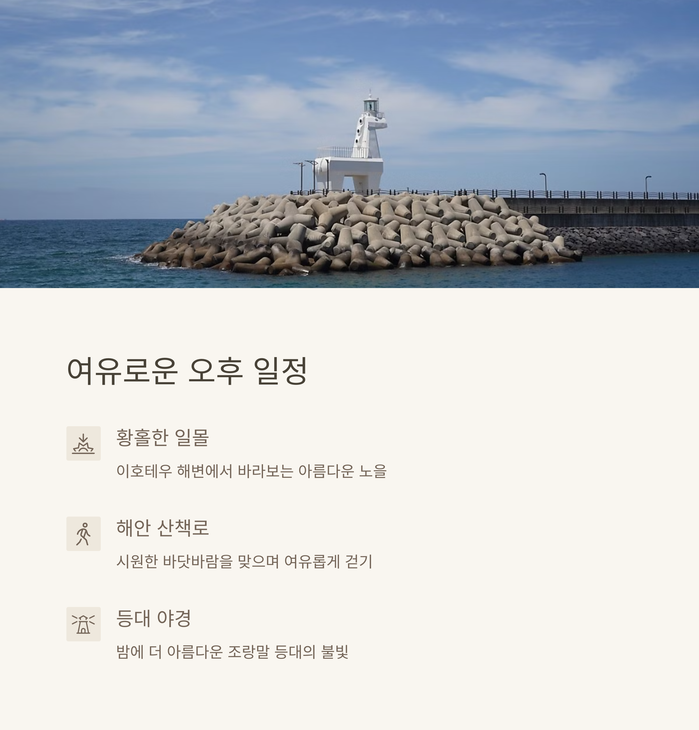 제주 여행의 마무리는 여유롭고 감성적으로 마무리하는 것이 좋습니다. 이호테우 해변은 일몰이 아름답기로 유명한 곳 중 하나로, 바다 너머로 지는 태양을 바라보며 하루의 여운을 느낄 수 있습니다. 또는 숙성도 식사 후 가까운 도심 거리나 바닷가를 산책하며 제주의 일상적인 풍경을 천천히 느껴보는 것도 또 다른 즐거움입니다. 특별한 계획 없이도 힐링과 만족감을 동시에 주는 하루 코스로 강력히 추천드립니다.