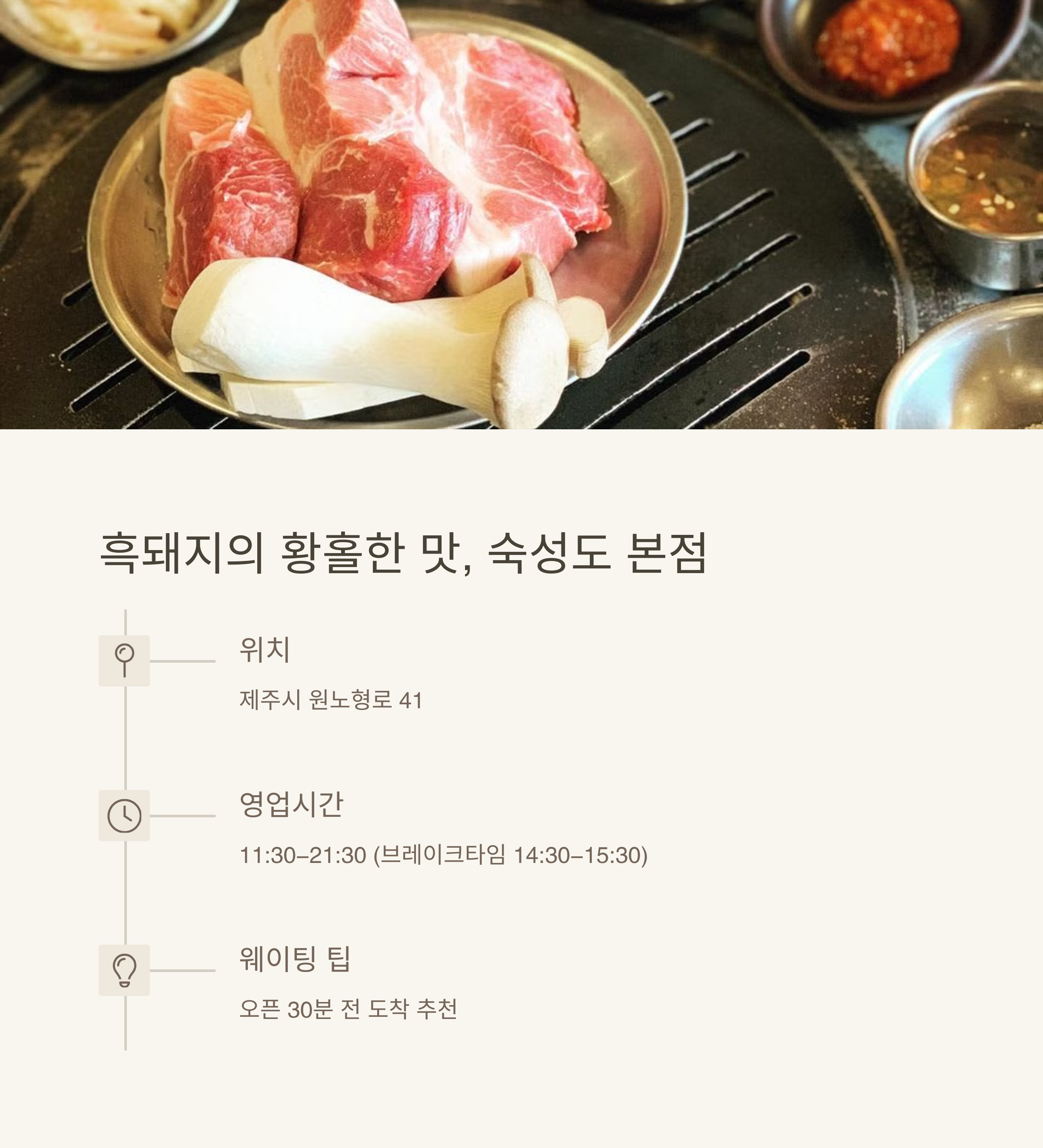 오전을 해변에서 여유롭게 보냈다면, 점심은 숙성도 본점에서 특별하게 즐겨보세요. 제주 흑돼지의 깊은 풍미를 느낄 수 있는 이곳은 현지인뿐만 아니라 관광객들에게도 큰 인기를 끌고 있는 대표 고깃집입니다. 숙성 흑뼈등심, 뼈목살 등 특별한 메뉴는 육즙과 식감 모두 뛰어나며, 식당 내부도 깔끔하고 쾌적해 편안한 식사를 즐길 수 있습니다. 다만 웨이팅이 긴 경우가 많으니 미리 대기 등록을 하거나 여유 있는 시간대를 선택하는 것이 좋습니다.