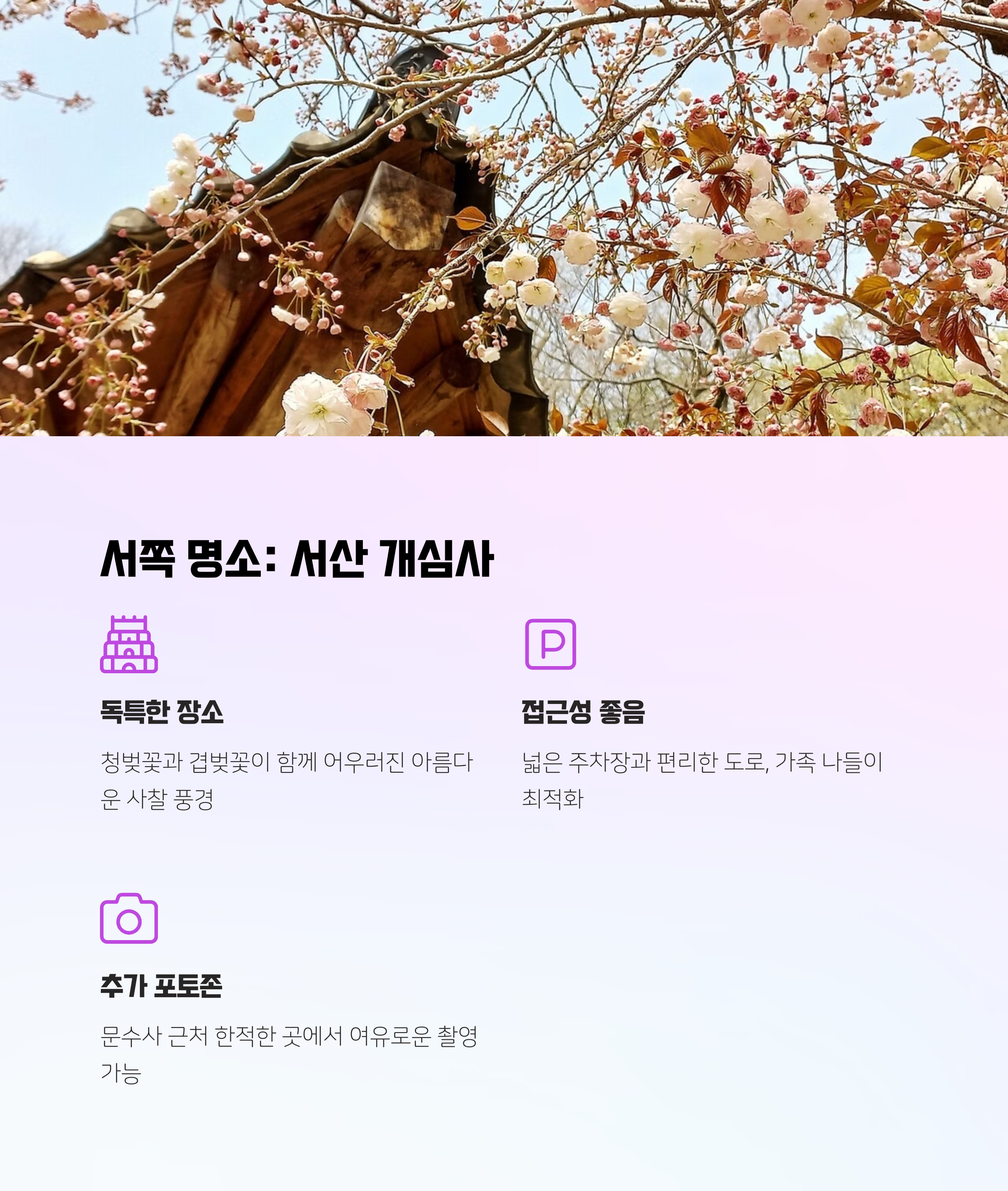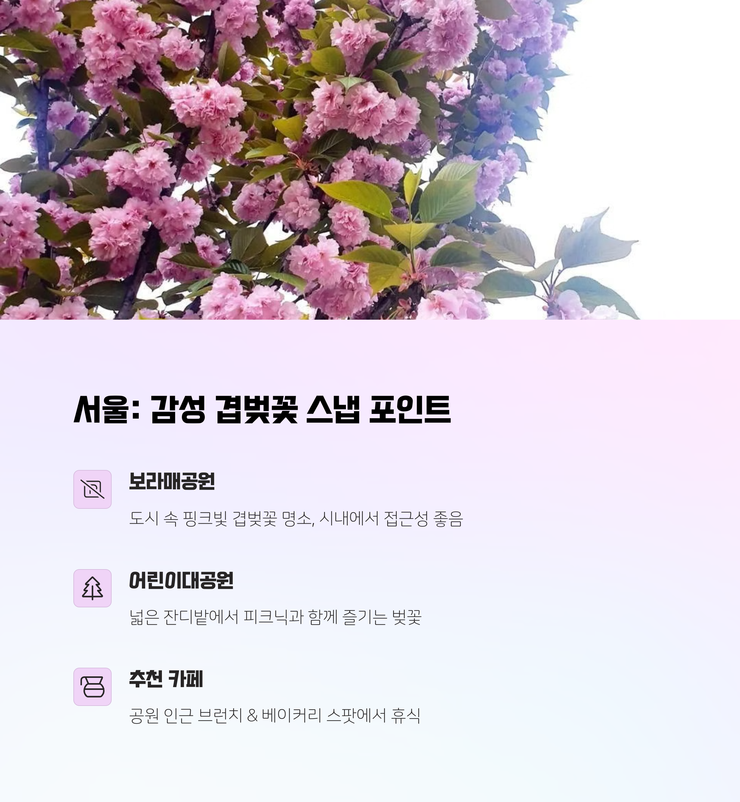 | 주말 오전 방문 추천! 붐비기 전 여유롭게 즐겨보세요. | 겹벚꽃 아래 디저트와 커피, 자연스러운 인증샷 완성! | 대전, 천안 등 지방 소도시에도 숨은 겹벚꽃 카페 많아요. |