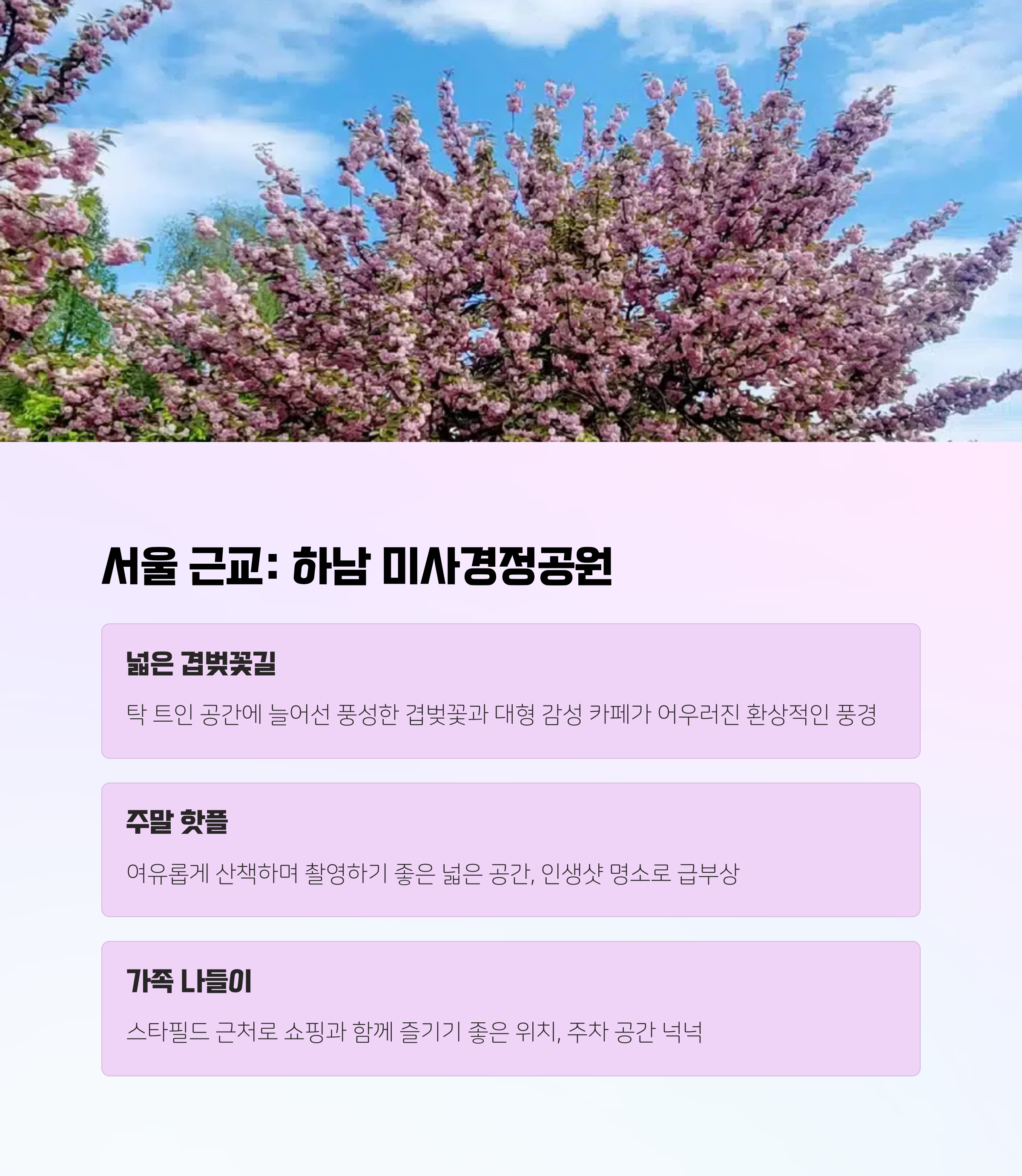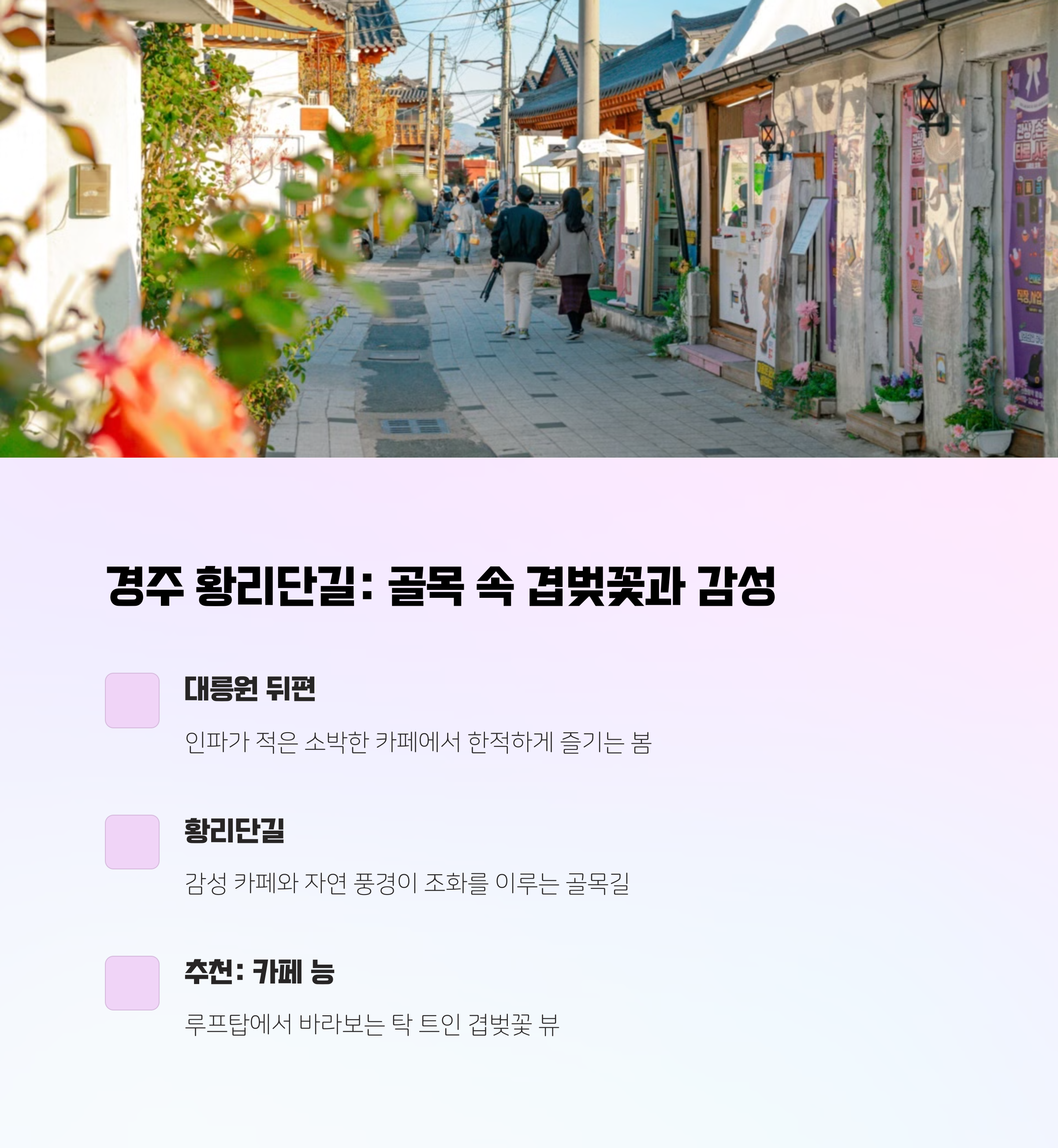 | 미사경정공원 주변 대형 유리창, 루프탑 카페 추천! | 대릉원 뒷길 겹벚꽃길과 한옥 감성 카페가 잘 어우러져요. | 전국적으로 겹벚꽃+카페 조합 포토 명소가 점점 늘고 있어요. |