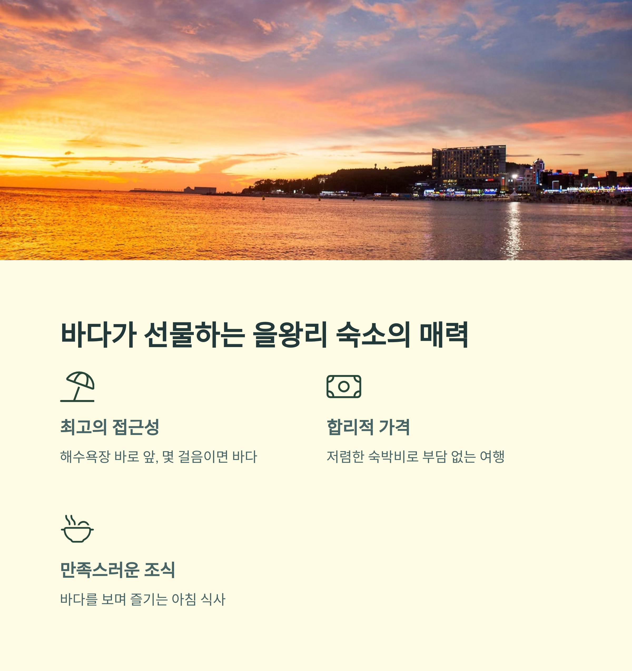 을왕리 숙소 장점 | 바다 전망, 접근성, 저렴한 가격, 조식 만족도 높음 |