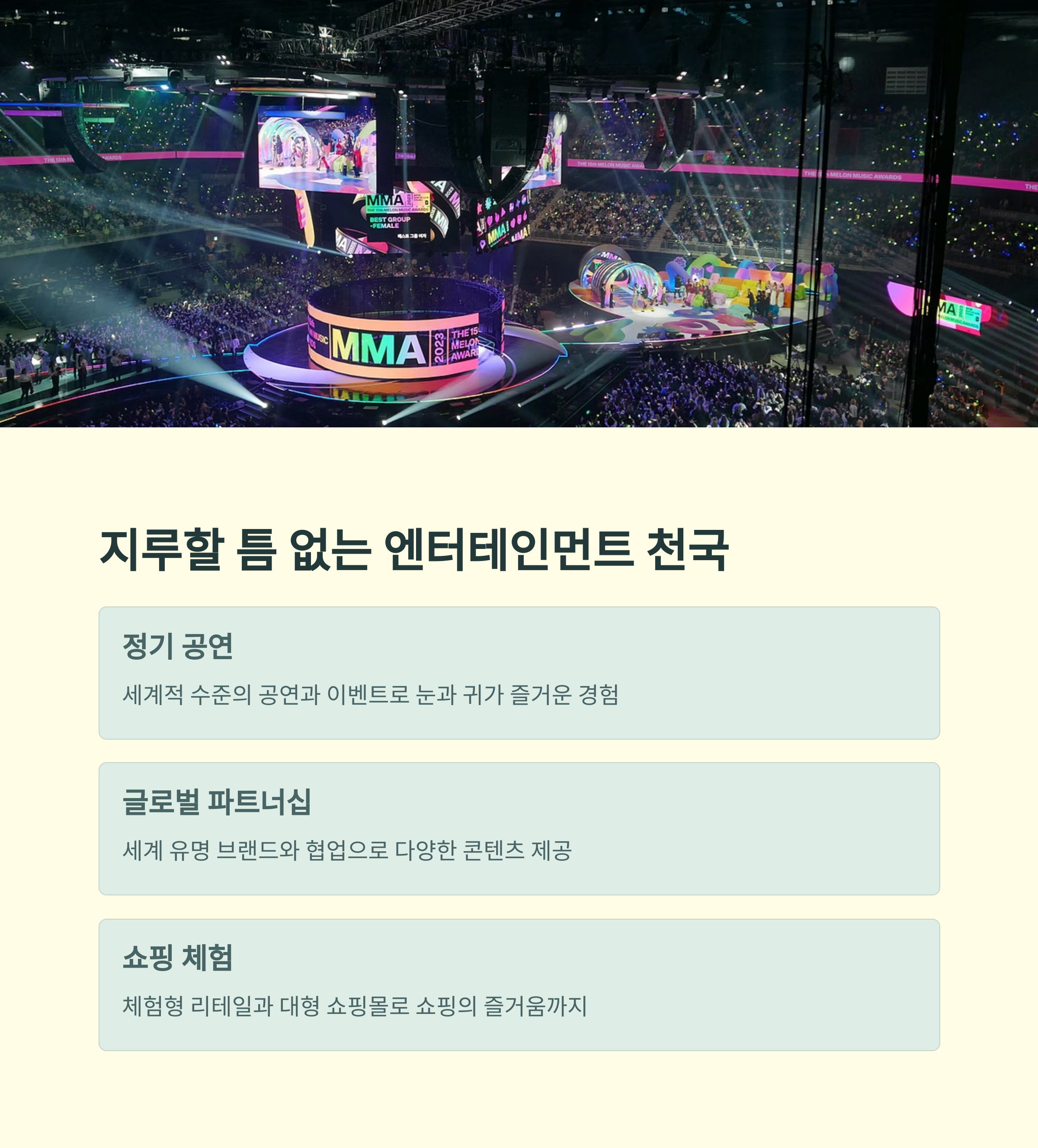 인스파이어 리조트 특징 | 카지노, 워터파크, 공연장 등 다양한 시설 보유 |