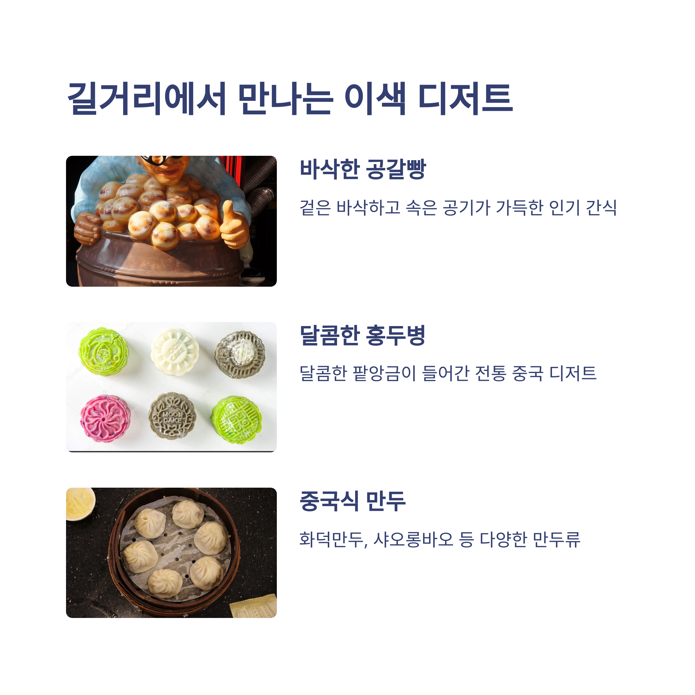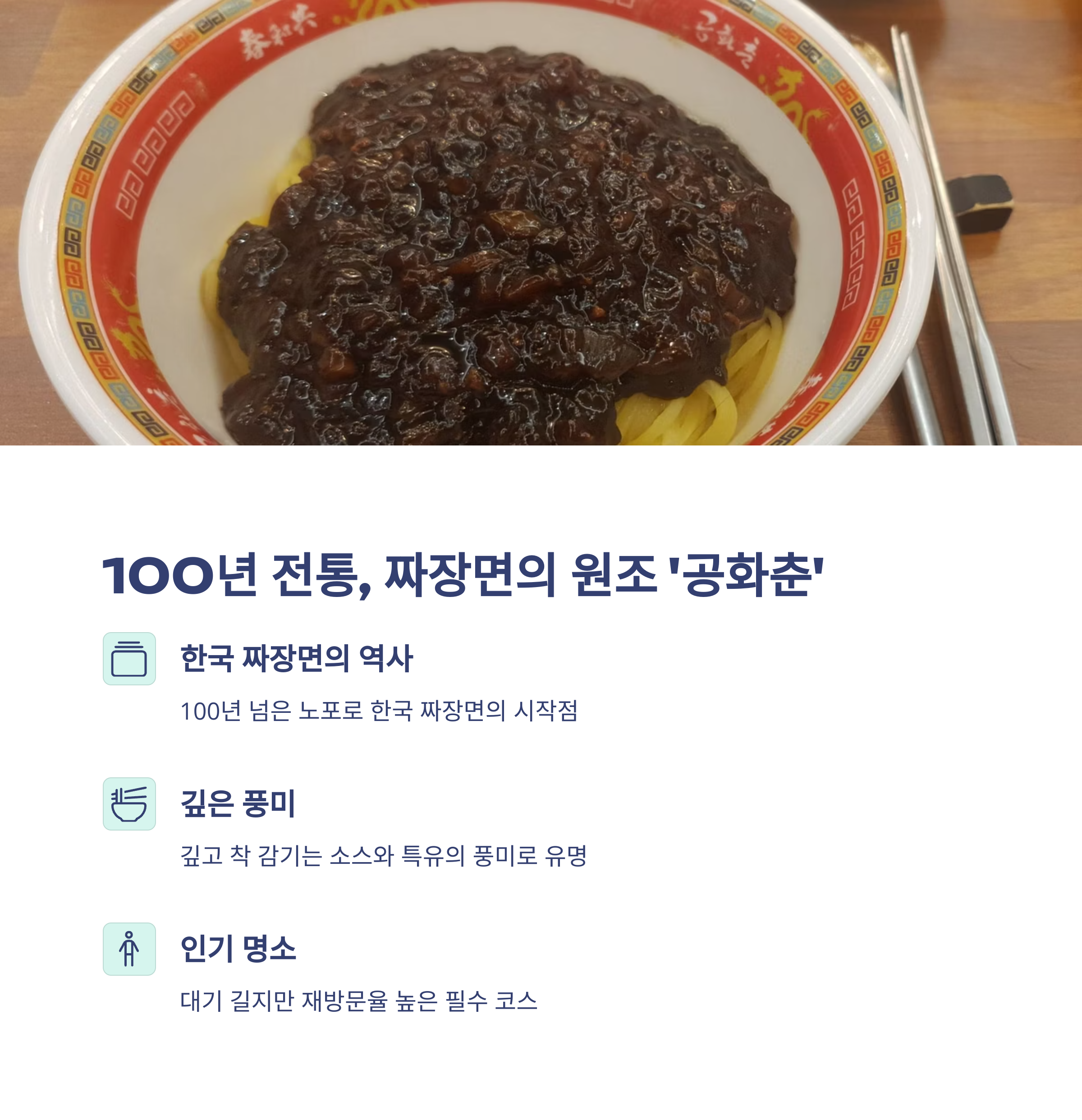| 공화춘, 신승반점, 연경 | 공갈빵, 홍두병, 화덕만두, 샤오롱바오 | 월화거리, 신포시장, 자유공원 |