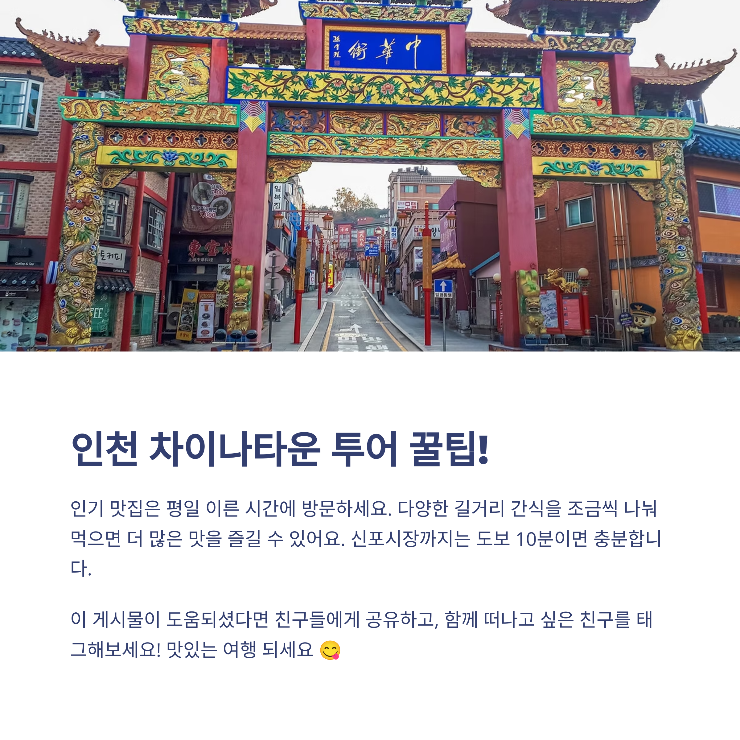 인천차이나타운과 신포시장은 100년의 전통과 현재의 감성이 공존하는 먹방 여행지입니다. 역사와 문화, 미식을 하루에 담을 수 있는 이 코스는 당일치기 국내 여행지로도 완벽한 선택이 될 것입니다.