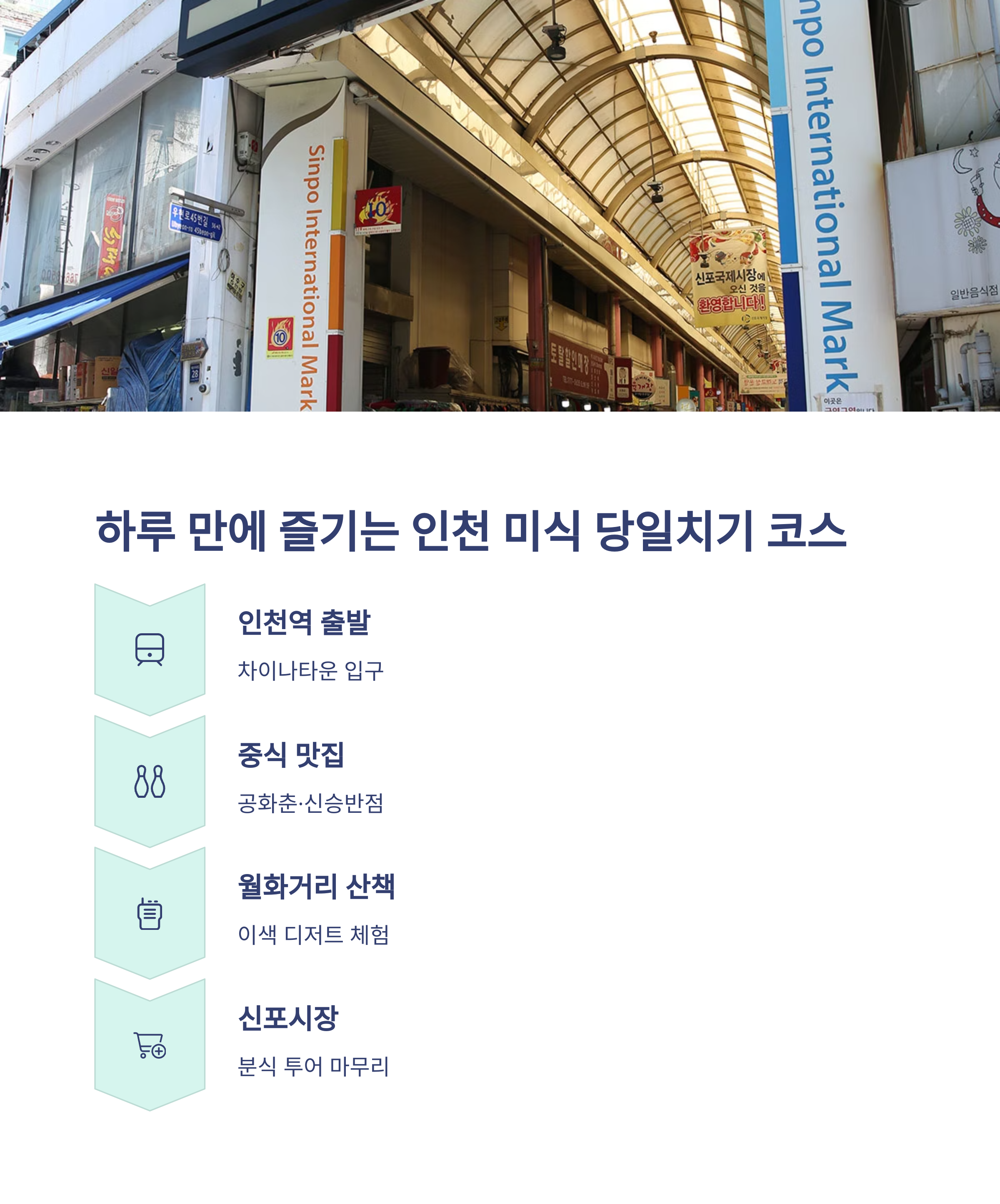 | 코스 구성 | 차이나타운 중식 맛집 → 거리 간식 → 월화거리 산책 → 신포시장 먹거리 탐방 |