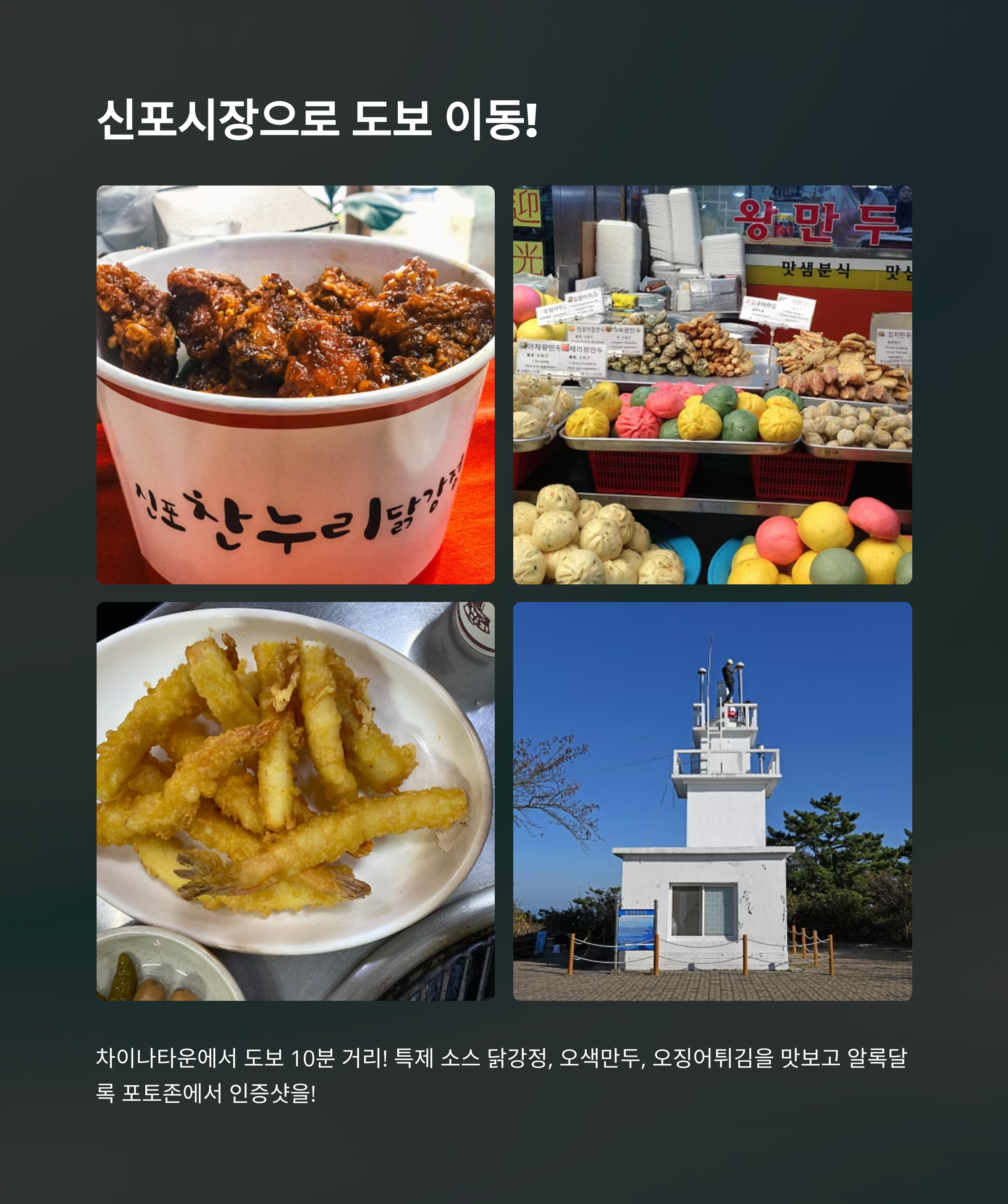 신포시장에서는 닭강정, 오색만두, 오징어튀김 같은 전통 분식부터 등대공원, 포토존 등 감성 공간까지 즐길 수 있어 먹고, 보고, 찍는 즐거움이 가득합니다. 시장과 차이나타운은 도보 10분 이내로 이동이 가능해 당일치기 코스로 최적화된 여행 루트를 자랑합니다.