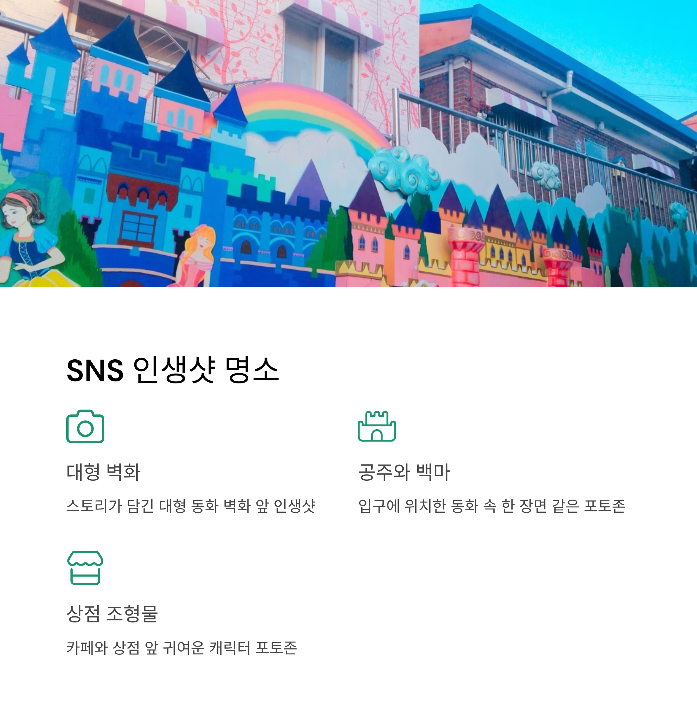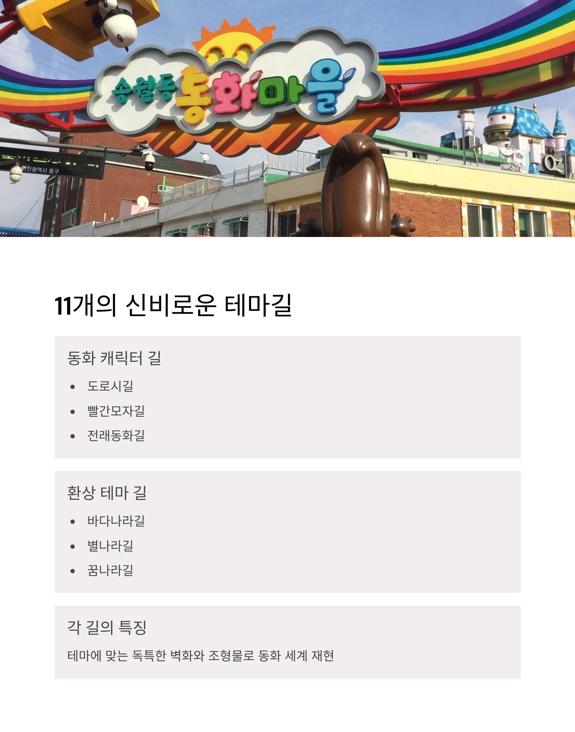 | 도로시길, 빨간모자길, 전래동화길 등 11개 테마 | 트릭아트 체험관, 포토존 벽화, 동화 조형물 | 인천 차이나타운, 자유공원, 월미도 |