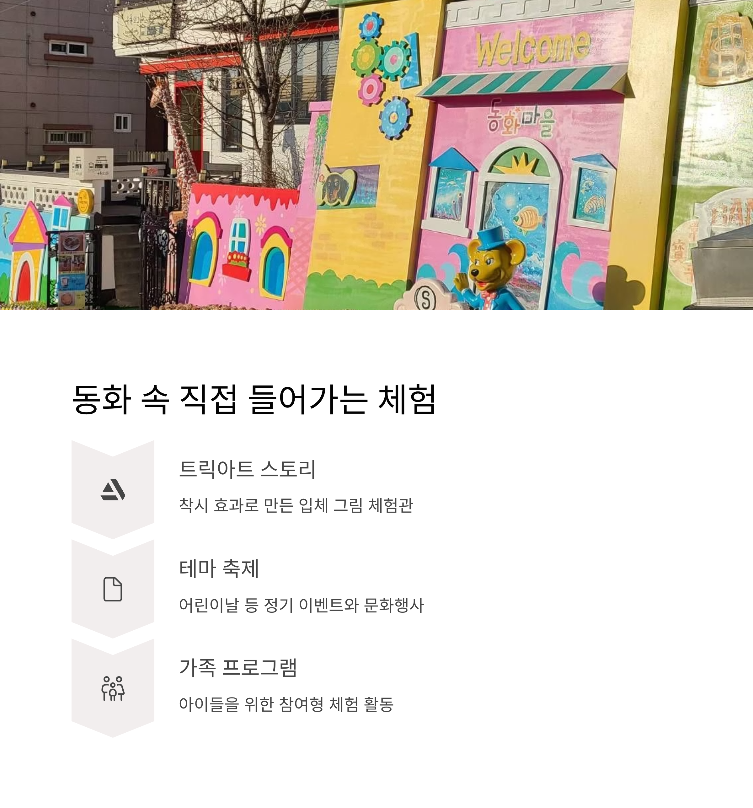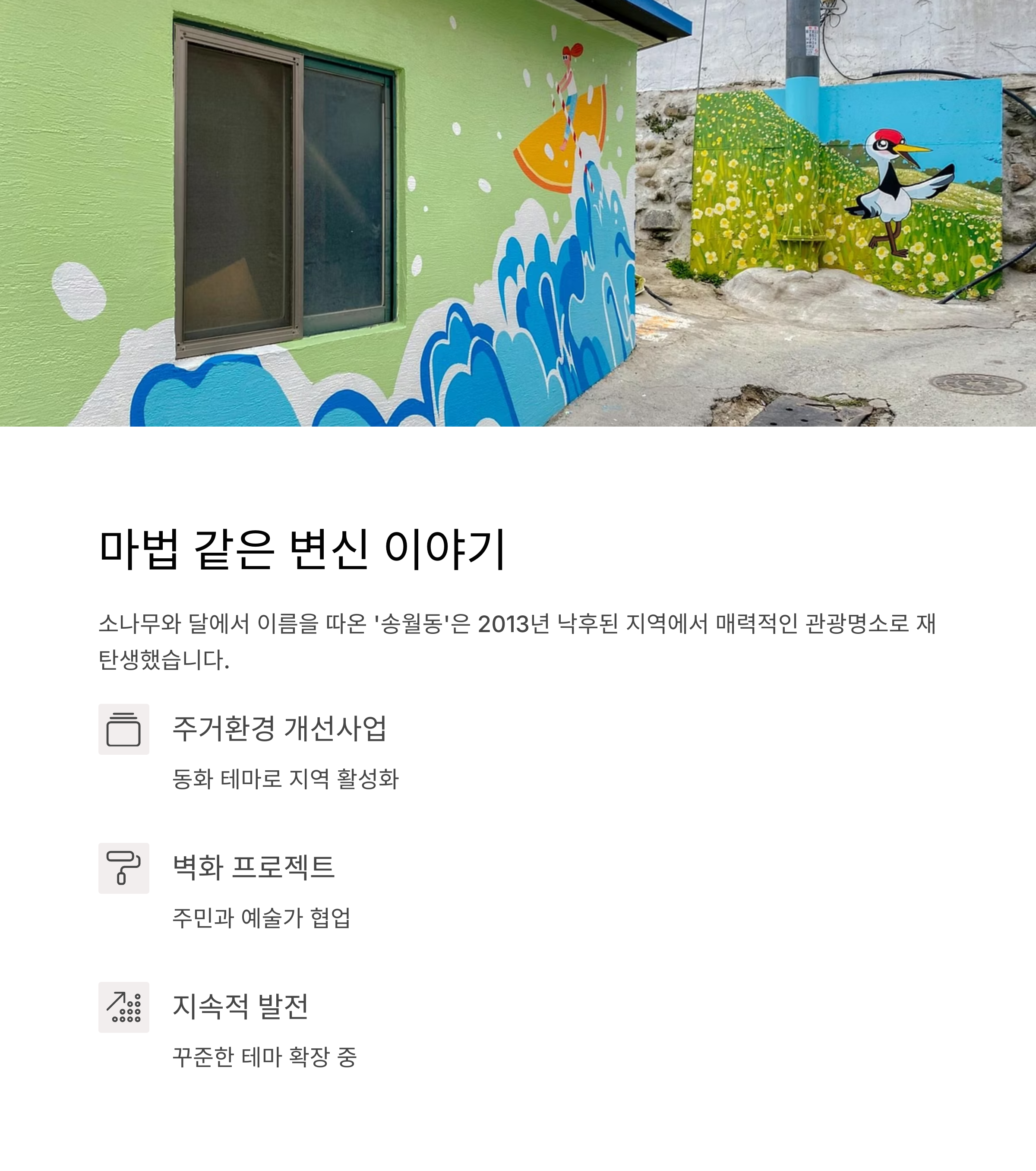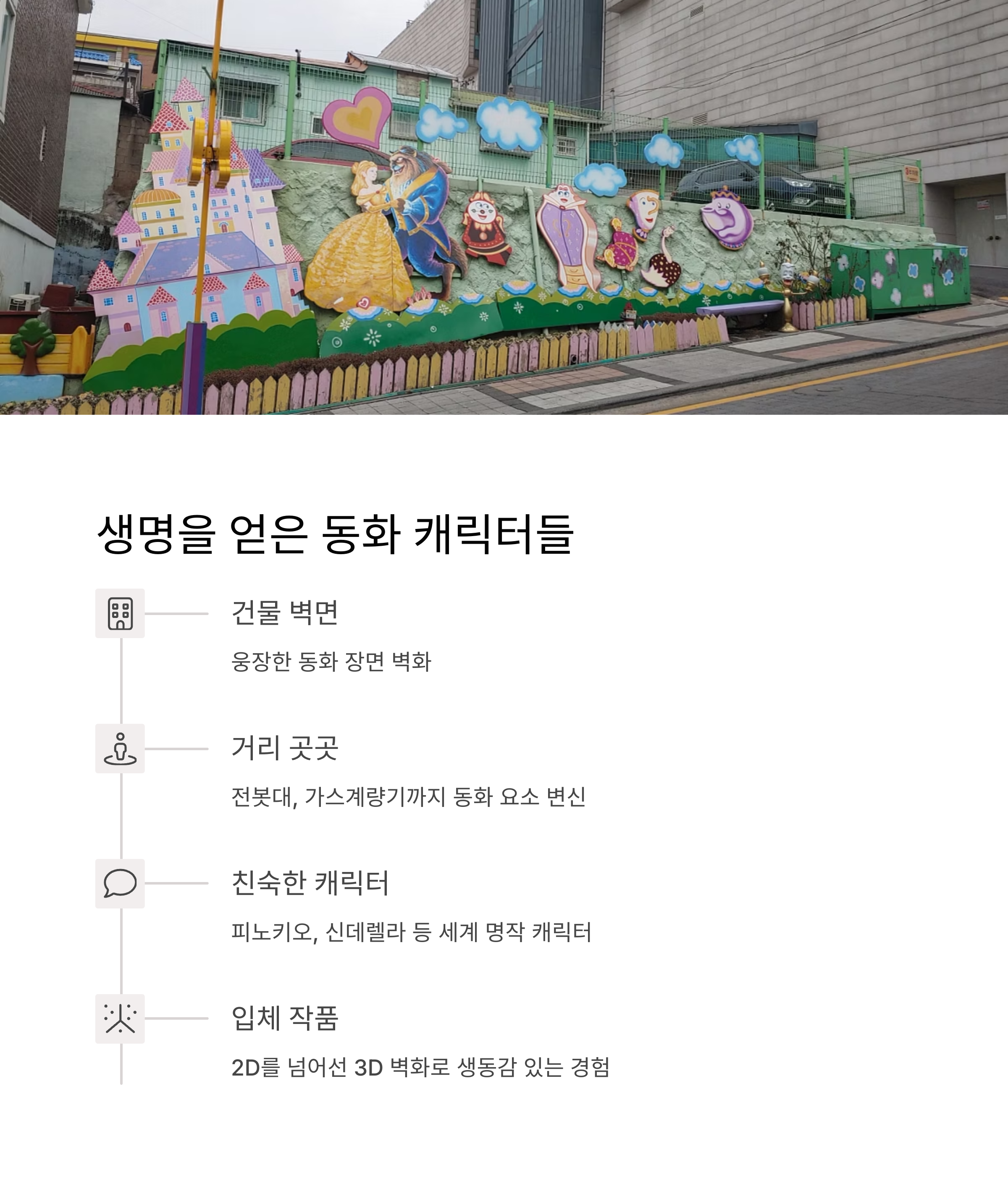 | 대표 볼거리 | 동화 벽화, 테마거리 11곳, 트릭아트 체험관, 포토존 벤치·조형물 |