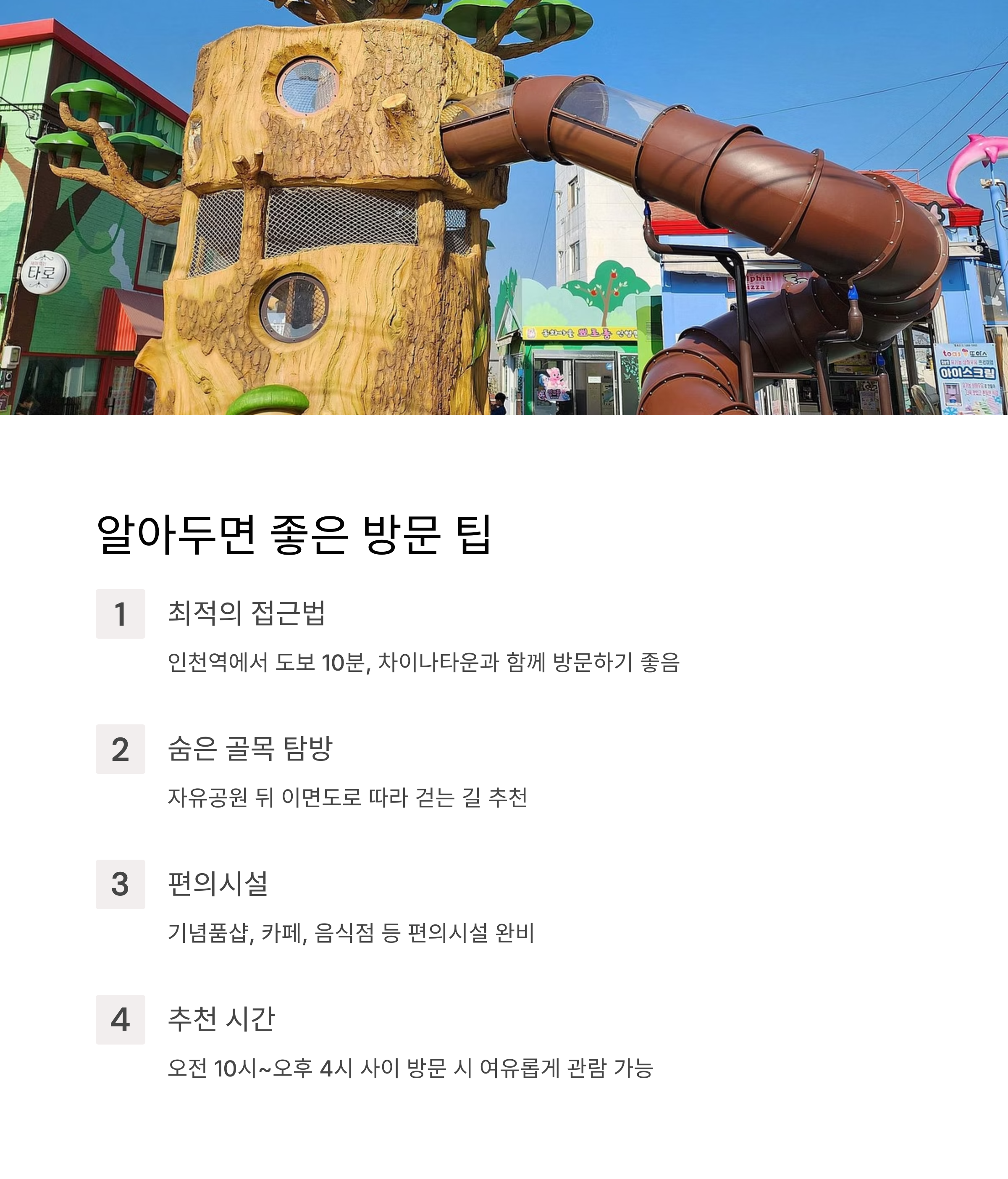 | 캐릭터별 테마 구간으로 길 따라 걷는 재미 | SNS 인생샷 명소로 인기 / 가족 체험에 적합 | 인천역 반나절 도보 여행 루트로 추천 |