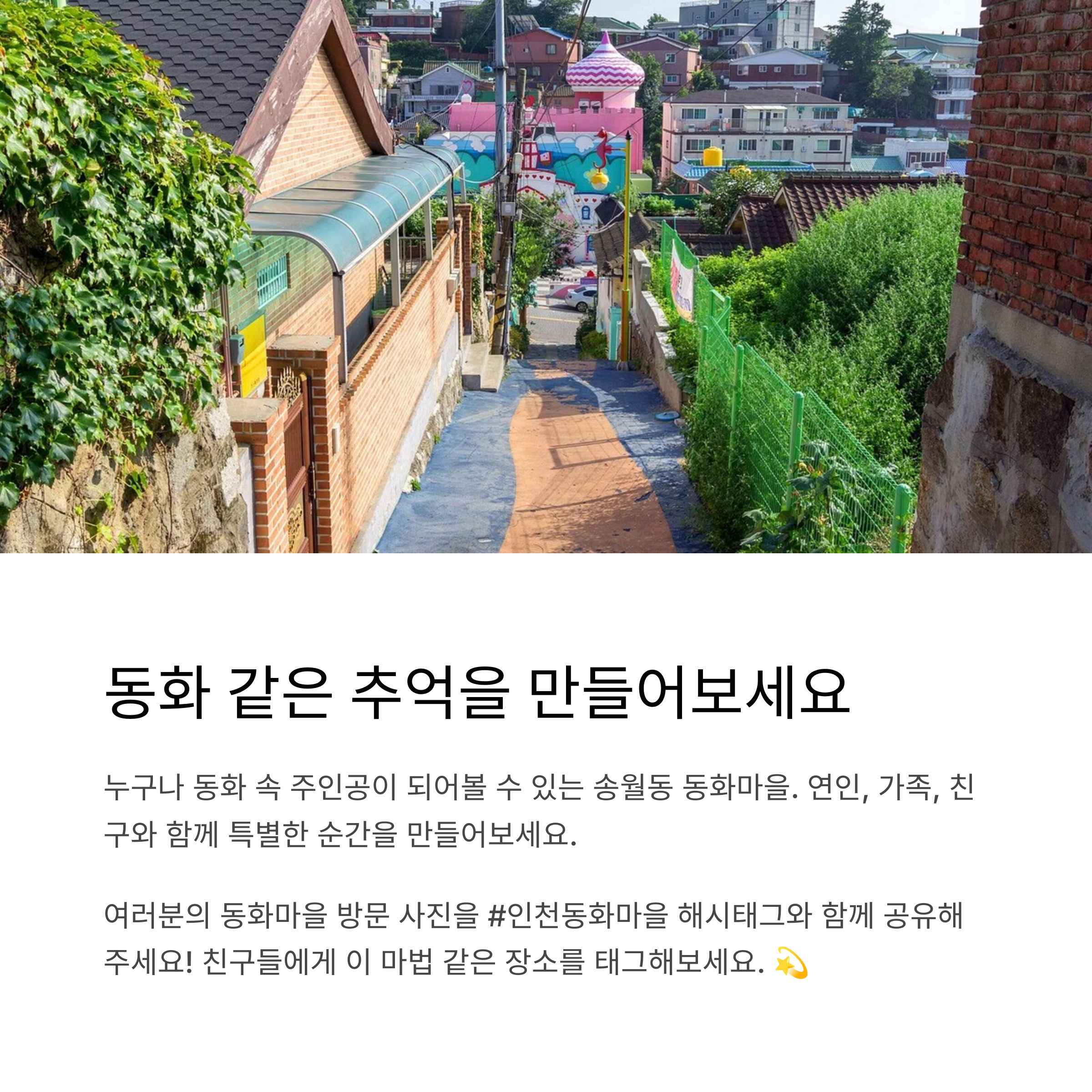 인천 송월동 동화마을은 도심 속 동화 속 세상을 걷는 듯한 특별한 체험을 선사합니다. 알록달록한 골목길과 포토존 가득한 이 마을은 감성 여행, 가족 나들이, 데이트 코스로 모두에게 추천할 만한 인천의 숨은 명소입니다.