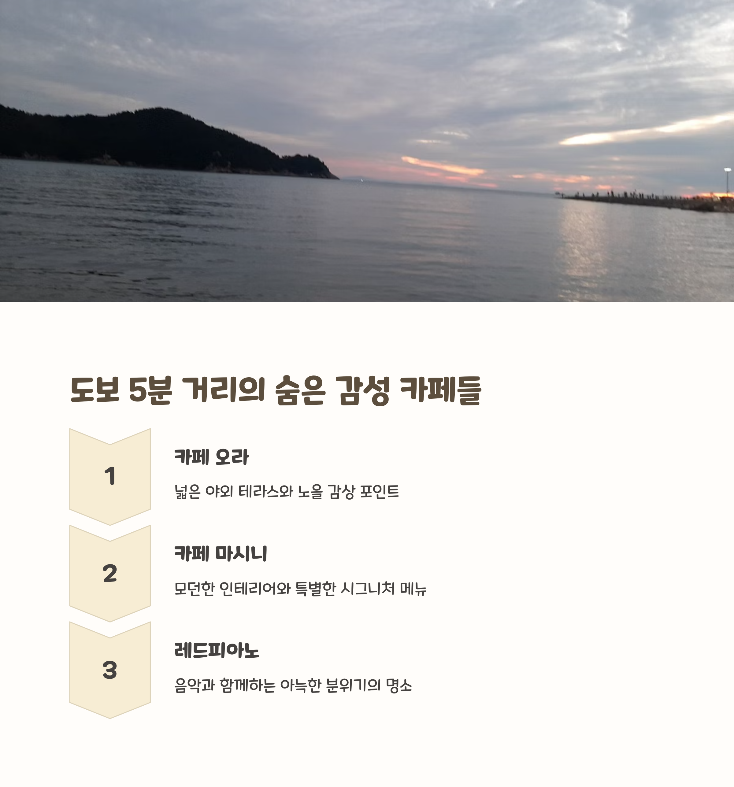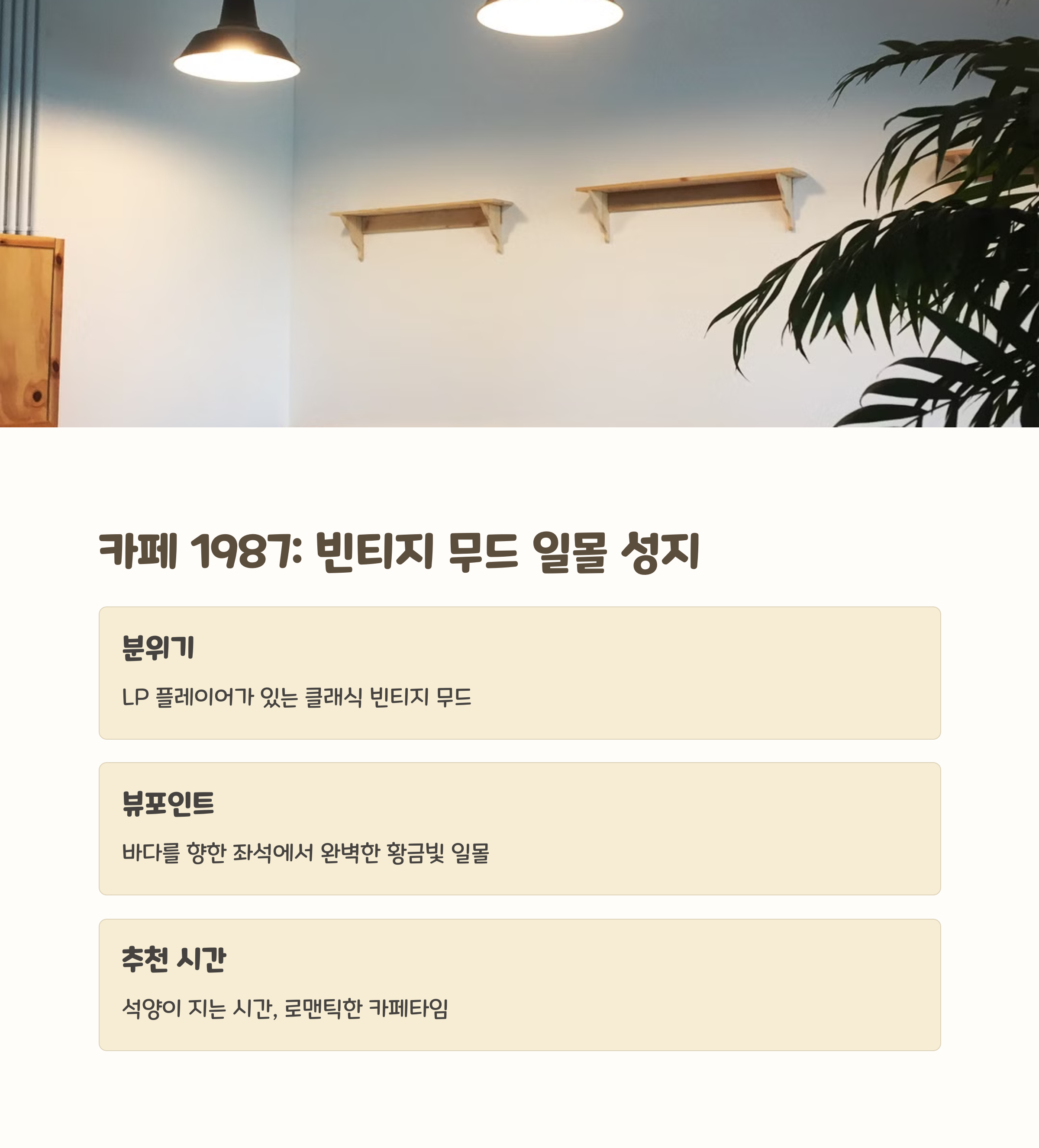 '카페 1987'은 빈티지한 감성과 함께 일몰 뷰가 아름다운 것으로 유명합니다. 노을 시간대에 방문하면 황홀한 바다 일몰을 감상할 수 있습니다.