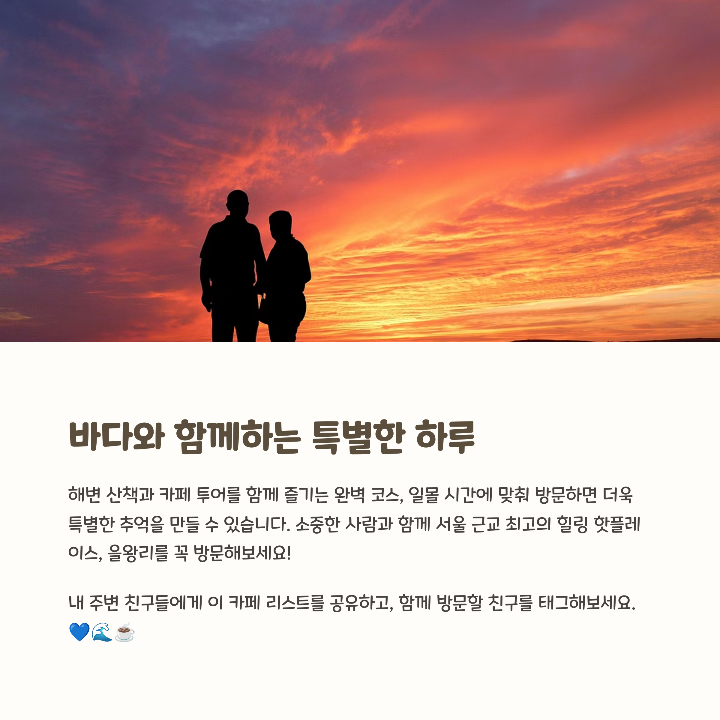 을왕리에서 기억에 남는 카페가 있으신가요? 추천하고 싶은 핫플이 있다면 댓글로 공유해주세요. 여행자들의 감성 루트를 완성하는 데 큰 도움이 됩니다!