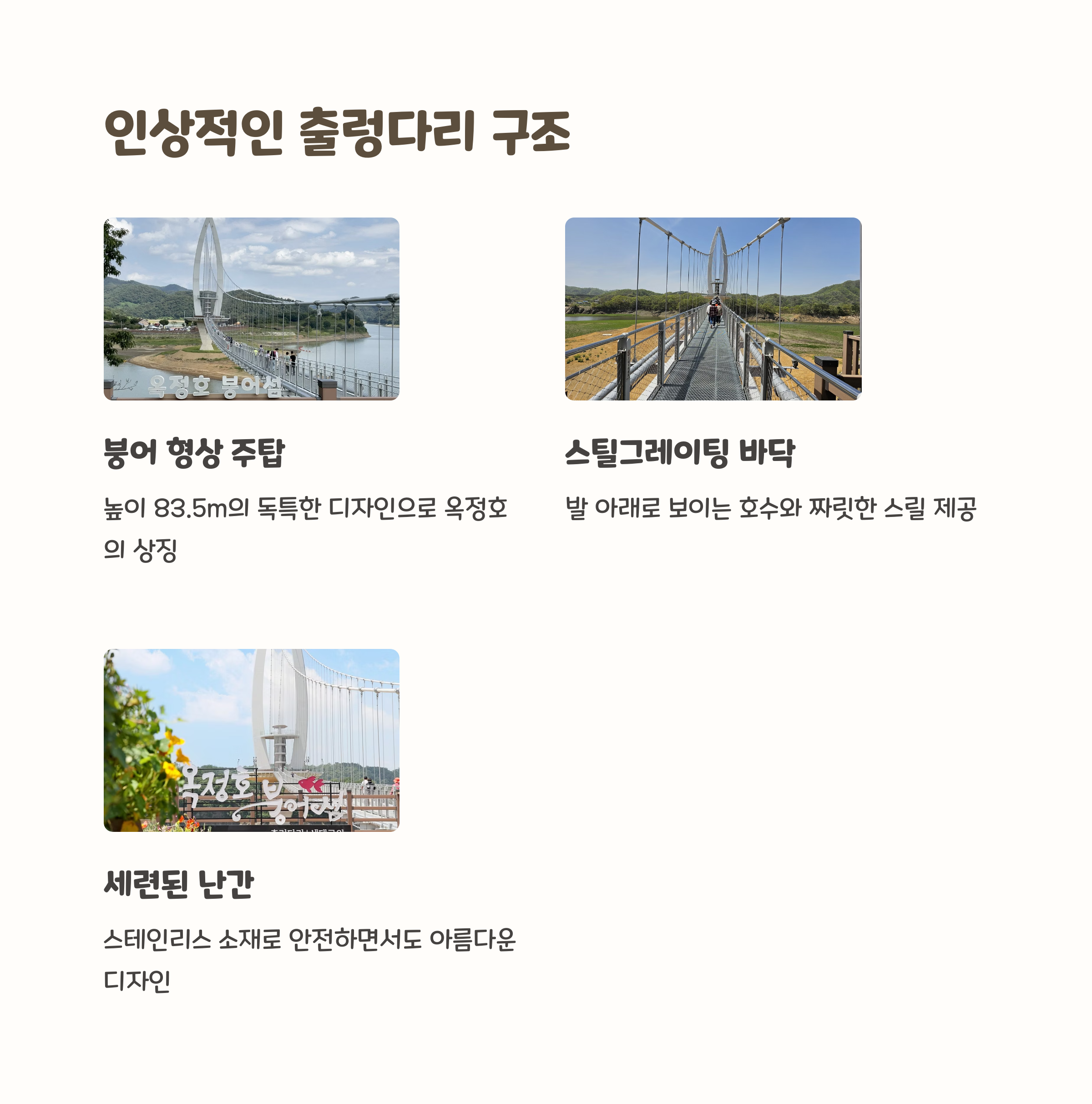 | 추천 포인트 | 출렁다리 짜릿한 도보 체험 + 옥정호 전망 + 사계절 꽃길 + 포토존 |