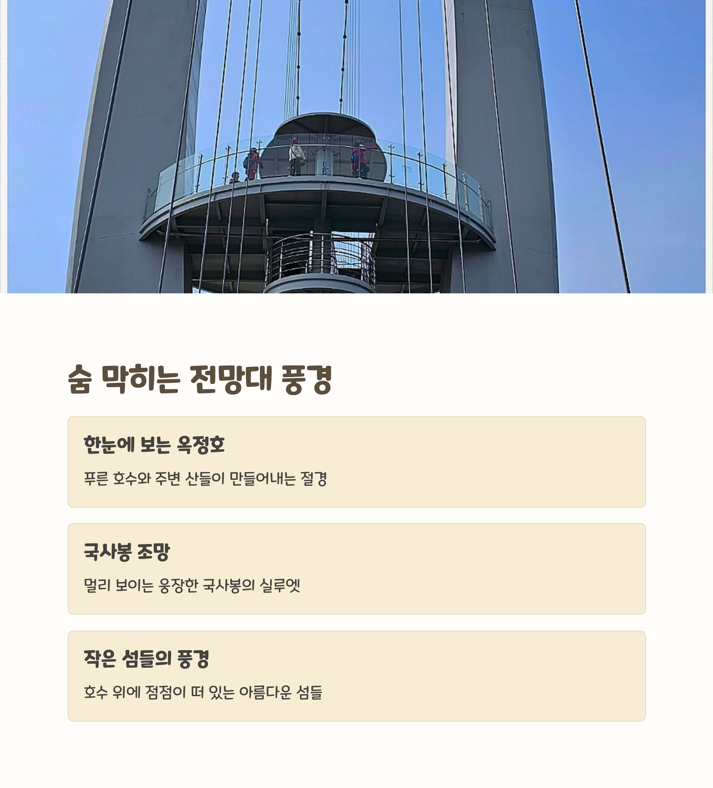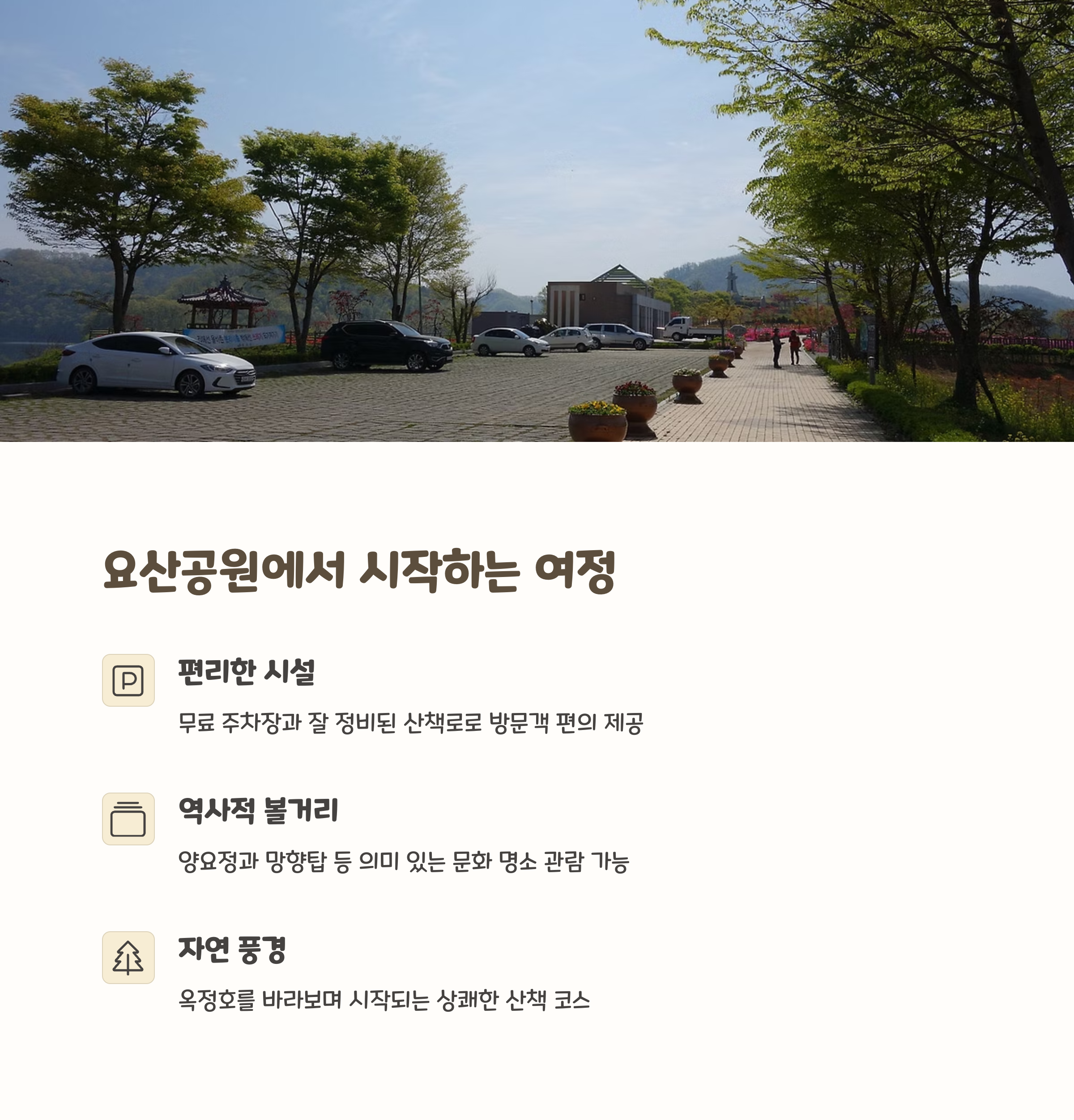 | 주차장 접근 용이, 산책 시작 지점 | 전망대에서 옥정호, 국사봉 감상 가능 | 가족, 연인, 친구와 걷기 좋은 힐링 명소 |