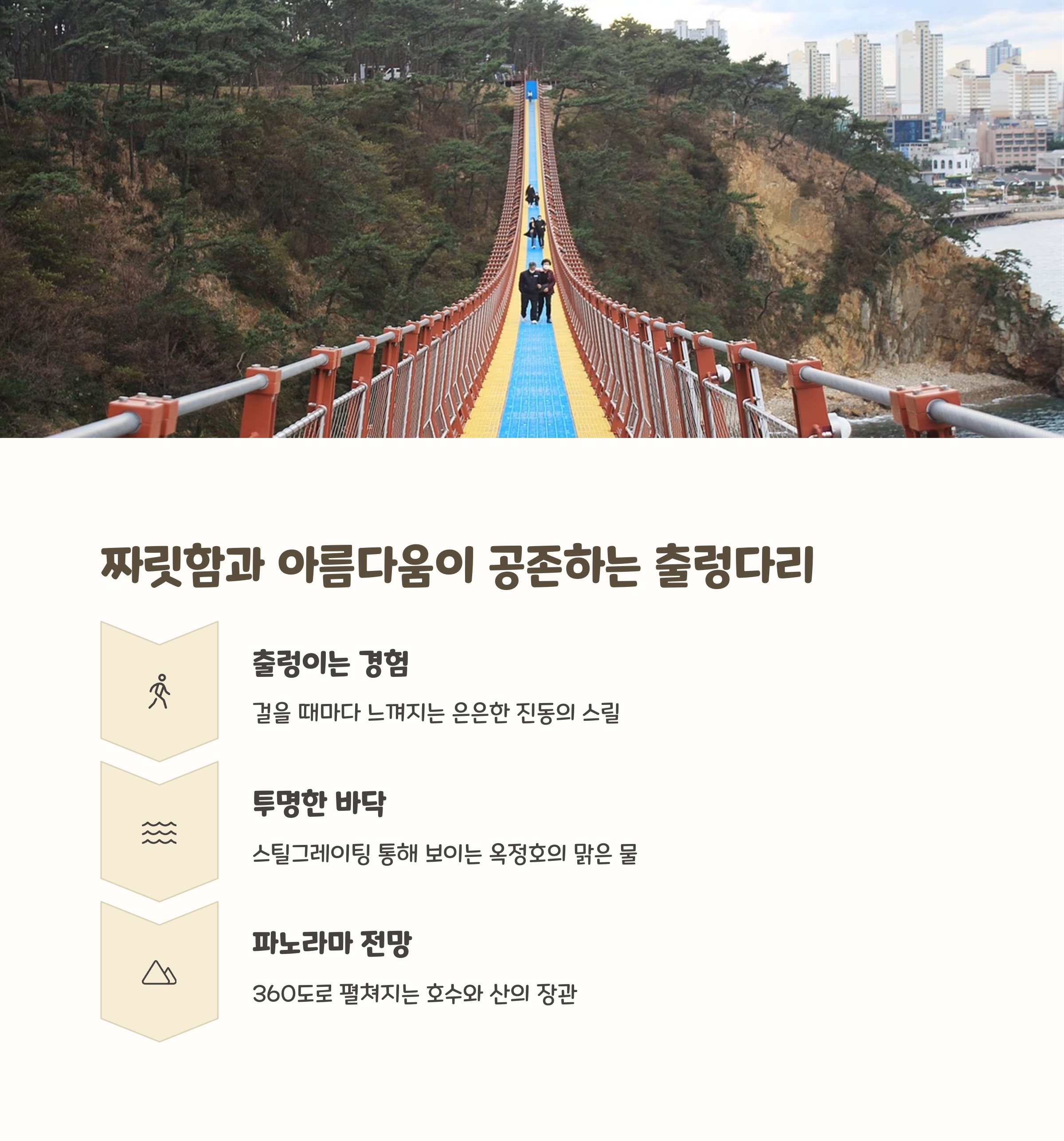 출렁다리는 구조적으로 안전하게 설계되어 있으며, 다소 흔들림은 있으나 공포감보다는 짜릿한 체험으로 받아들여지는 정도입니다. 어린이, 어르신도 이용 가능합니다.