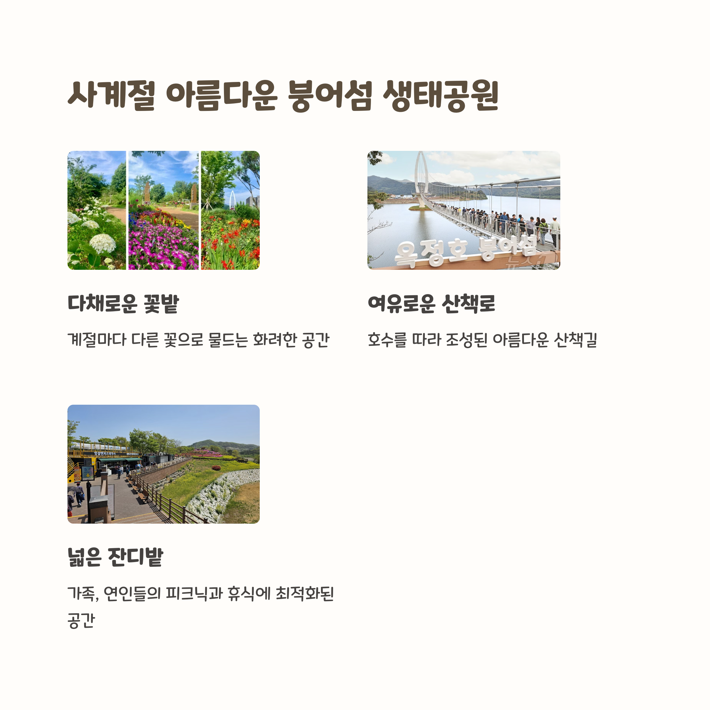 다리 중간에는 탁 트인 옥정호를 감상할 수 있는 전망대가 있어 멈춰서 사진을 찍거나 경치를 바라보기에 좋습니다. 특히 국사봉과 작은 섬들이 만들어내는 풍경은 계절마다 다른 아름다움을 보여줘 사계절 모두 추천할 만합니다. 다리를 건너 도착하는 붕어섬 생태공원은 꽃길 산책로, 벤치, 포토존이 마련되어 있어 누구나 천천히 여유를 즐기며 둘러볼 수 있습니다.