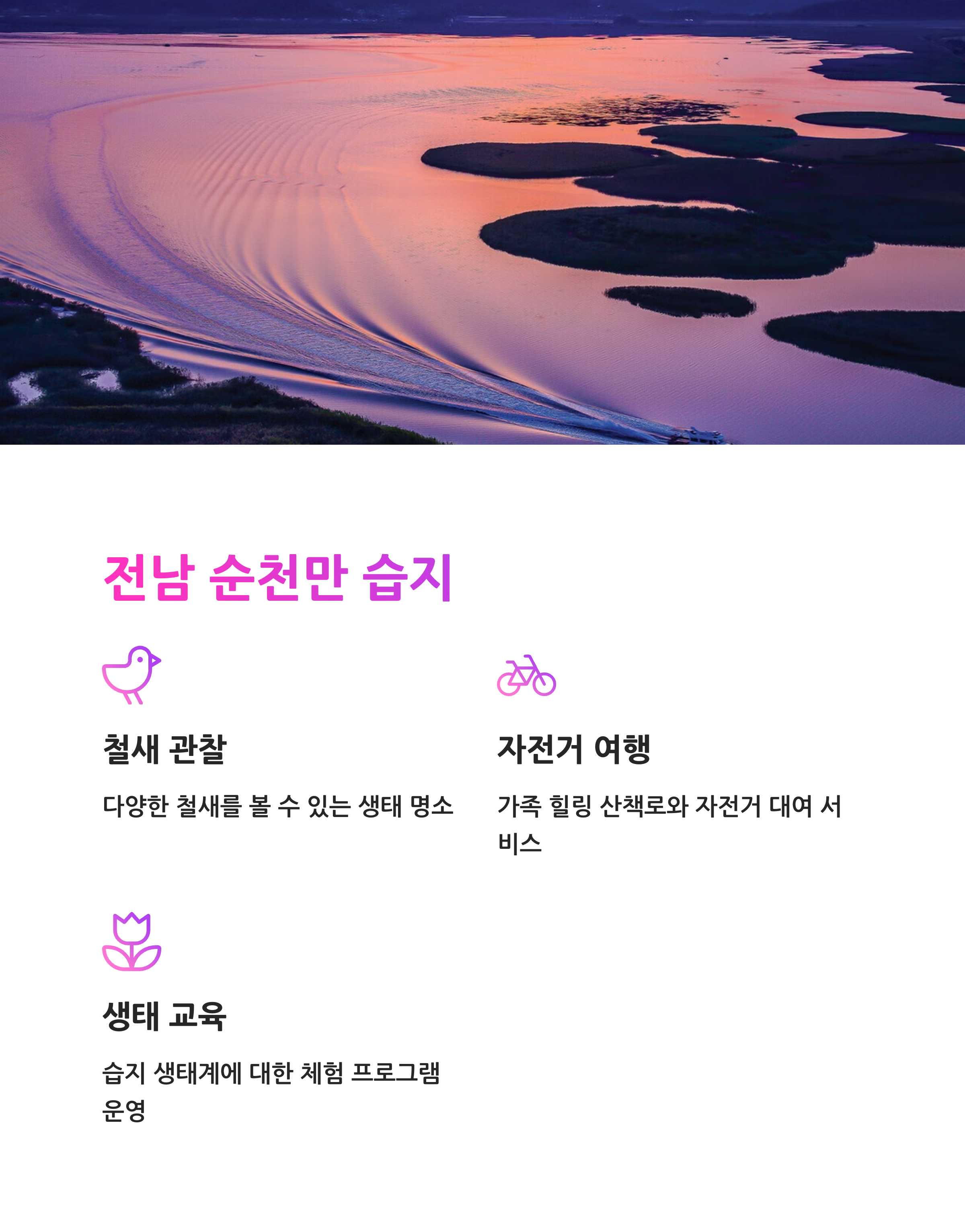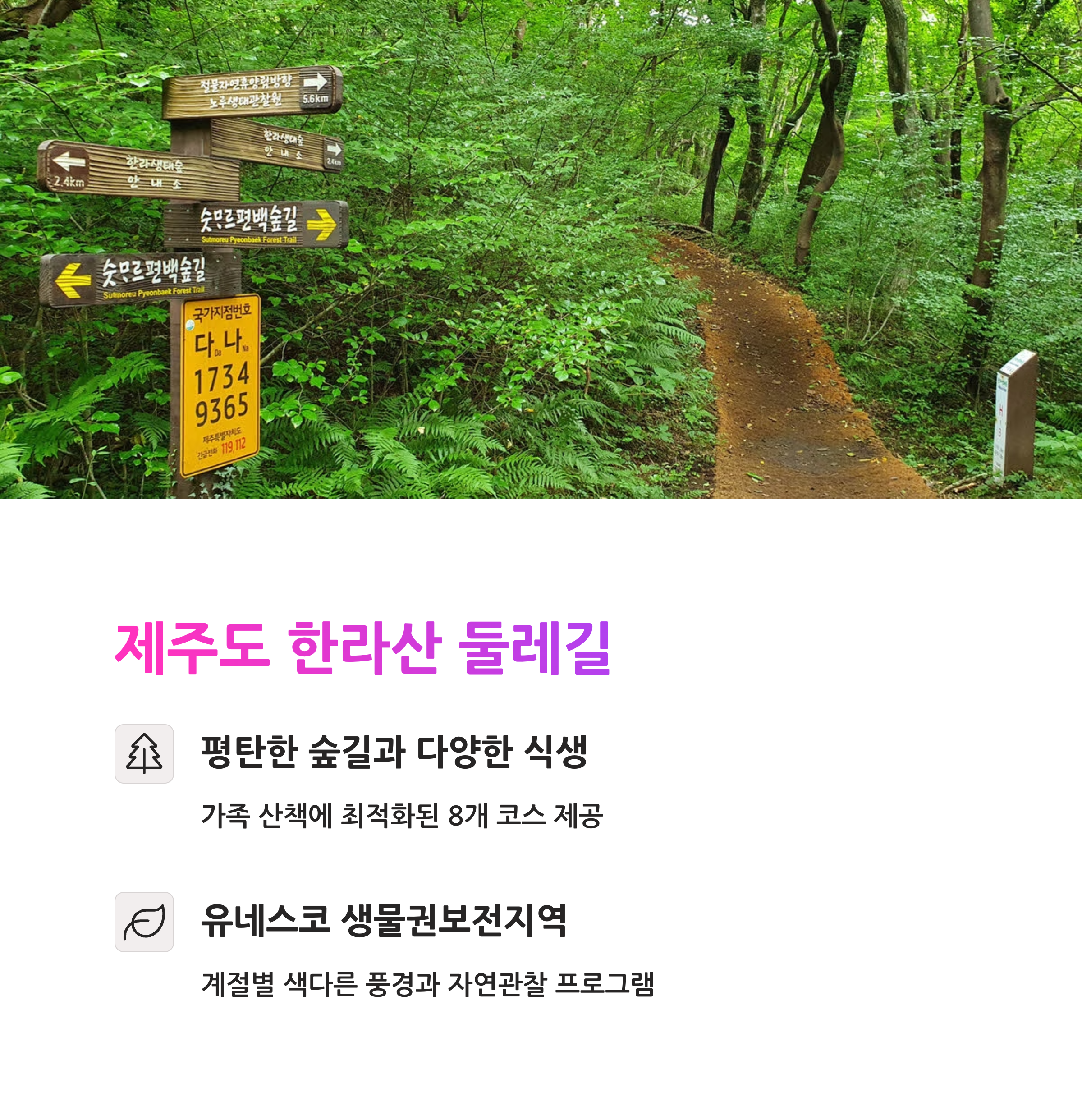 | 인기 추천지 | 한라산 둘레길, 자작나무숲, 소백산, 순천만 습지 |