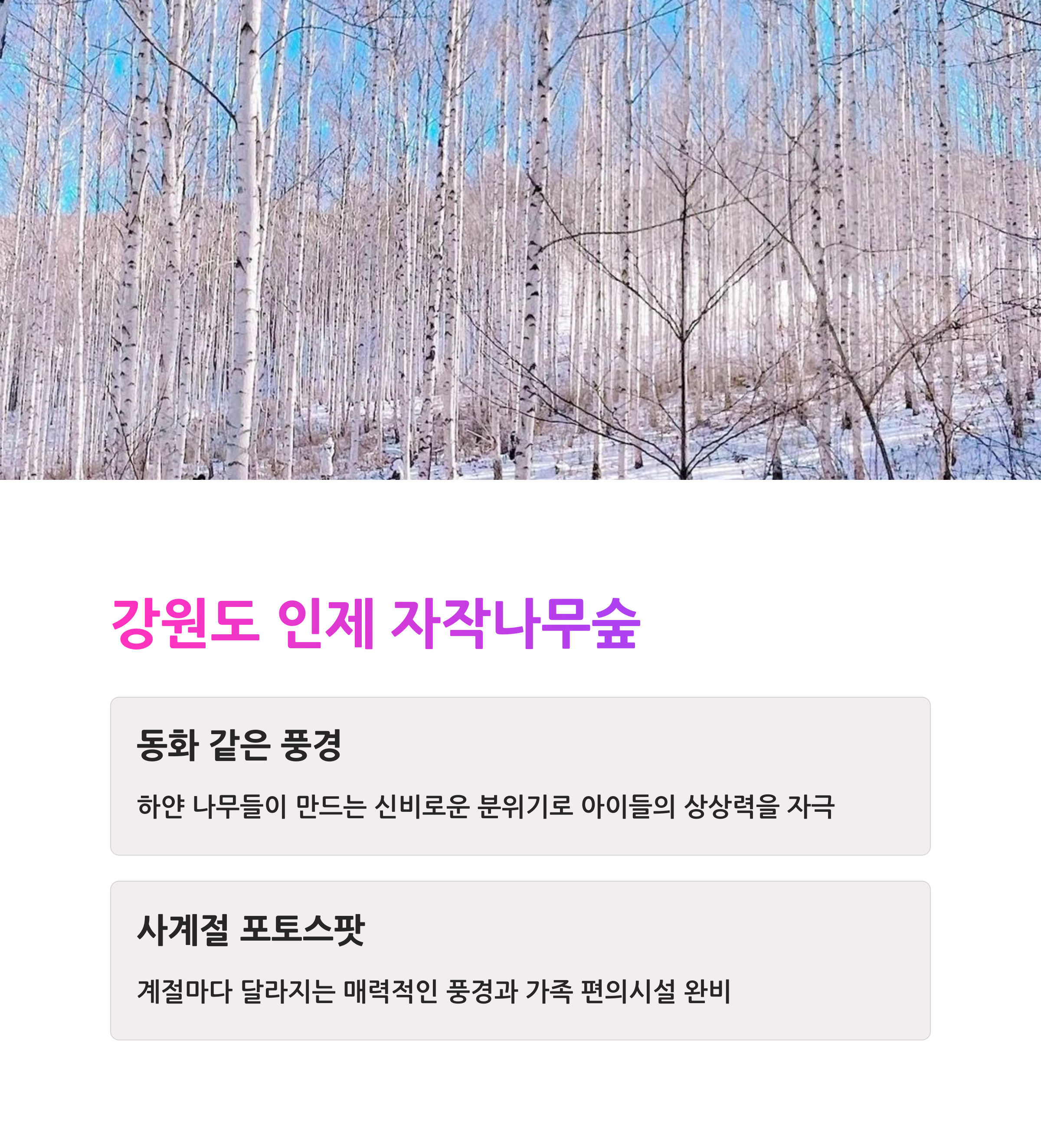 강원도 인제 자작나무숲은 하얗고 고운 나무들이 숲을 이룬 동화 같은 공간으로 아이들의 상상력과 감성을 자극하는 장소입니다. 여름에는 시원하고 겨울에는 설경과 어우러져 계절마다 색다른 매력을 자랑합니다. 트레킹 코스는 비교적 짧고 평이하며, 중간중간 포토존도 마련되어 있어 추억을 기록하기에 좋은 힐링 명소입니다.