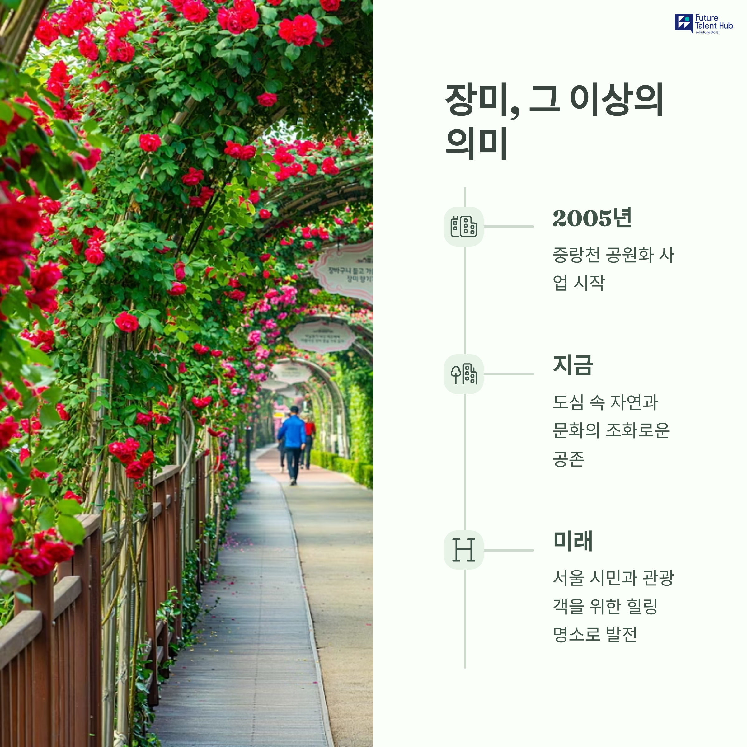 | 5.45km 장미터널과 천만 송이 장미가 장관이에요. | 중랑 외에도 대현산, 창포원 등도 장미 명소예요. | 5월엔 장미, 튤립 등 봄꽃 축제가 풍성하게 열려요. |