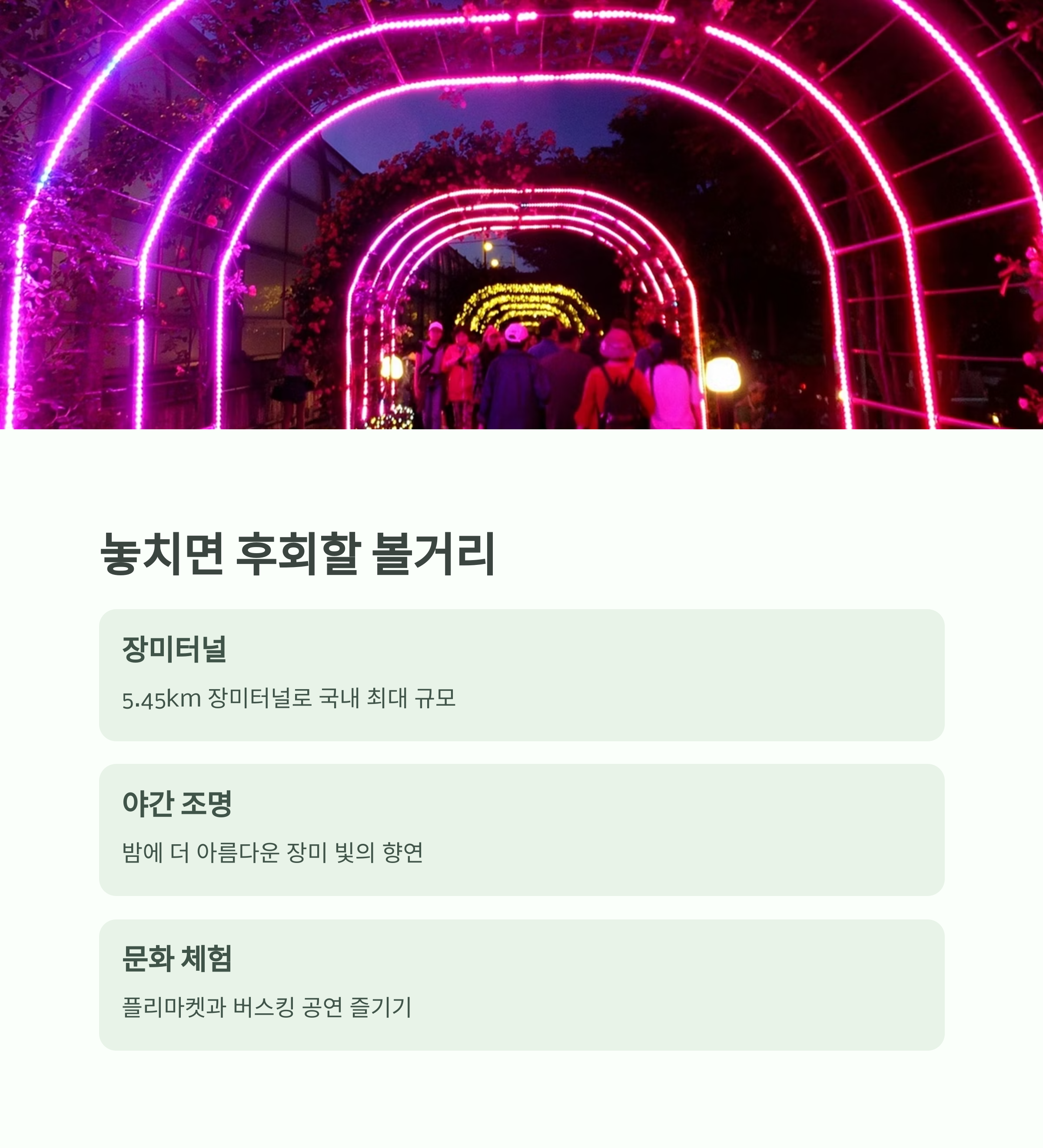 중랑장미축제는 단순한 꽃축제를 넘어, 문화예술과 지역 커뮤니티가 함께 어우러진 종합 페스티벌로도 잘 알려져 있습니다. 축제 기간에는 다양한 테마의 포토존, LED 장미 조명으로 꾸며진 야경, 그리고 아이들을 위한 체험 부스까지 운영돼 온 가족이 함께할 수 있는 즐길 거리가 풍성하답니다. 특히 밤에 걷는 장미터널은 낮과는 또 다른 분위기를 선사하여 데이트 코스로도 인기가 많습니다.