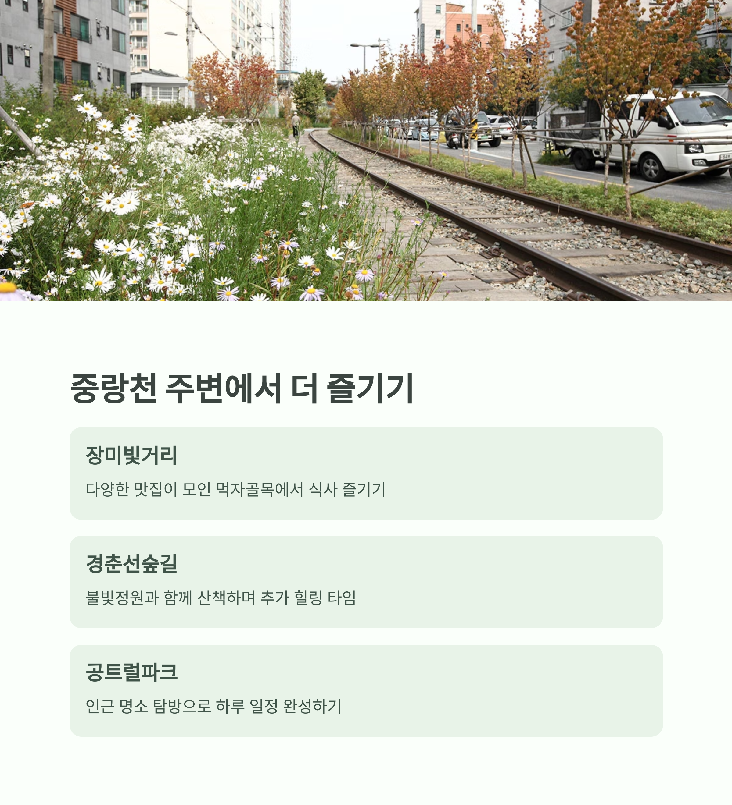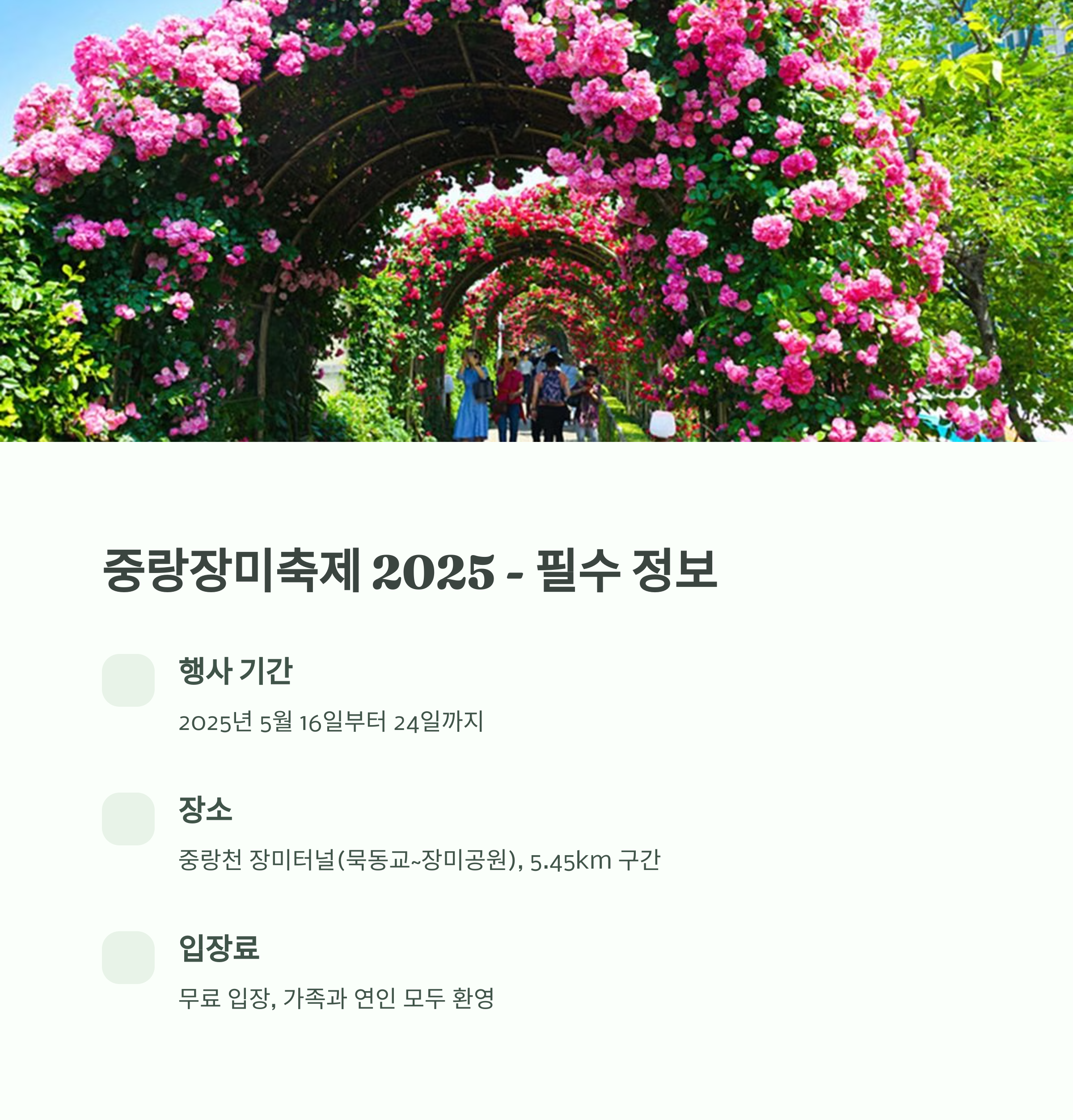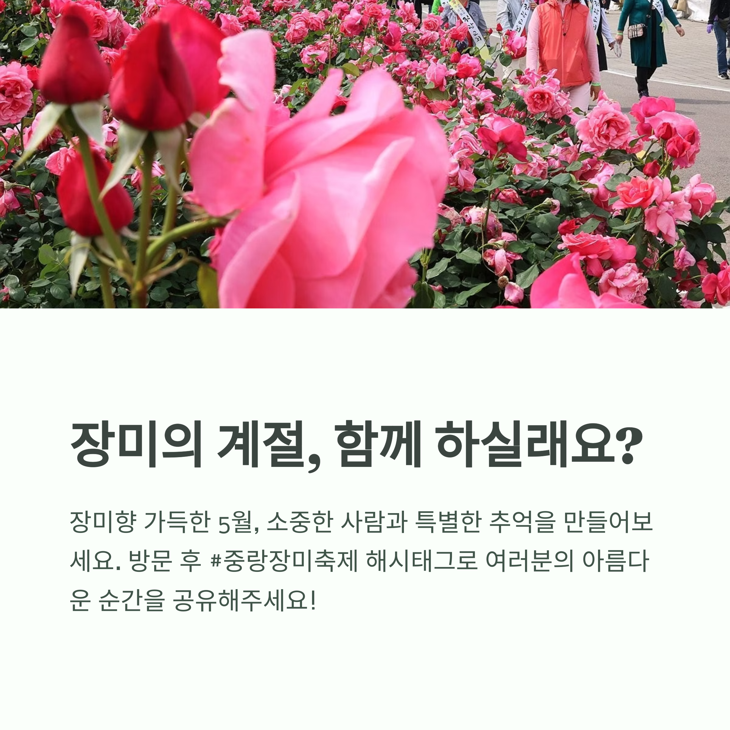 | 5.45km 장미터널과 천만 송이 장미가 장관이에요. | 중랑 외에도 대현산, 창포원 등도 장미 명소예요. | 5월엔 장미, 튤립 등 봄꽃 축제가 풍성하게 열려요. |