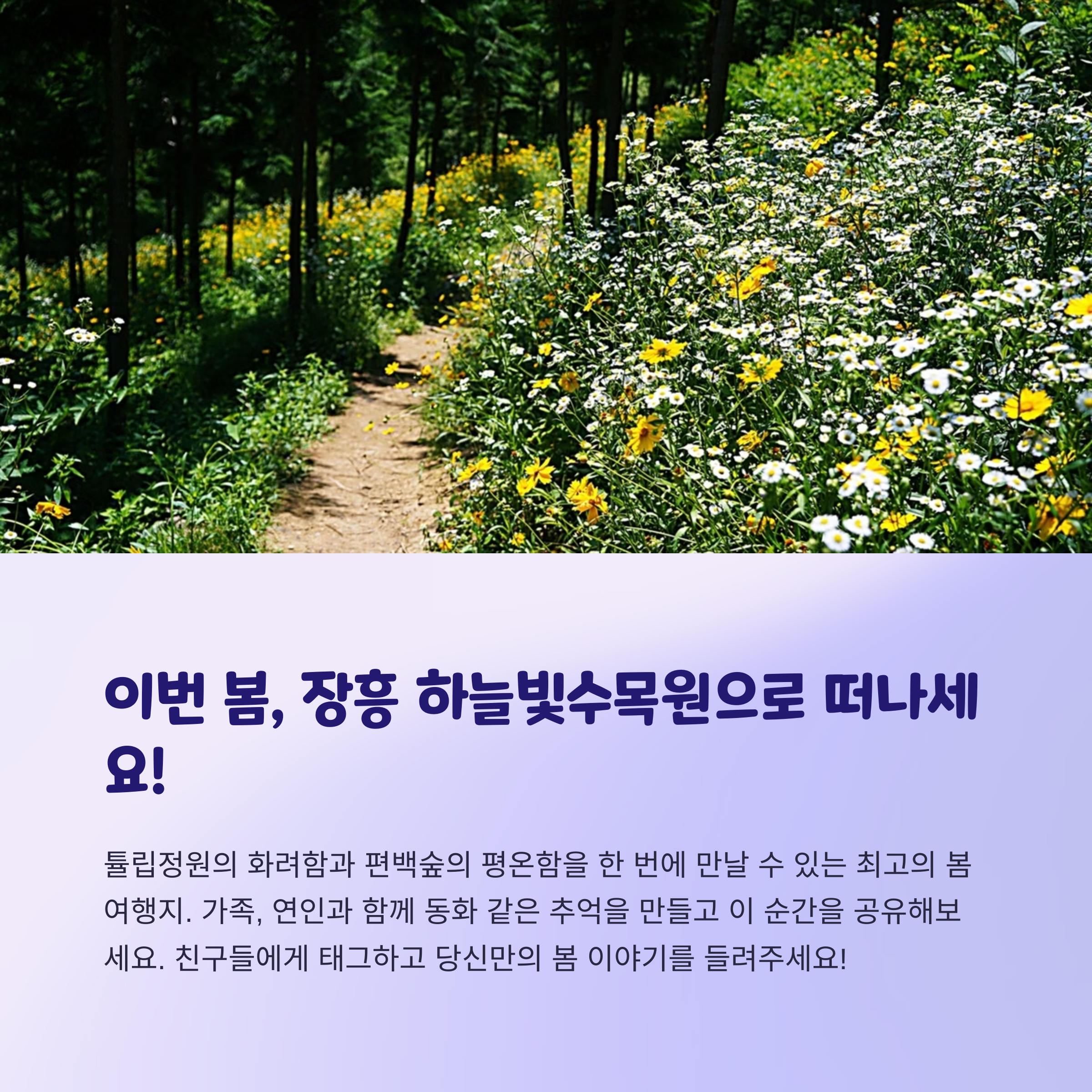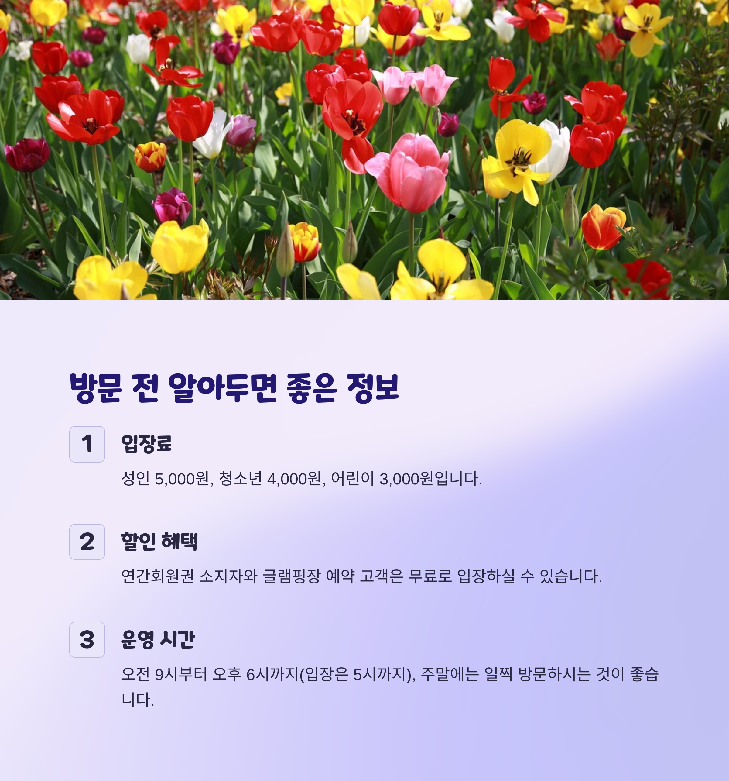 장흥 하늘빛수목원은 꽃과 숲을 한자리에서 경험할 수 있는 드문 자연 속 힐링 여행지입니다. 튤립의 화사함과 편백숲의 고요함이 어우러지는 봄날의 하루는 몸도 마음도 충전되는 특별한 선물이 될 것입니다. 당일치기 코스로도, 주말 여행으로도 만족도 높은 장소니 이번 봄엔 꼭 장흥으로 발걸음을 옮겨보세요.
