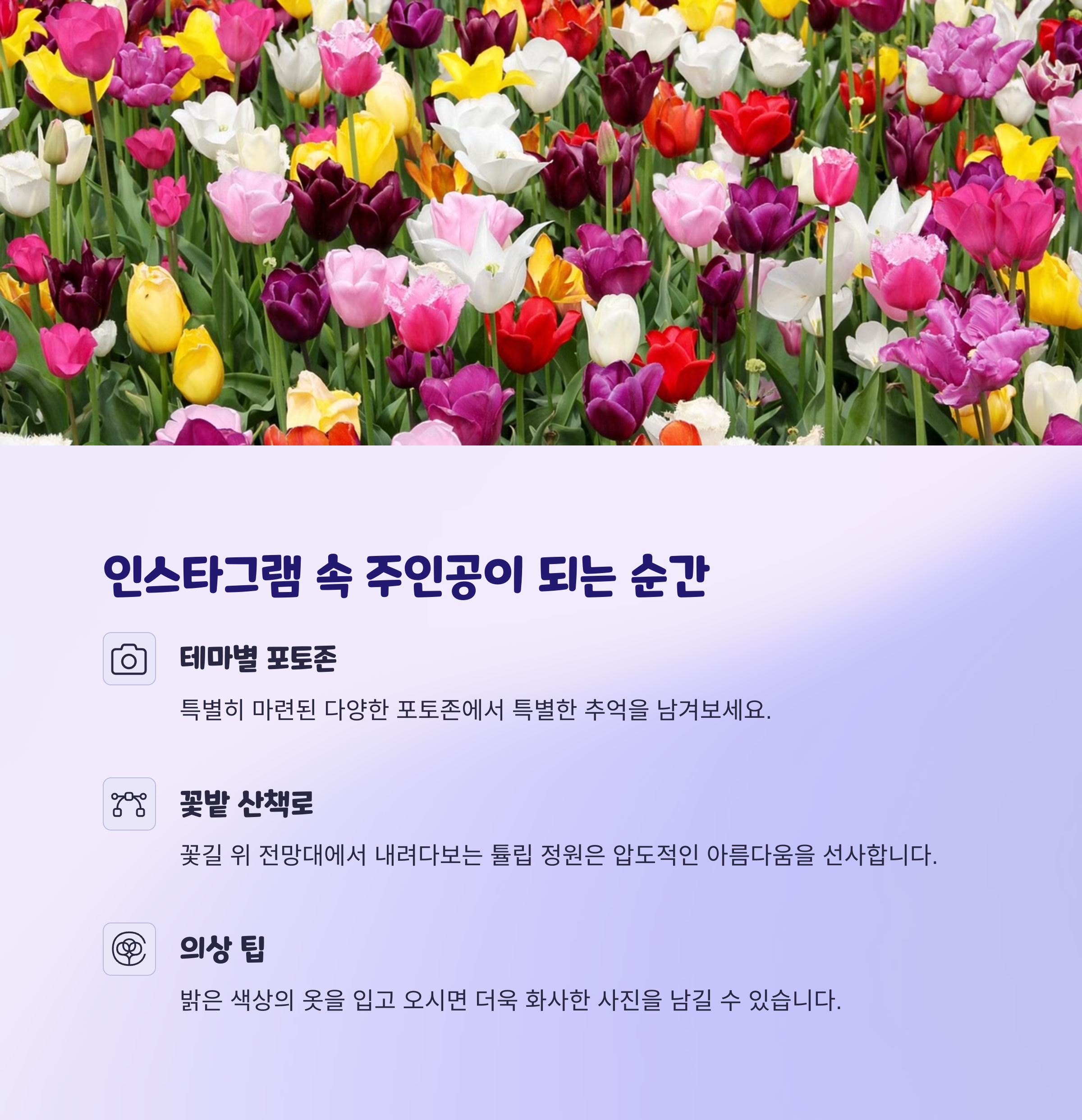 하늘빛수목원에서 찍은 사진, 아이들과의 추억, 튤립축제의 생생한 느낌을 댓글로 남겨주세요. 다른 방문객들에게 큰 도움이 됩니다!