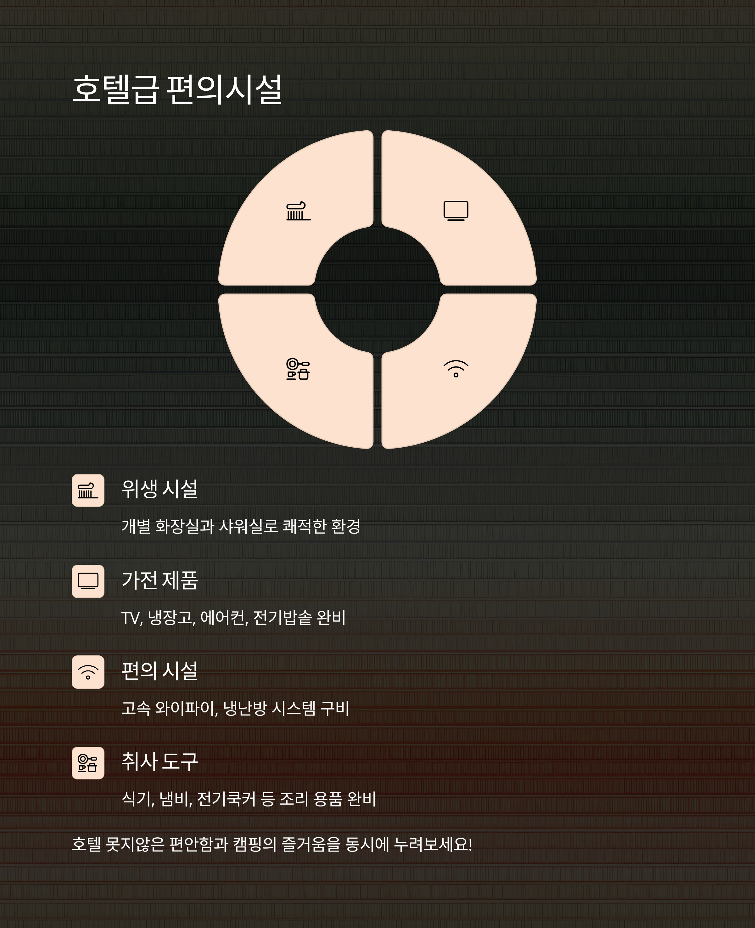| 튤립축제, 편백숲, 계곡, 수영장 연계 가능 | 2~6인용 다양한 텐트, 개별 욕실 및 냉난방 완비 | 가족·연인 모두 만족도 높은 힐링 숙소 |
