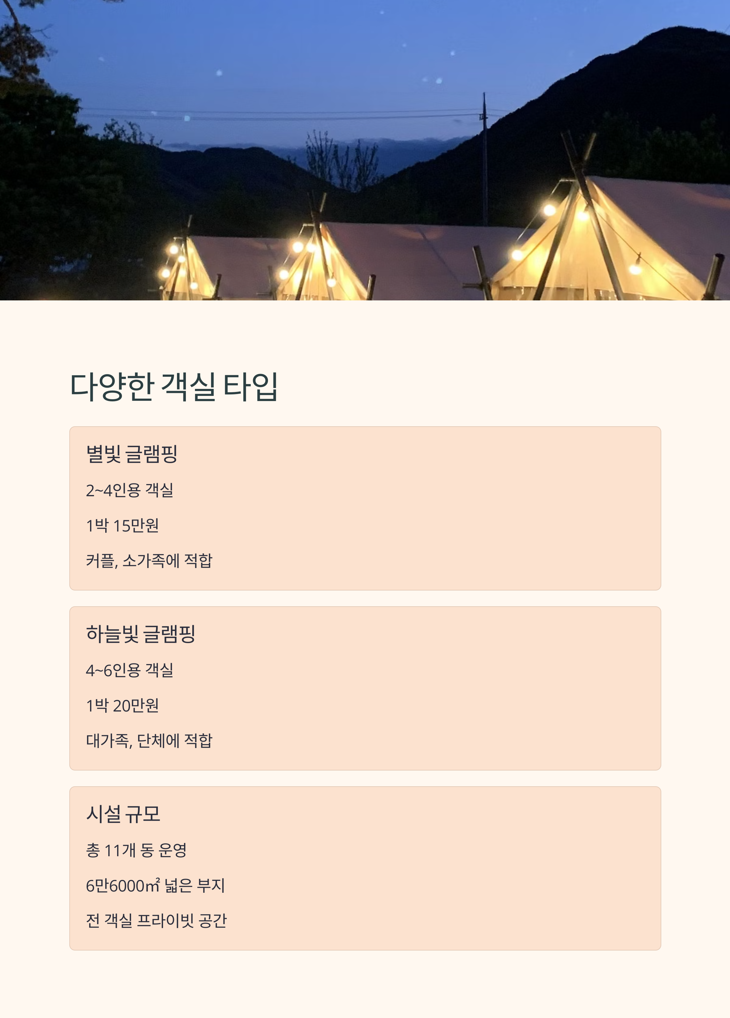 | 구성 | 하늘빛(2~4인), 별빛(4~6인) 글램핑 / 개별 욕실, 냉난방, 와이파이, 바비큐, 취사도구 포함 |