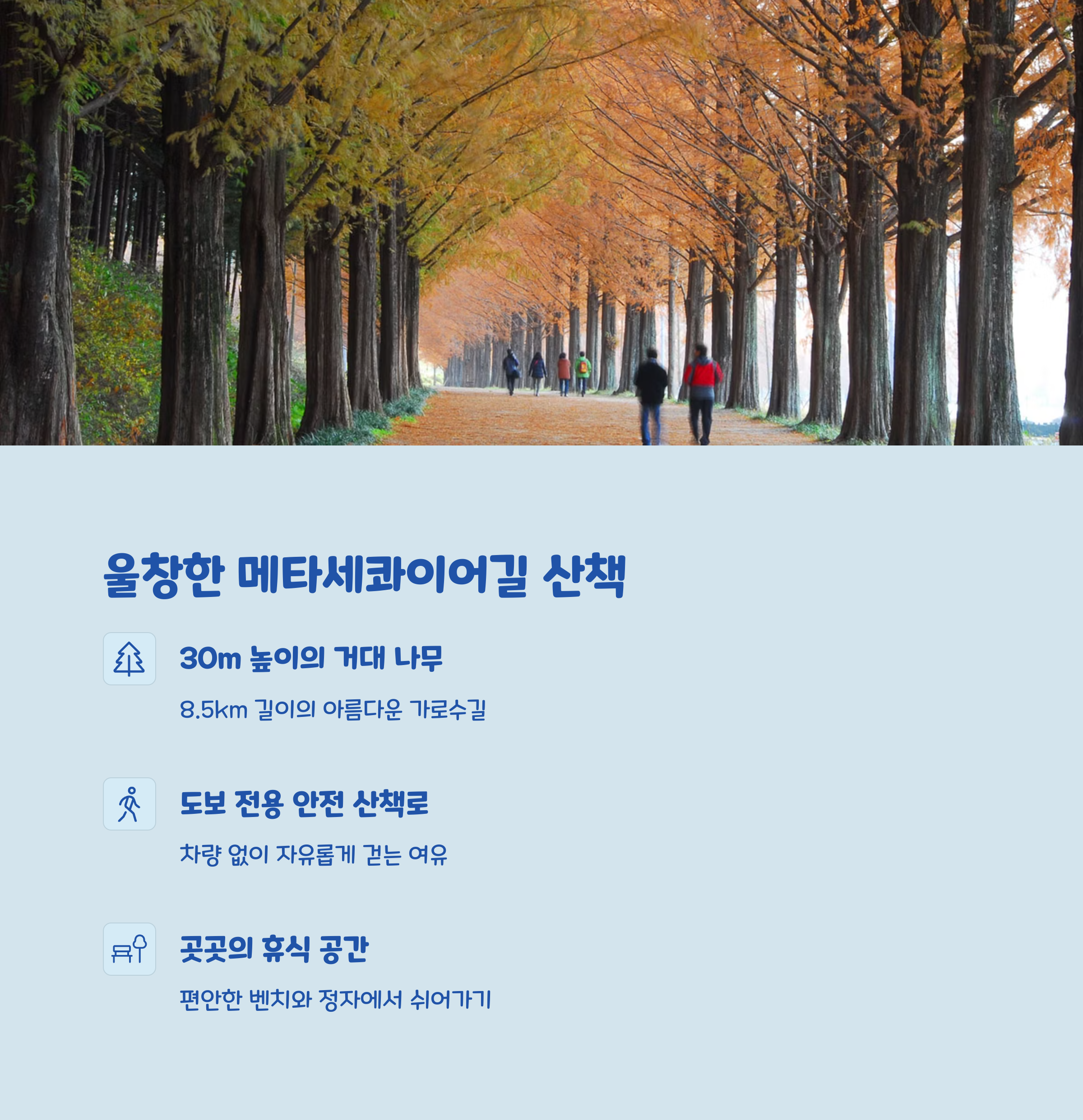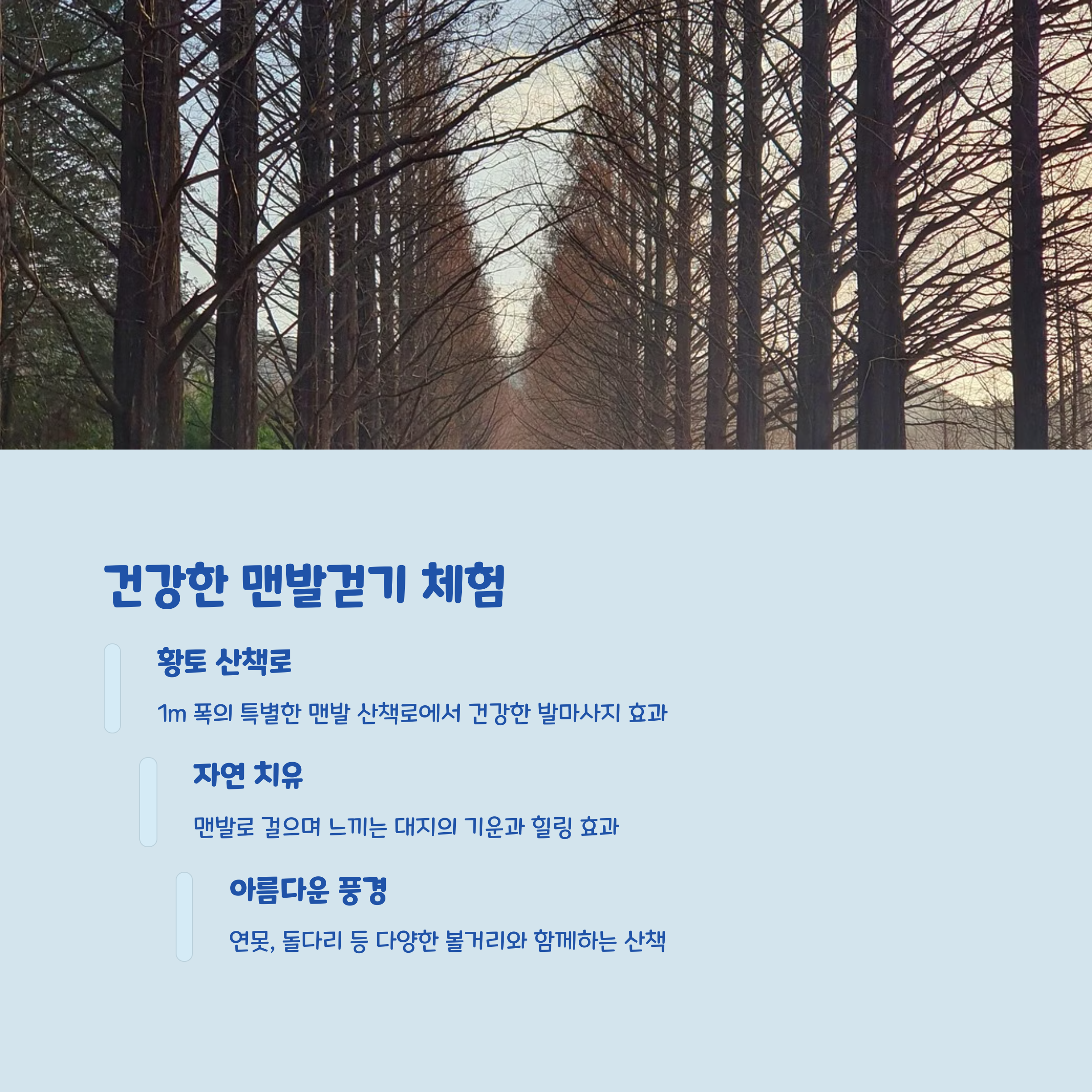 | 주요 특징 | 메타세쿼이아 길과 생태 체험, 맨발걷기 등 자연 친화 |