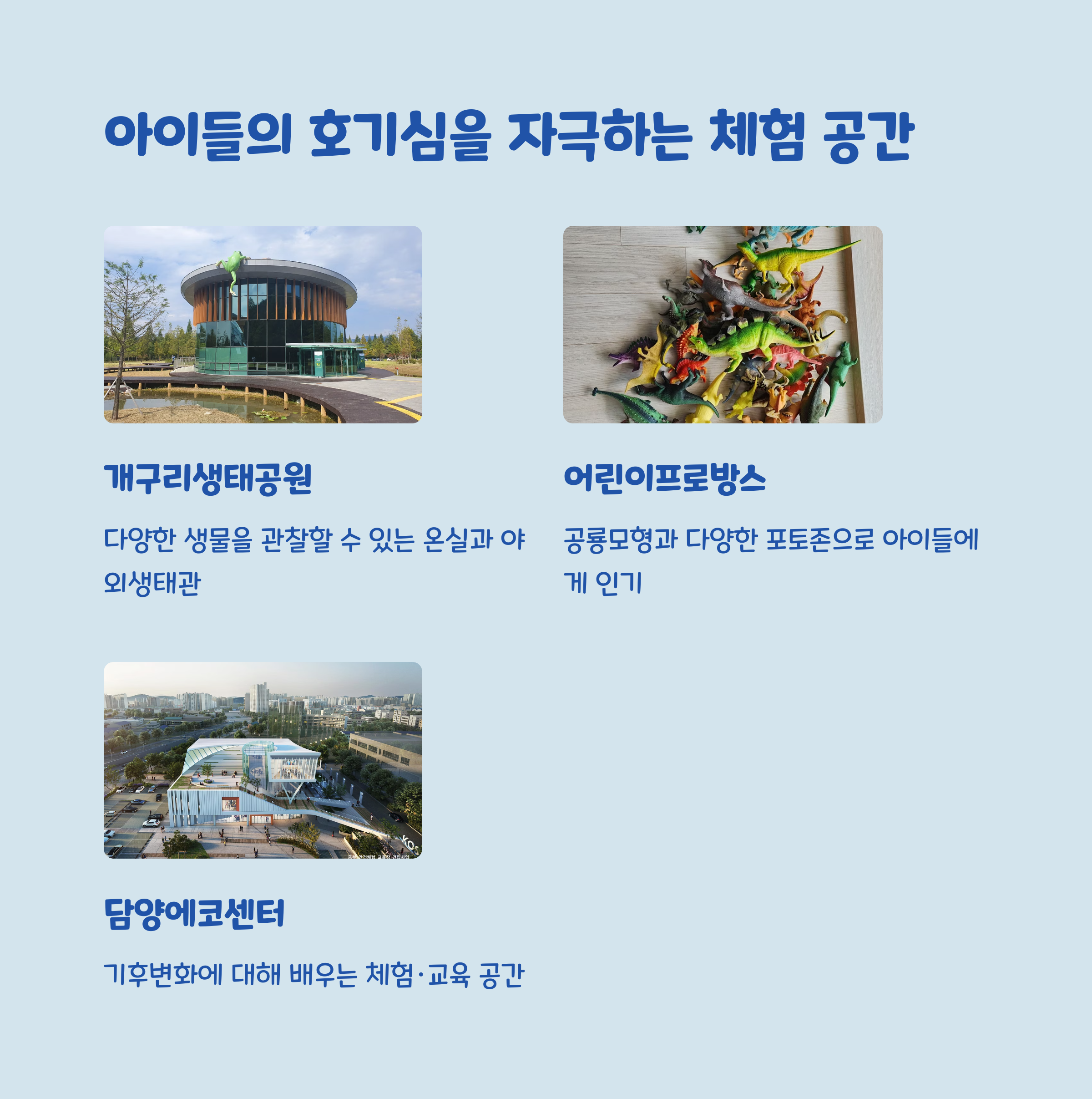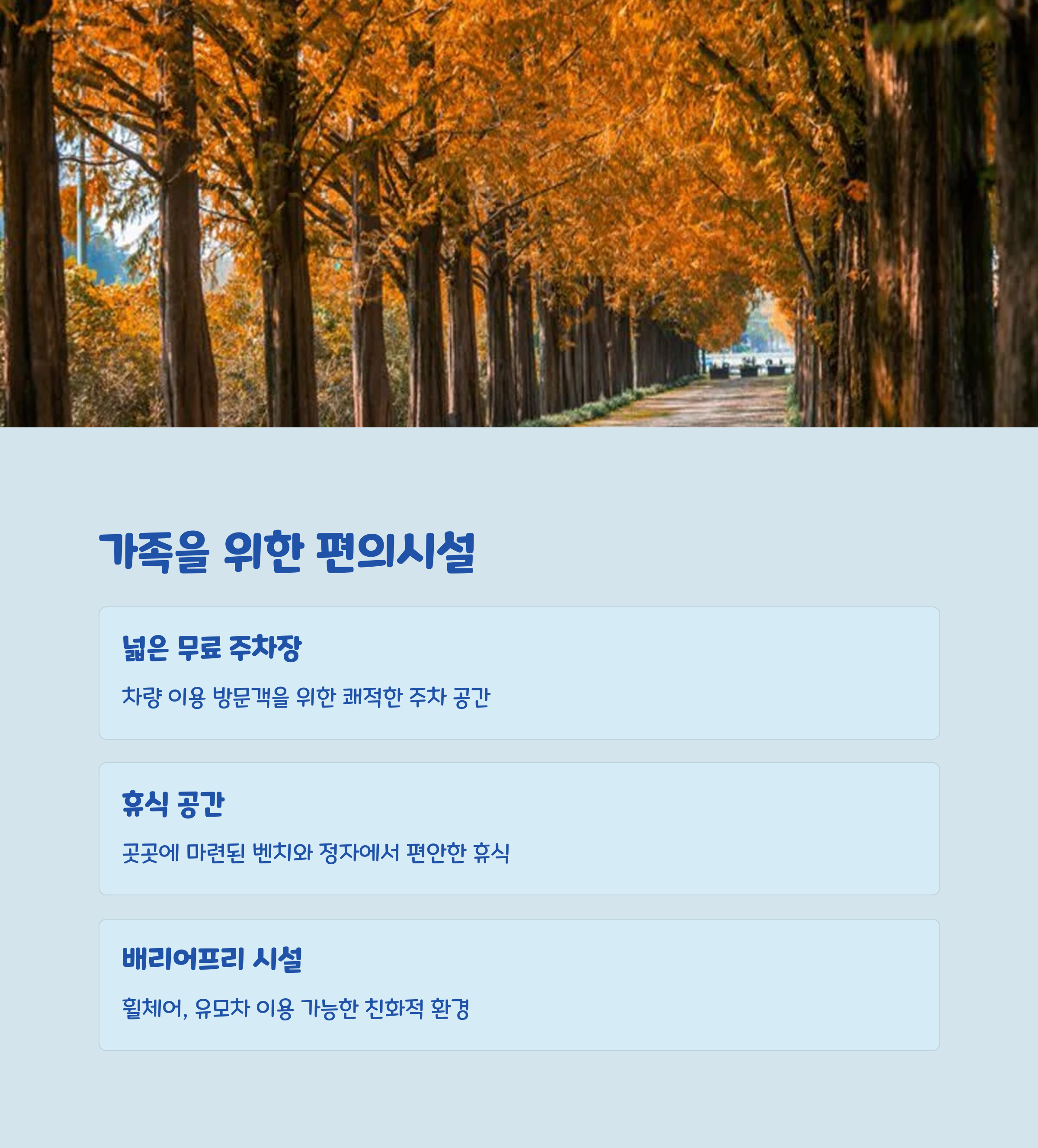 | 벤치·정자 등 가족 휴식공간 다양 | 자연 관찰·교육형 나들이 장소로 인기 | 담양 대표 가족 관광지로 추천 |