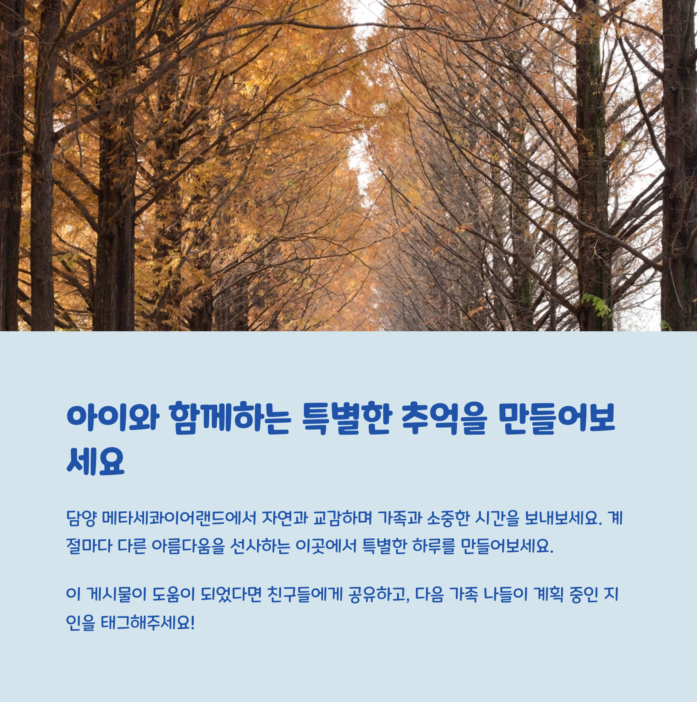 자연과 함께하는 하루를 보내고 싶다면 전남 담양 메타세콰이어랜드는 최고의 선택입니다. 아이들이 즐겁게 뛰놀 수 있는 체험공간과 부모님도 편안히 쉴 수 있는 정비된 환경, 저렴한 입장료까지 더해져 온 가족 모두가 만족하는 여행지를 완성합니다. 봄나들이 장소를 찾고 계신다면 이번 주말, 메타세콰이어랜드로 떠나보세요.