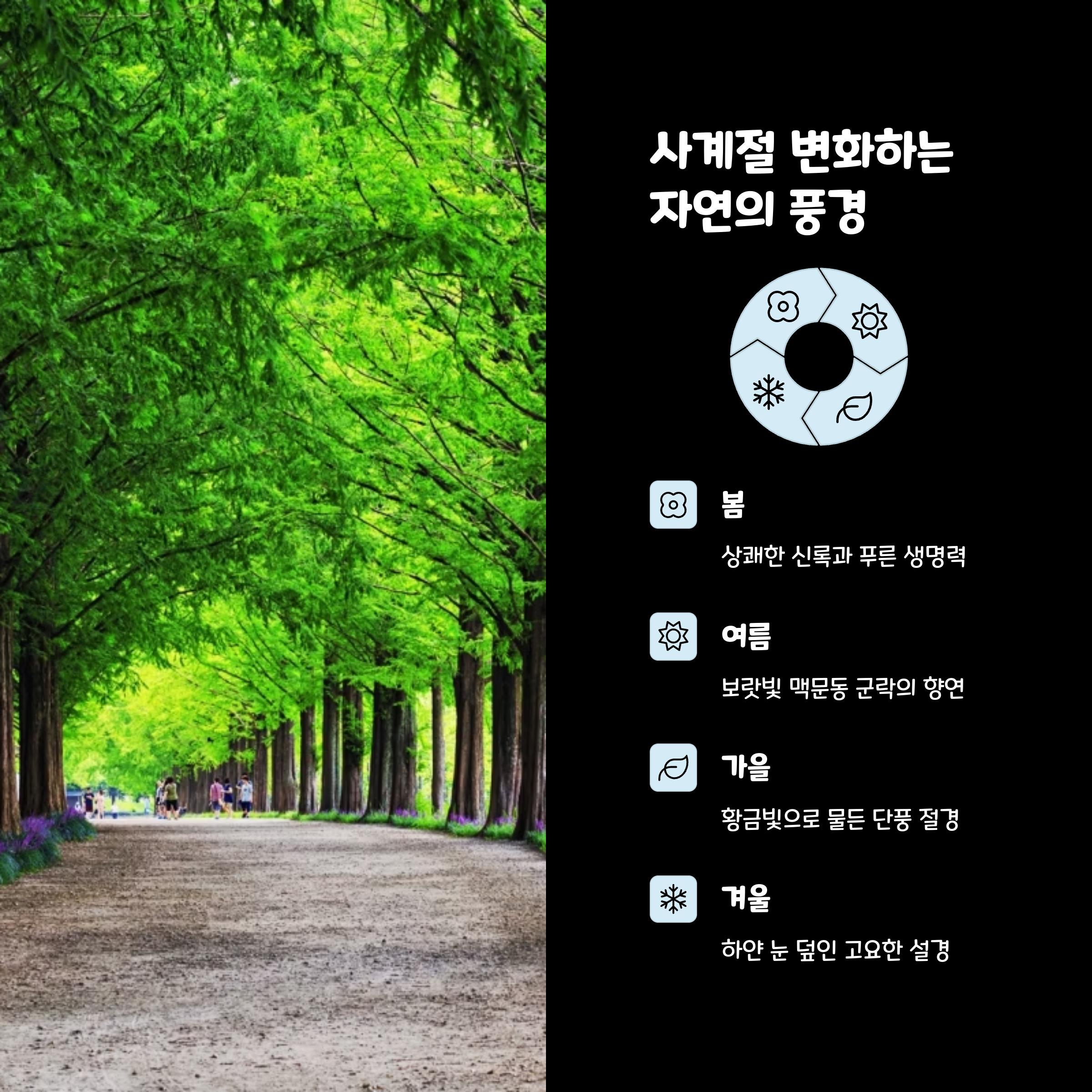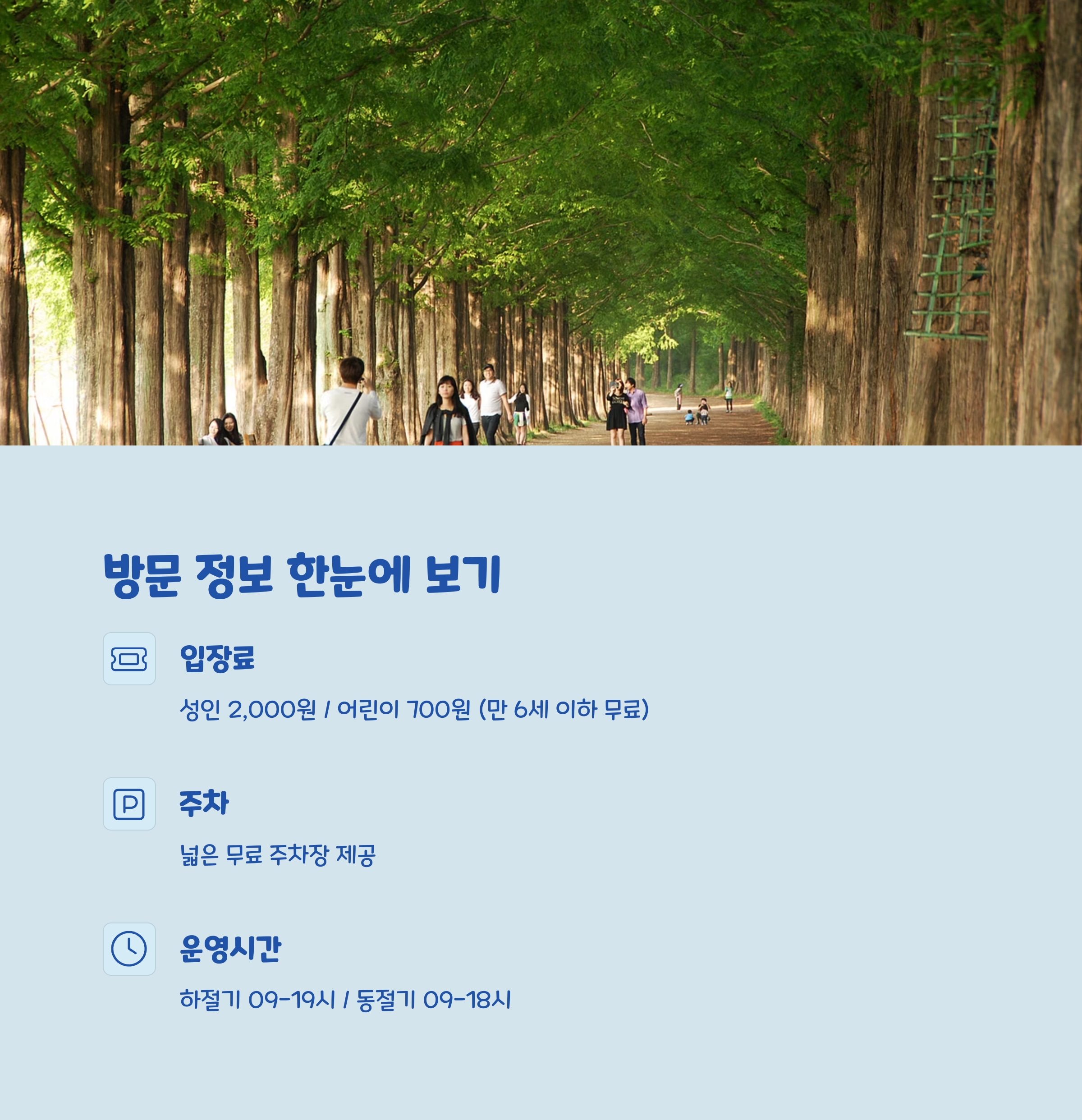 | 메타세콰이어길 | 생태체험공간 | 입장료·주차 |