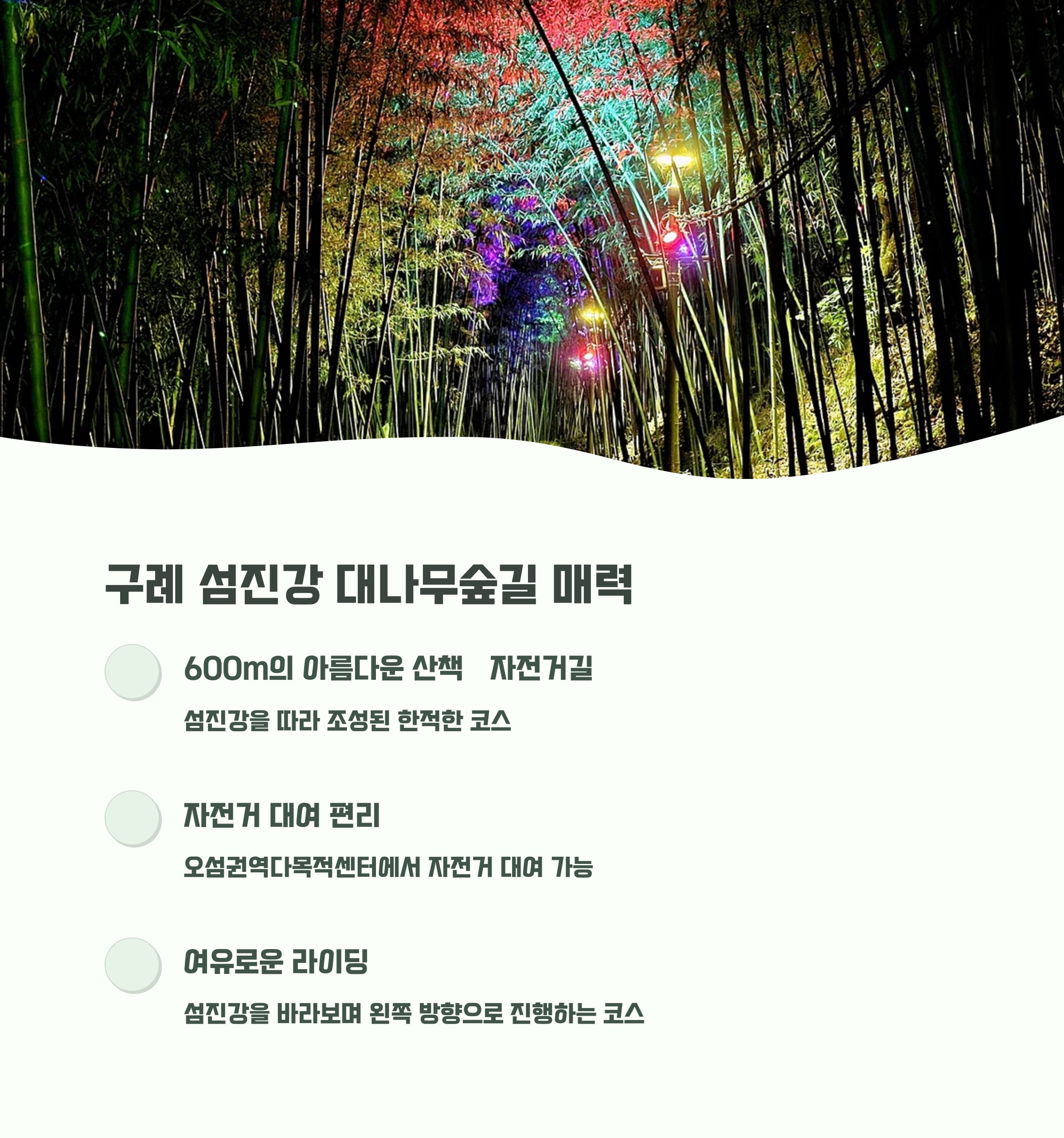 구례의 섬진강 대나무숲길약 600m 구간의 강변 자전거길로, 한적하고 평화로운 분위기에서 지리산 풍경과 섬진강 물빛을 함께 감상할 수 있습니다. 코스 곳곳에는 벤치, 포토존, 나무그네가 설치되어 있어 쉬어가기 좋고, 봄에는 벚꽃길과 대나무숲이 어우러져 아름다운 풍경을 연출합니다.