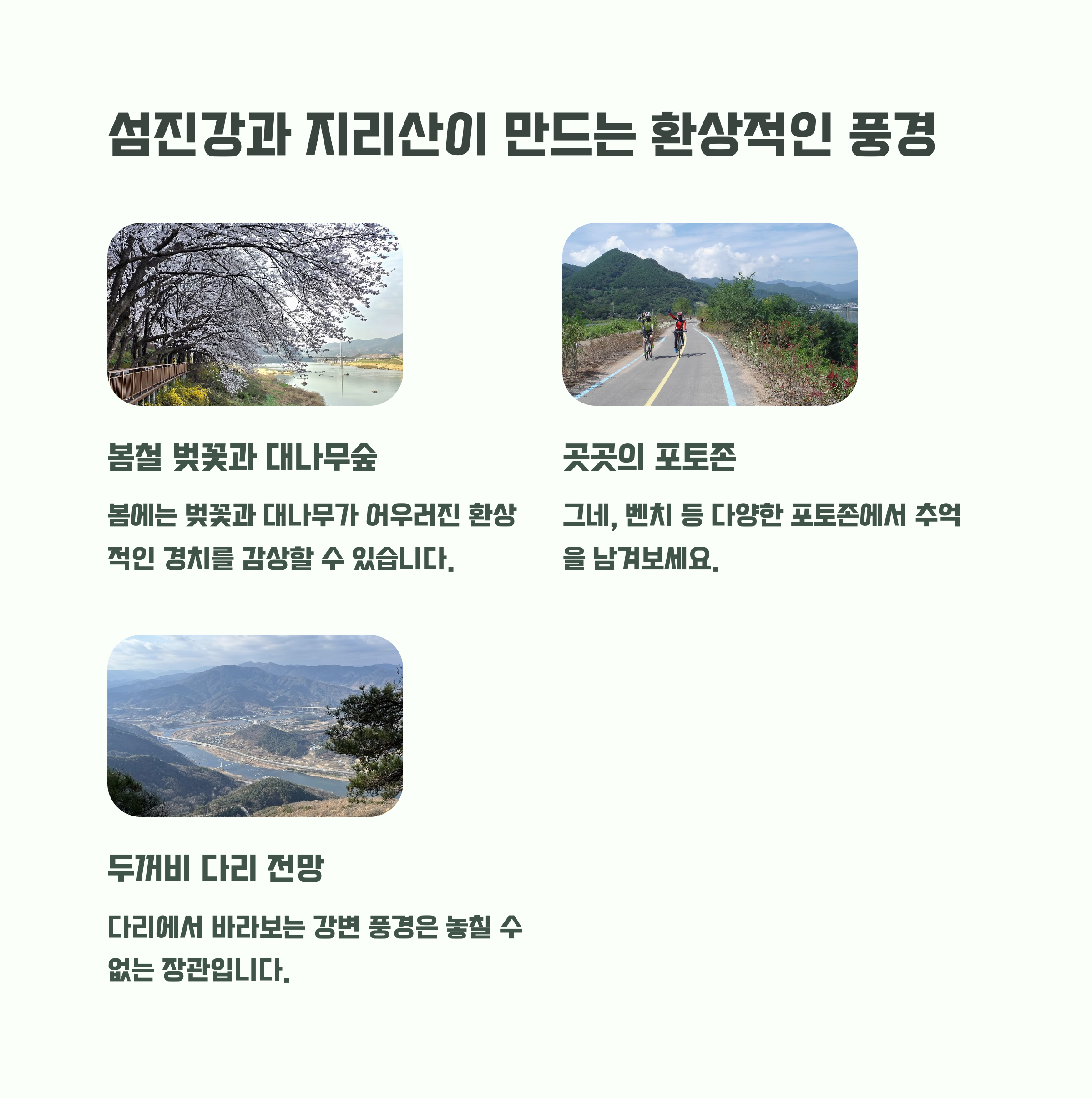 구례의 섬진강 대나무숲길은 약 600m 구간의 강변 자전거길로, 한적하고 평화로운 분위기에서 지리산 풍경과 섬진강 물빛을 함께 감상할 수 있습니다. 코스 곳곳에는 벤치, 포토존, 나무그네가 설치되어 있어 쉬어가기 좋고, 봄에는 벚꽃길과 대나무숲이 어우러져 아름다운 풍경을 연출합니다.